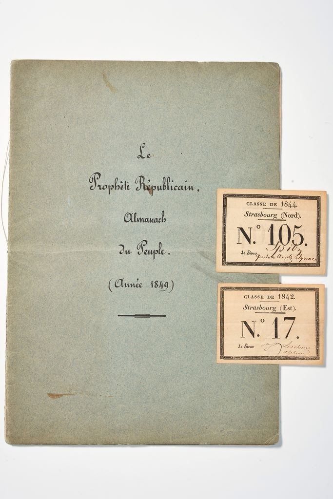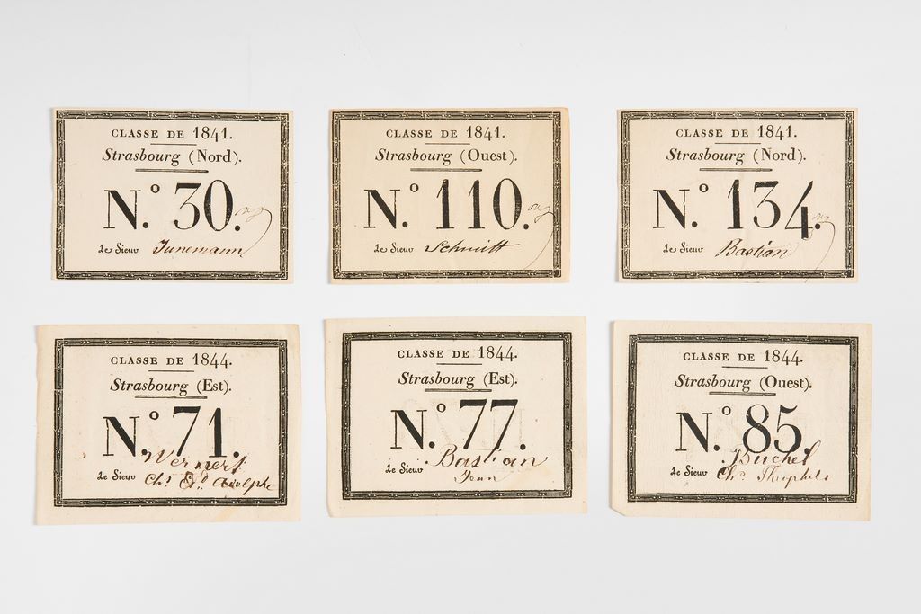 Louis-Philippe, Strasbourg Lot de 8 tickets de tirage au sort, imprimés : 3 de la Classe de 1841, Strasbourg (Nord) N° 30, le Sieur Junemann ; Strasbourg (Ouest) N°110, le Sieur Schmitt ; Strasbourg (Nord) N° 134, le Sieur Bastian ; 1 de la Classe 1842, Strasbourg (Est) N°17, le Sieur Lescheme Alphonse ; 4 de la Classe 1844, Strasbourg (Est) N°71, le Sieur Wernert Chs Erd Adolphe ; N°77, le Sieur Bastian Jean ; Strasbourg (Ouest) N°85, le Sieur Buchel Chs Théophile ; N°105, le Sieur Spitz Gustave André Ignace. BE On joint le tirage « Le Prophète Républicain, Almanach du Peuple (année 1849)