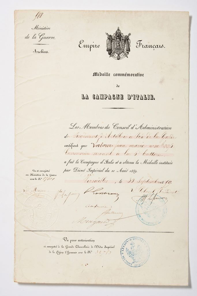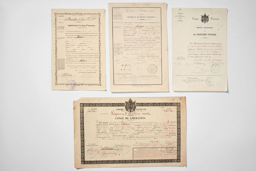 Second Empire, Versailles Souvenirs de Latour Jean Marie, Canonnier servant à la 5è Batterie du Régiment d’Artillerie de la Garde : Lettre de la Médaille commémorative de la Campagne d’Italie. Versailles le 30 septembre 1859. Signatures, cachets à l’encre et sec ; Certificat de Bonne Conduite du Régiment d’Artillerie monté de la Garde Impériale. Fait à Versailles, le 31 Décembre 1861. Signatures, cachet à l’encre ; Congé de Libération au Régiment d’Artillerie monté de la Garde Impériale. Fait à Versailles, le Trente-un Décembre 1861. Signatures, cachets à l’encre, vignette aux Grandes Armes impériales.