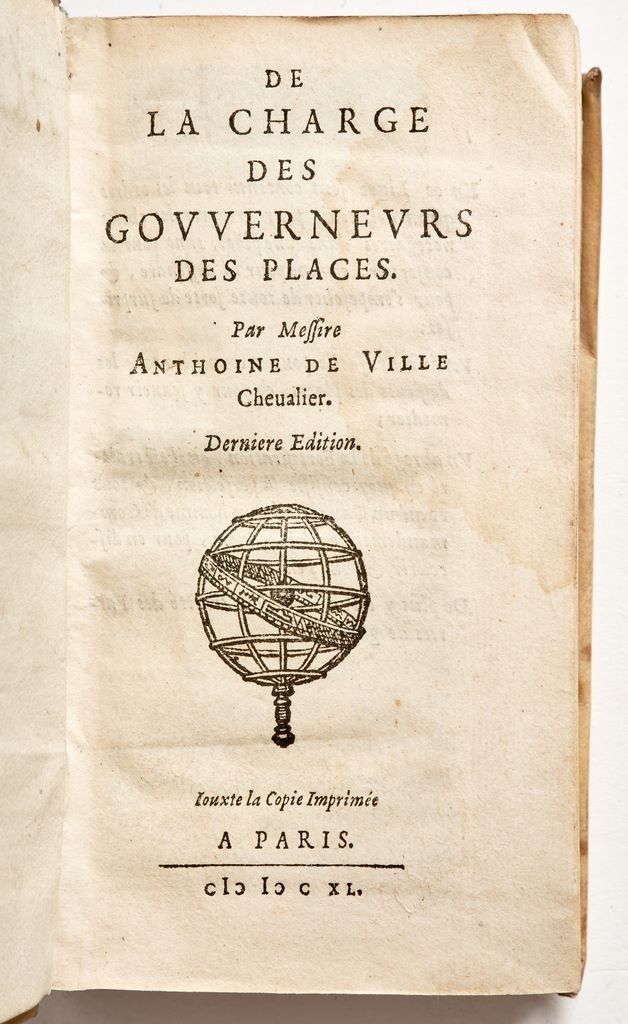 Antoine de VILLE. De la charge des gouverneurs des places. Paris, 1640. In-12. Vélin à recouvrement. 9 planches dans le texte. Ex libris comte Louis de Vaulchier