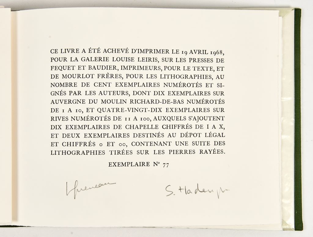 Galerie Louise Leiris, 1968 - Edition originale illustrée de cet ouvrage magnifiquement illustré de 10 lithographies originales par Sébastien Hadengue. En feuilles sous couverture rempliée et double emboitage. Parfaite condition, un des 90 exemplaires numérotés sur rives, signé par l’auteur et l’illustrateur au justificatif. Ouvrage devenu très rare.