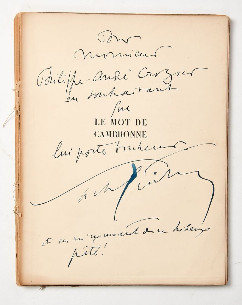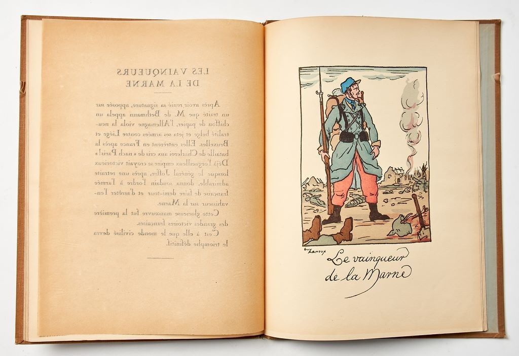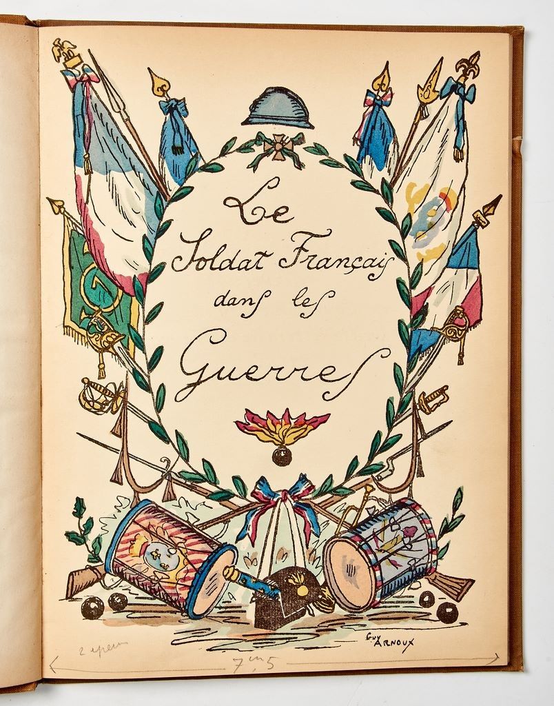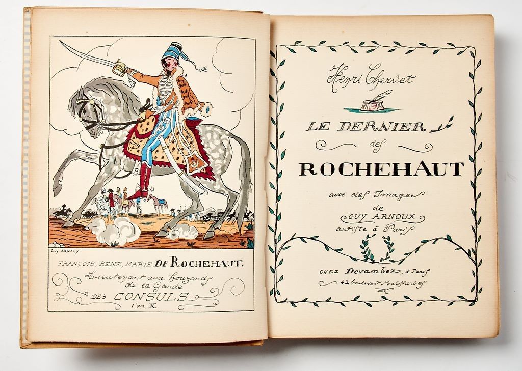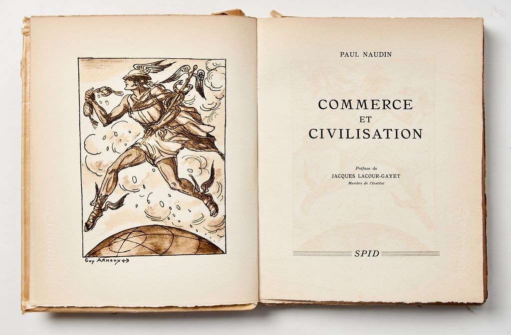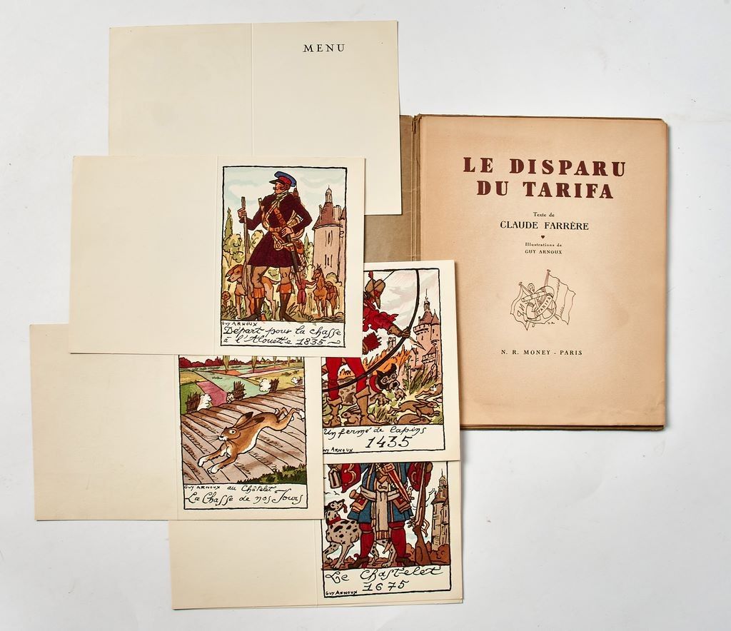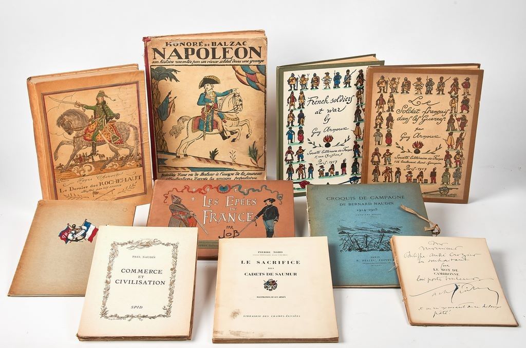 Un bel ensemble de 5 ouvrages illustrés divers, dont Le disparu du Tarifa par Claude Farrère illustré par Guy Arnoux truffé d’une série de 6 menus illustrés par Arnoux, Le mot de Cambronne par Sacha Guitry enrichi d’un bel envoi autographe signé de Guitry et un dessin en couleurs d’Arnoux (premier plat de couverture manquant), Commerce et civilisation par Paul Naudin illustré par Guy Arnoux et numéroté sur Johannot, Le sacrifice des cadets de Saumur par Pierre Nord illustré par Arnoux, Napoléon son histoire racontée par un vieux soldat dans une grange par Honoré de Balzac illustré et numéroté.