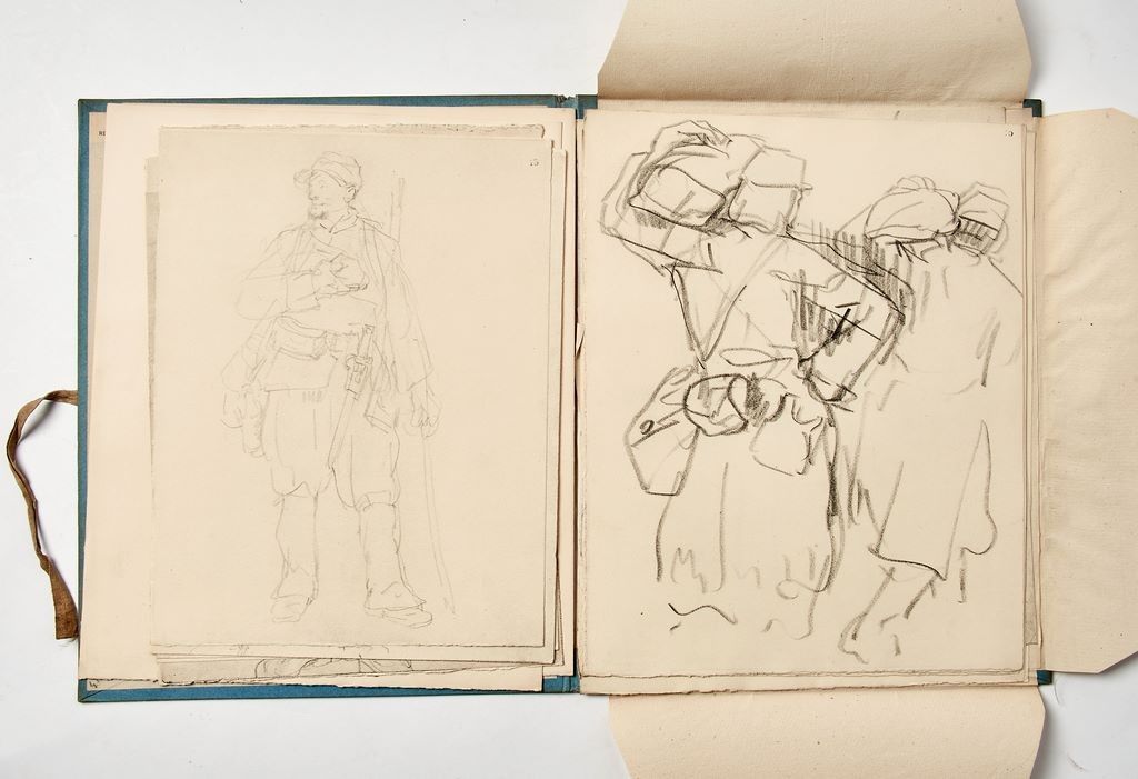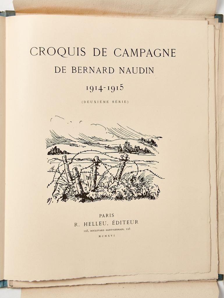 Croquis de campagne de Bernard Naudin 1914-1915 (deuxième série) chez Helleu à Paris, 1916, bel album de planches de dessins de soldats de la guerre 14-18, sous cartonnage chemise à lacets, bon état général, frottements et défauts mineurs à la chemise sans gravité.