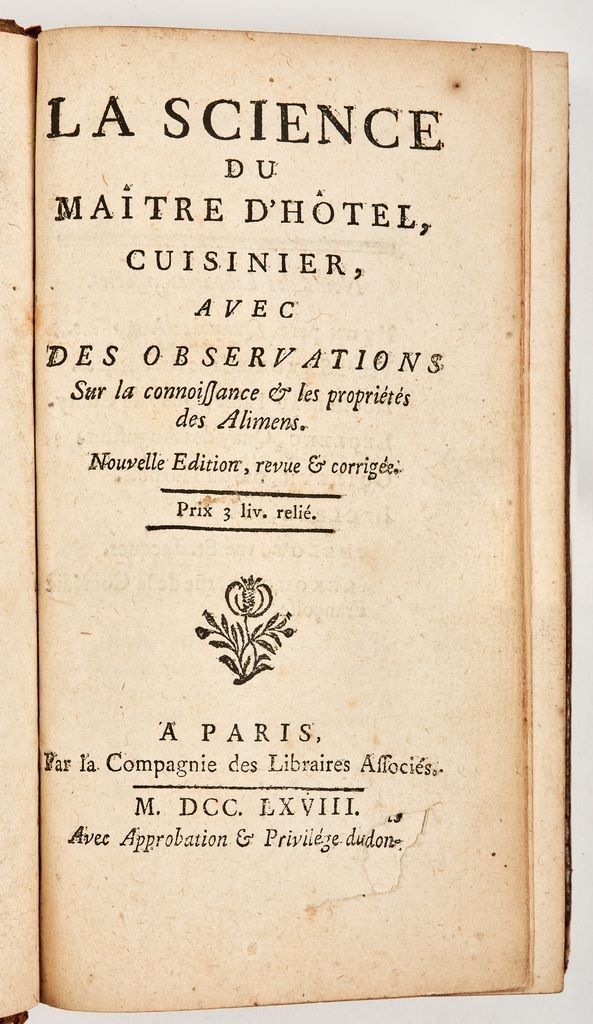 Compagnie des Libraires, Paris, 1768 - Seconde édition augmentée de ce rare recueil de menus proposant plus de 800 recettes, souvent très élaborées, bien plus que la célèbre cuisinière bourgeoise de 1746 par le même.