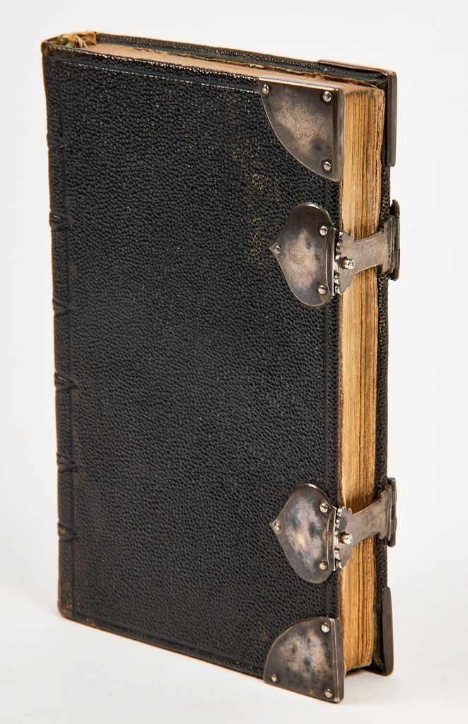 Intéressant spécimen de reliure en galuchat du 17ème siècle, avec fermoirs et coins en argent, le destinataire de ce présent ou commanditaire de la reliure est indiqué gravé à l’intérieur des fermoirs, on y lit le nom de Jeanne Rigaut. Tranches dorées et dos à faux nerfs resté muet : reliure austère, d’une grande simplicité et élégance réalisée avec à partir de matériaux nobles.