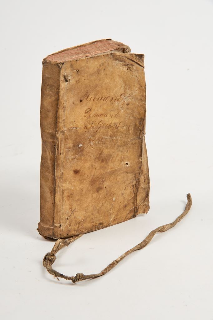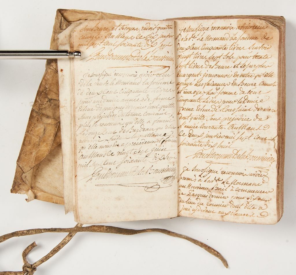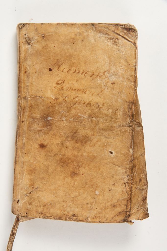 Une sorte de livre de comptes de 30pp. manuscrites, le reste en feuillets vierges, sous reliure d'époque en plein vélin, un peu sali sans gravité, dos en partie détaché et défauts aux contreplats.