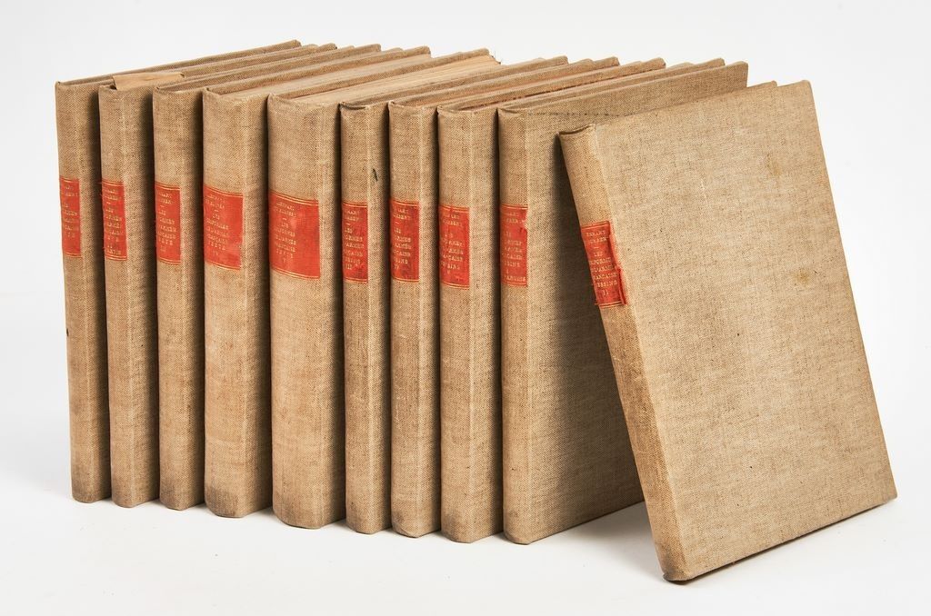 Très bel état, quelques défauts mineurs, intérieurs également très bien conservés sans rousseurs ou salissures, quelques décharges de couleurs sur la page en regard, pour certaines planches, très rares et minimes néanmoins, quelques traces d'humidité aux 2 premières pages et aux 15 dernières pages du dernier volume, traces marginales signifiées néanmoins par correction. Exceptionnel ensemble de planches en couleurs : 82 dans le premier volume (dont 20bis et 46bis), 80 dans le deuxième volume, 62 dans le troisième, 87 dans le quatrième et enfin 84 dans le cinquième et dernier volume, soit un total de 395 planches, bien complet.