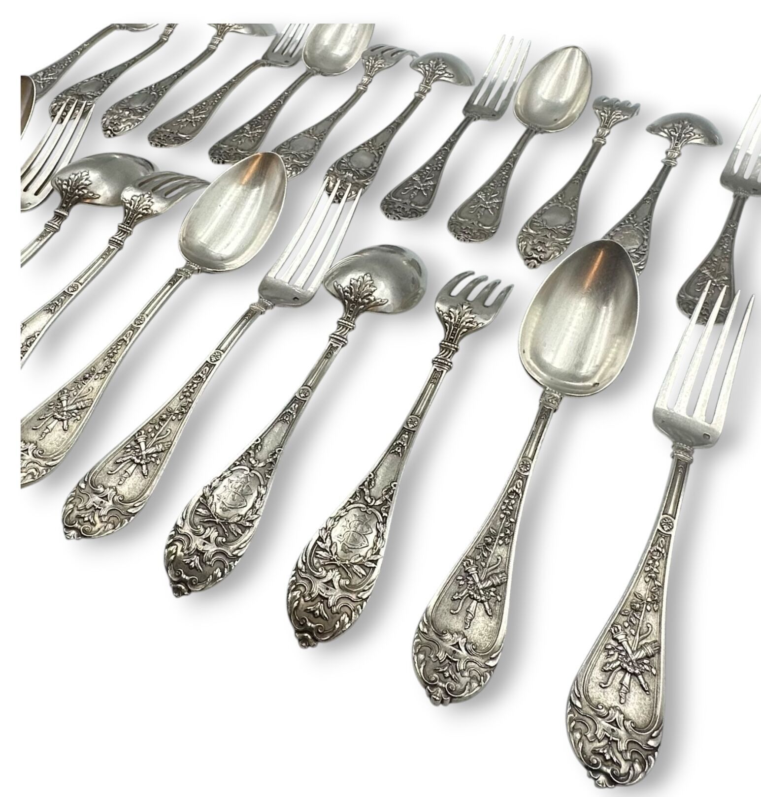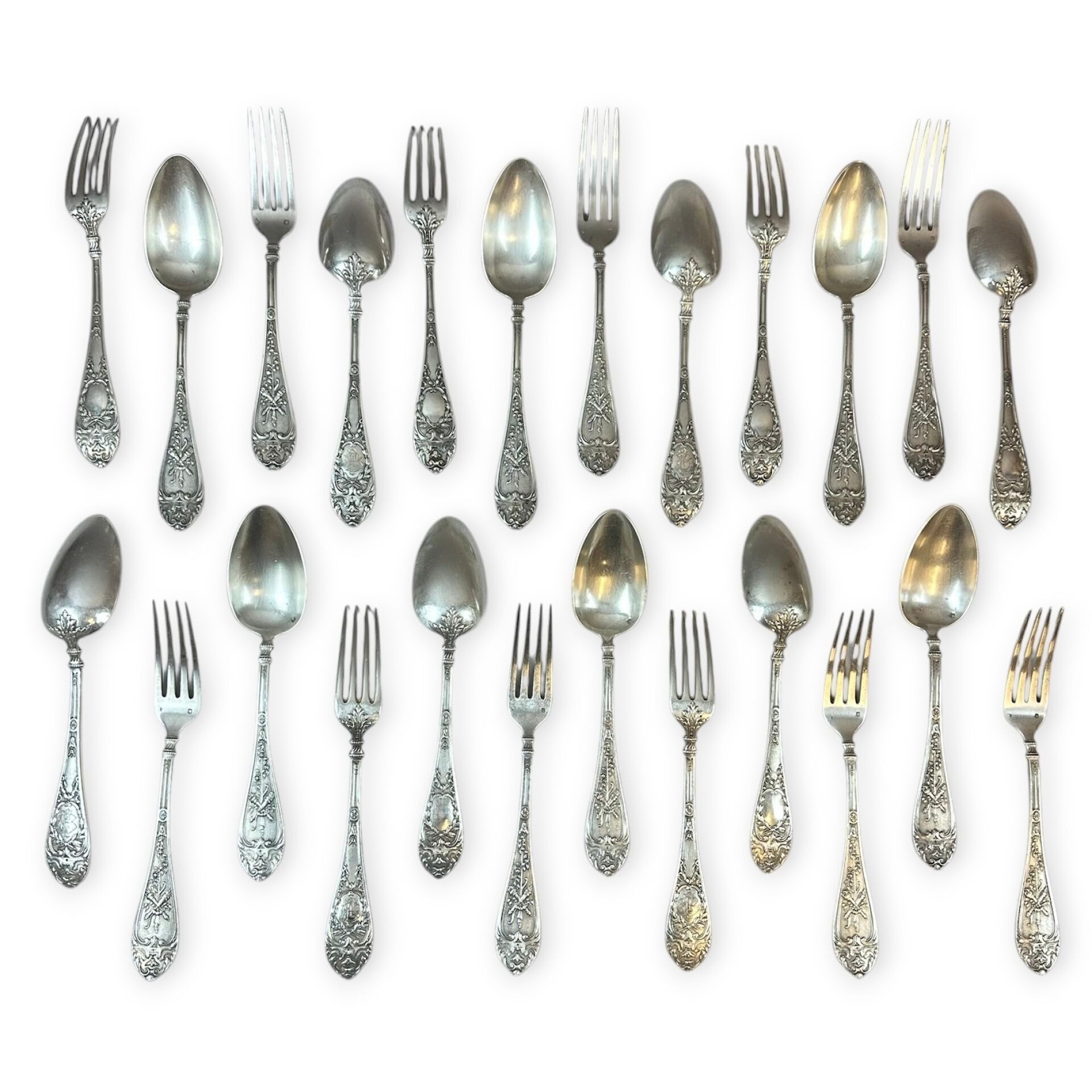 12 couverts de table en argent (950) à riche décor végétal, de rinceaux et d'un trophée.