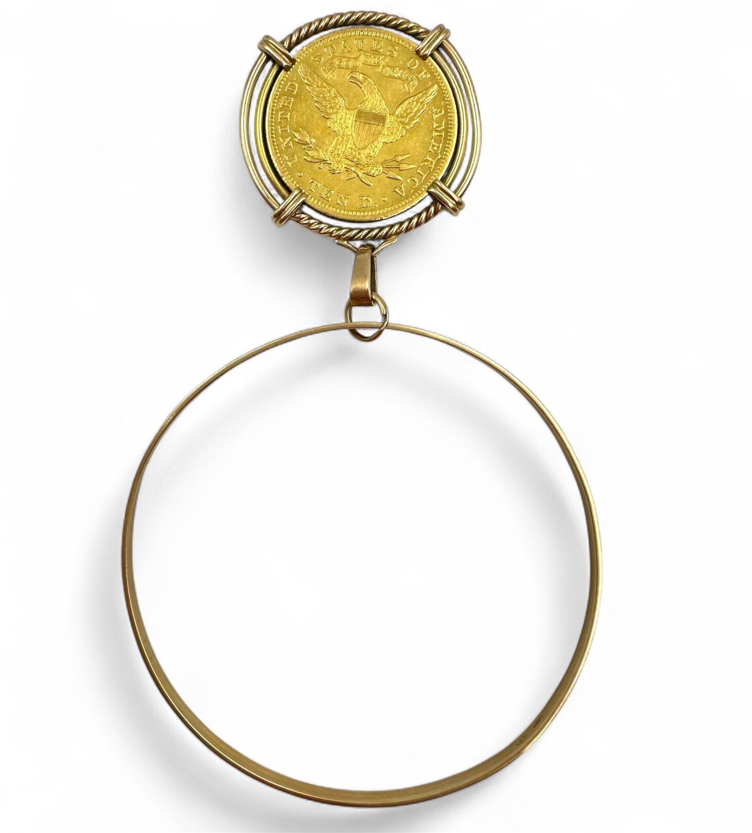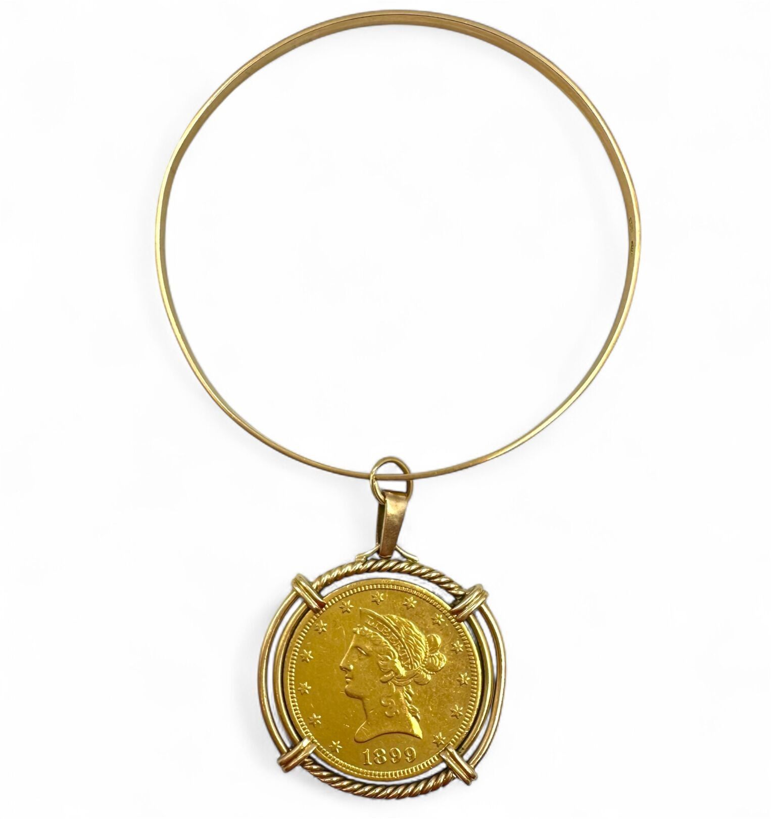 Bracelet jonc en or jaune (750) retenant une pièce en or Liberty 1899.