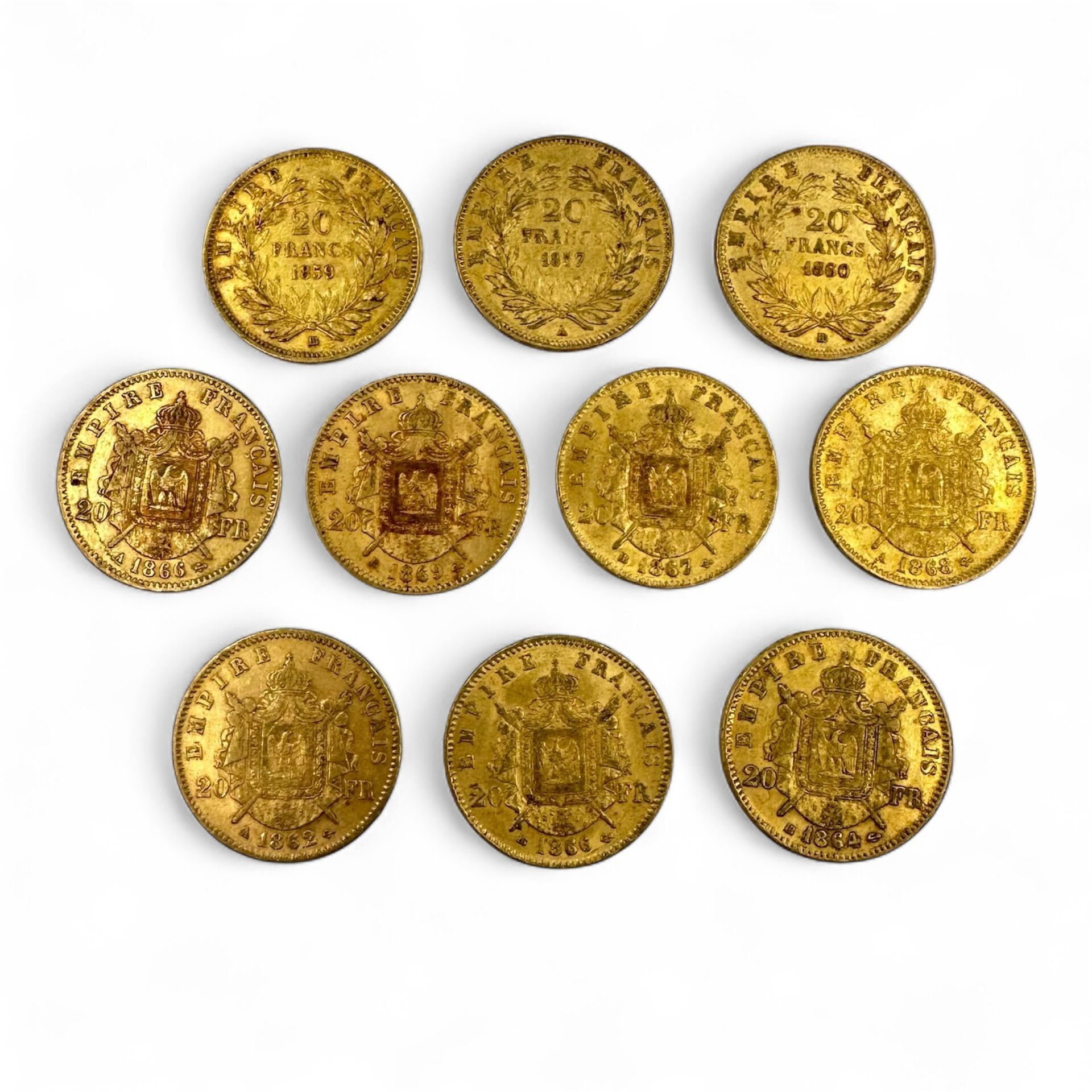 Lot de 10 pièces de 20 francs or Napoléon III "tête nue" (x3) 1857 A, 1859 BB et 1860 BB et "tête laurée" (x7) 1862 A, 1864 BB, 1866 A, 1866 BB, 1867 BB, 1868 A et 1869 BB.
