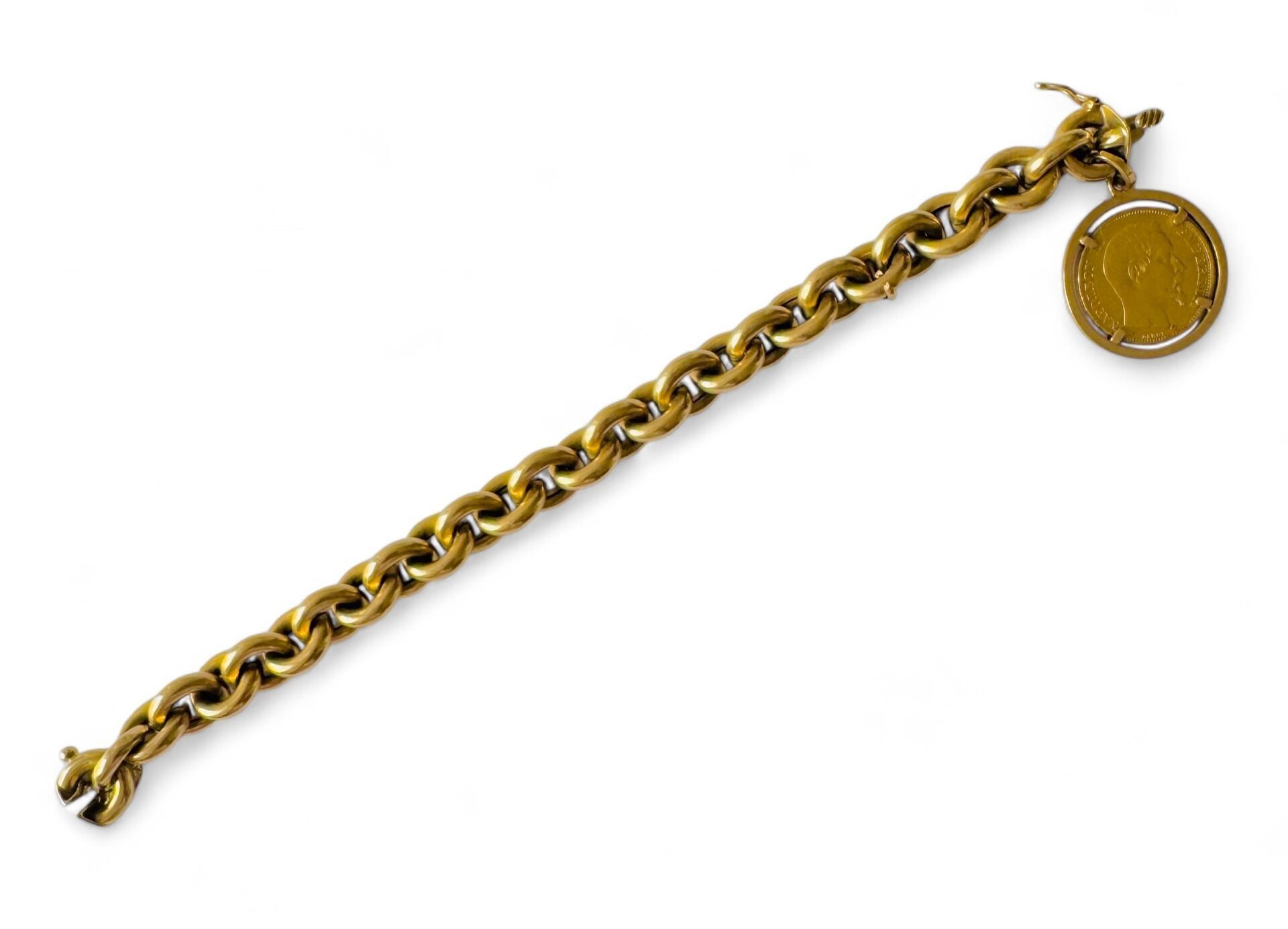 Bracelet en or jaune (750) à maille jaseron retenant une pièce de 20 francs or Napoléon III "Tête nue" 1859 A.