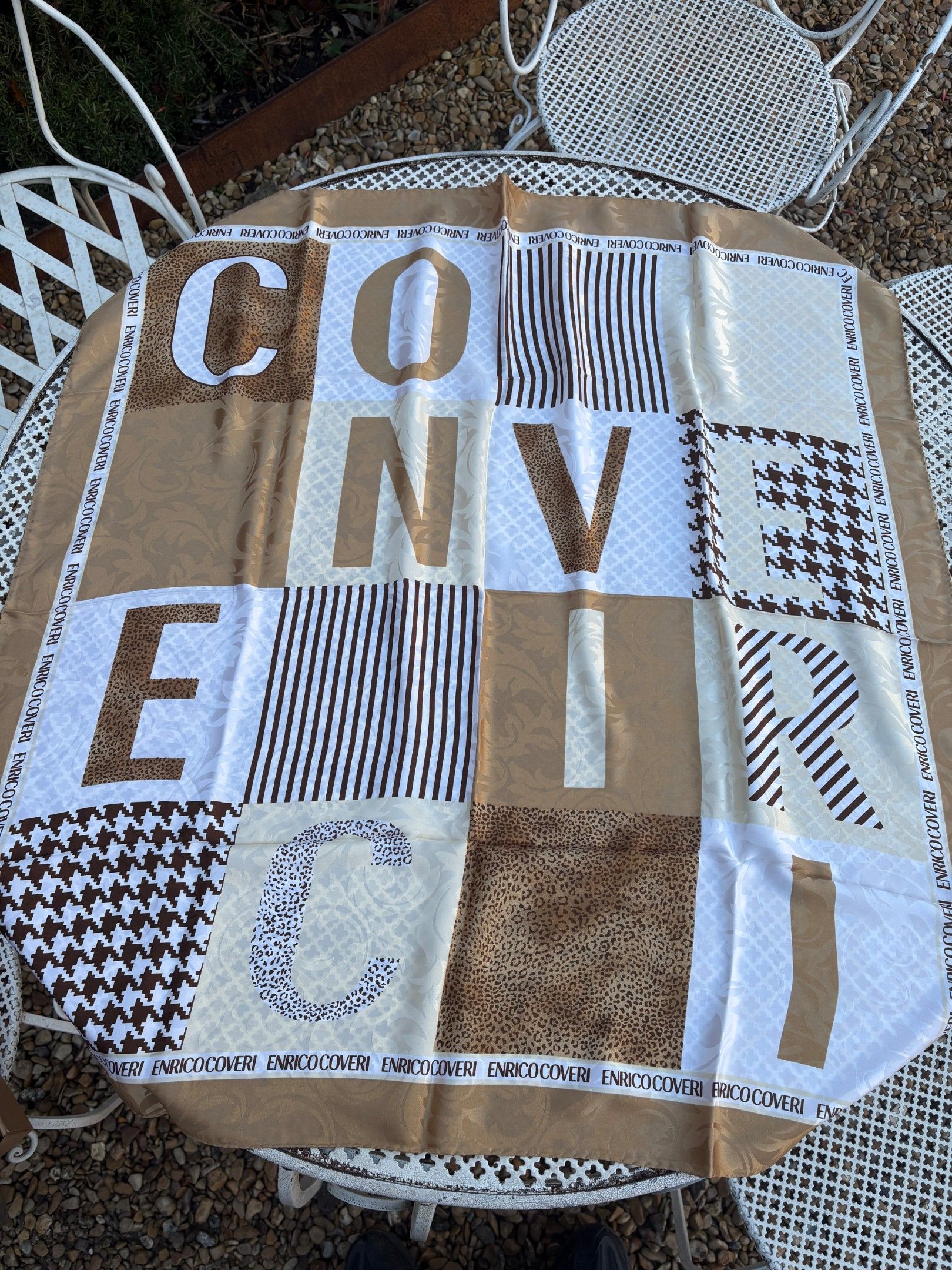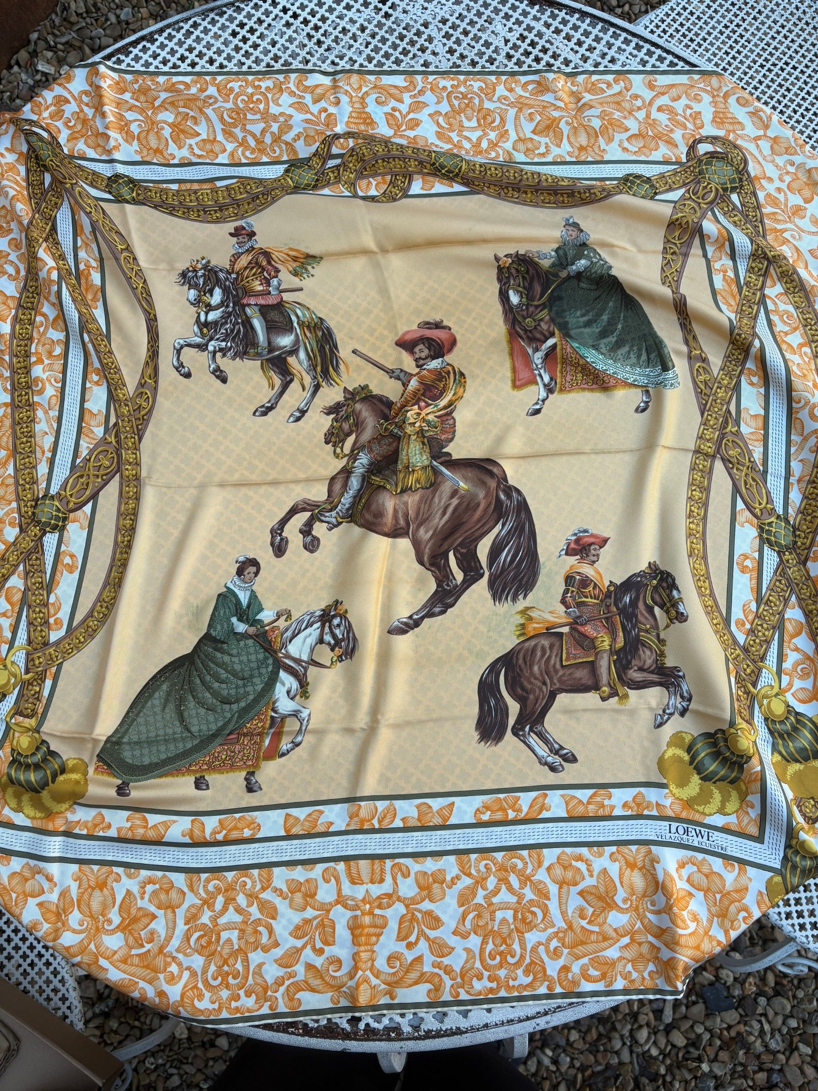 Réunion de trois carrés de soie, Dont Jean Patou, Loewe (modèle Velasquez Ecuestre), Enrico Coveri En l'état
