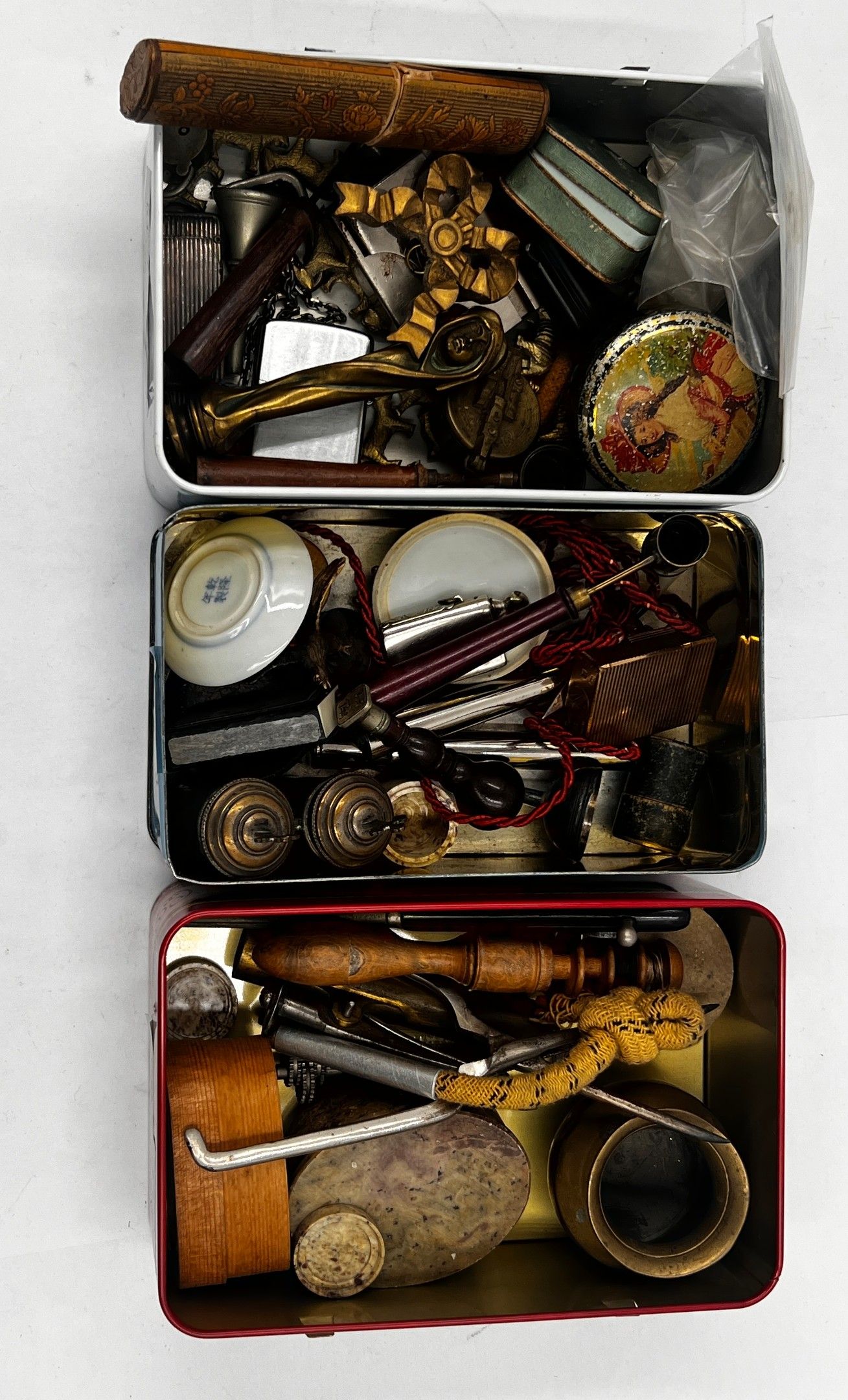Réunion d'objets de vitrine dont : sceaux, briquet Dupont, poids, boîte couverte Trois boîtes En l'état