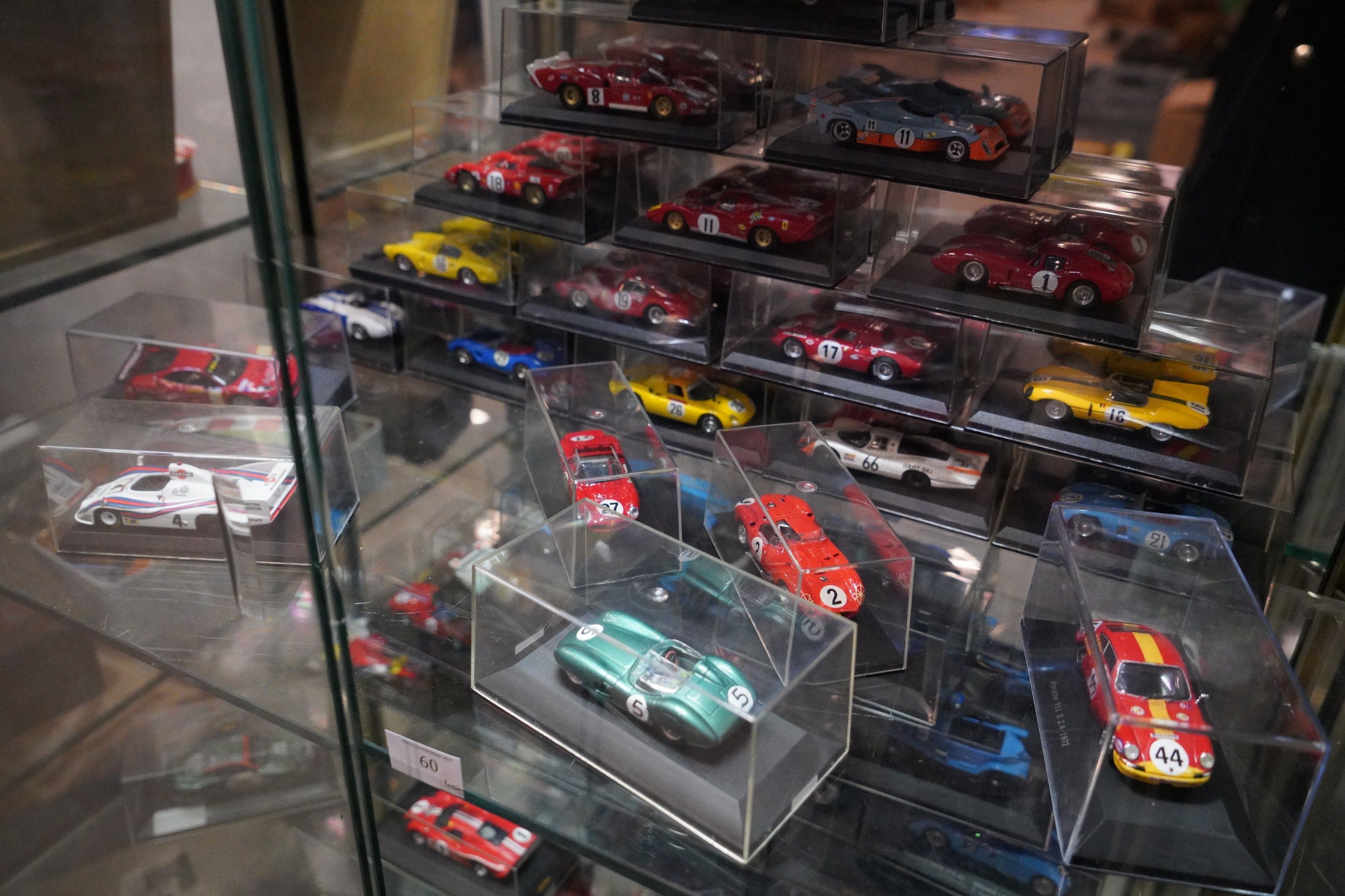 Réunion de 21 automobiles de courses miniatures dont Porsche, Ferrari, Maserati et Aston Martin DBR1 Roy Salvatori et Carrol Shelby (Vitesse 1/43e, numérotée 1494/4500).