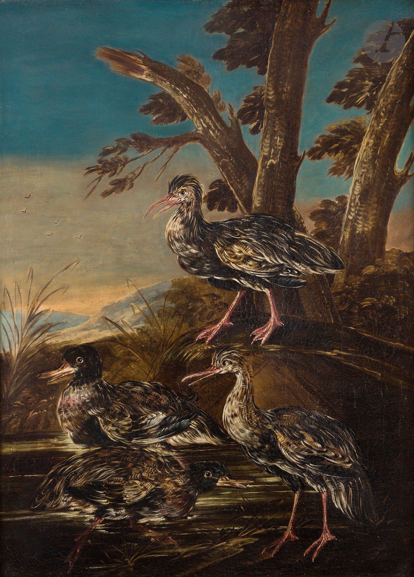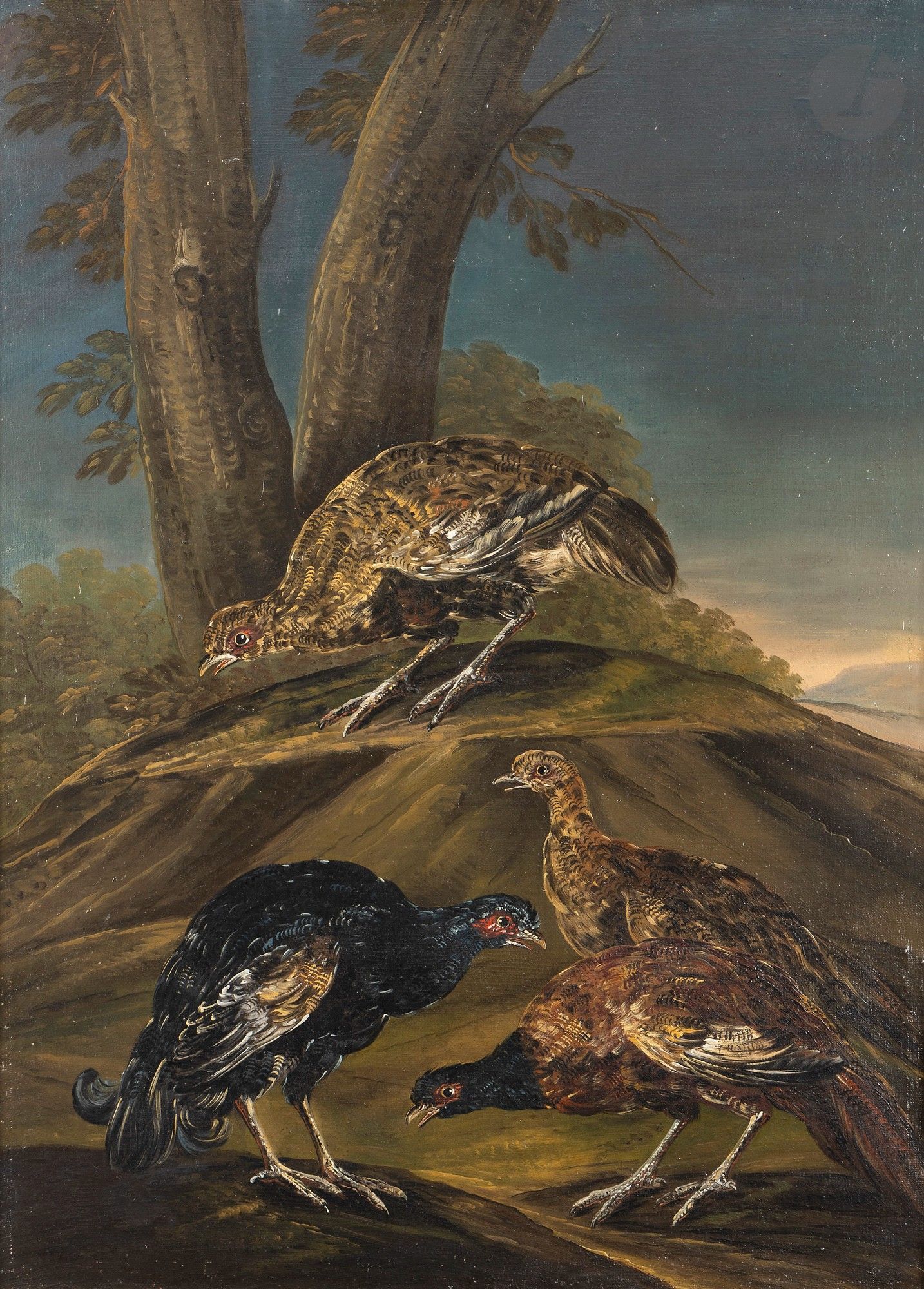 Colverts, faisans et oiseaux de basse-cour dans un paysage