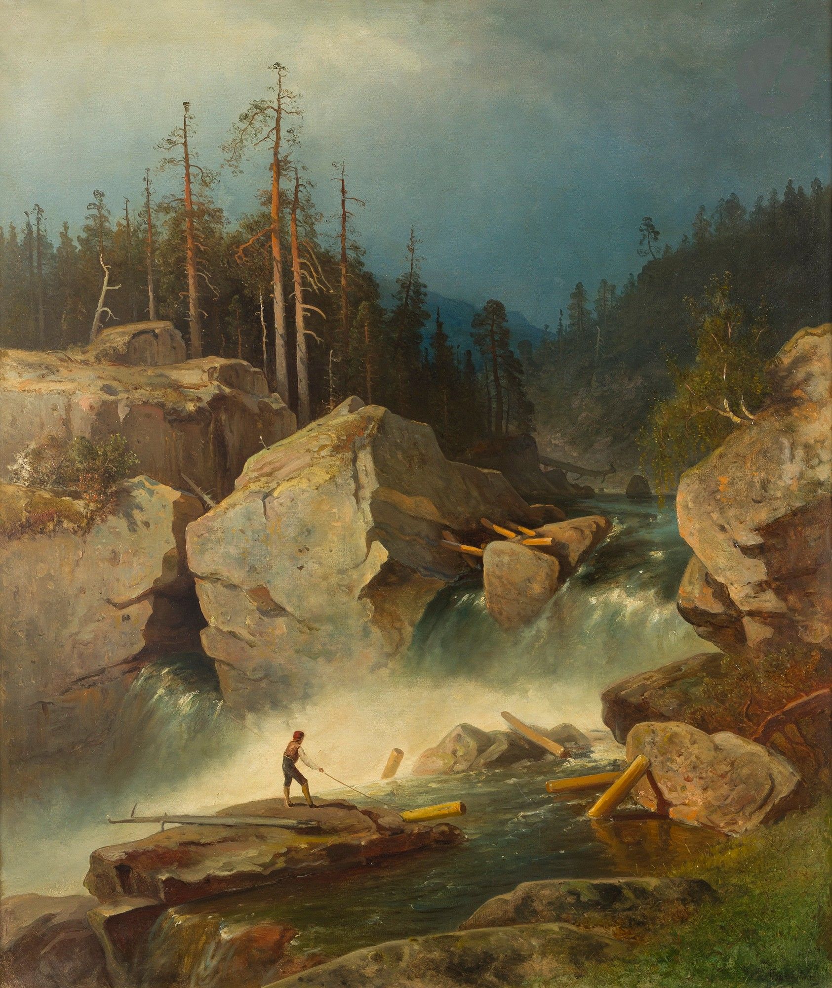 Peder Cappelen THURMANN (1839-1919) Chute d'eau au personnage Huile sur toile 107 x 91 cm