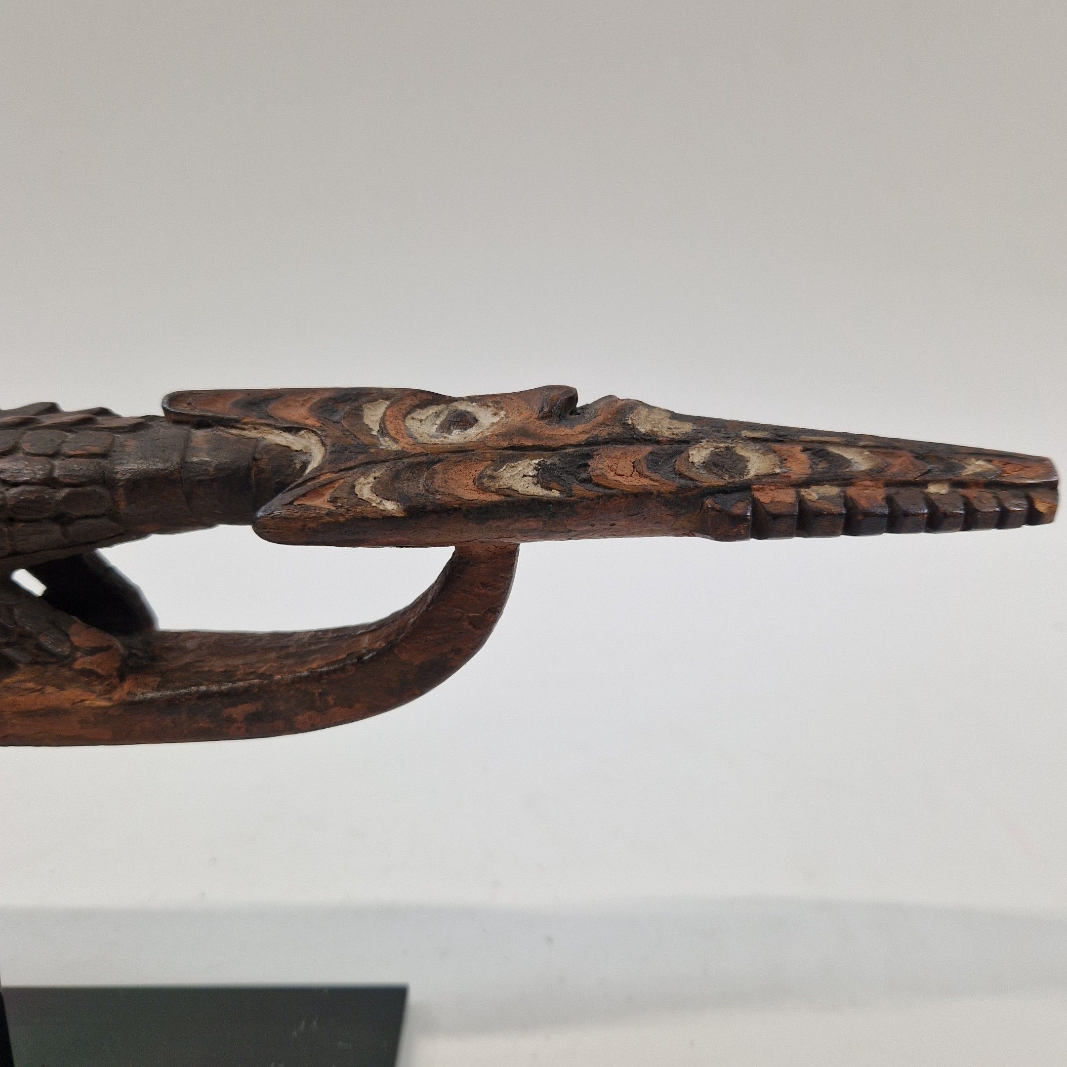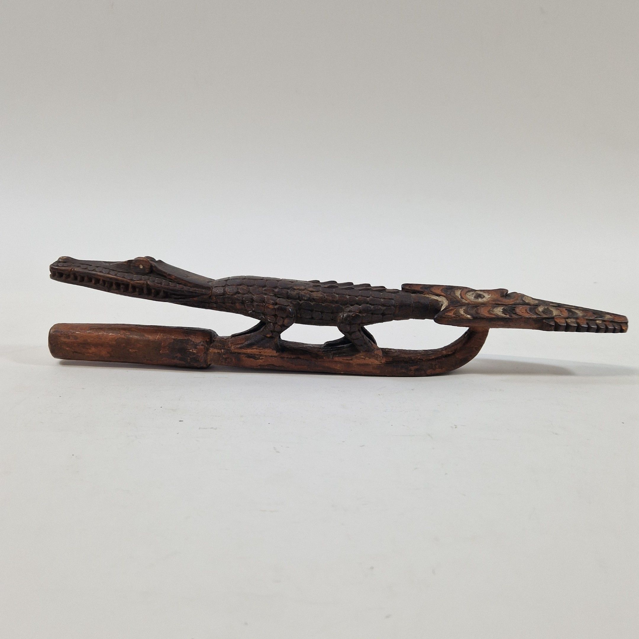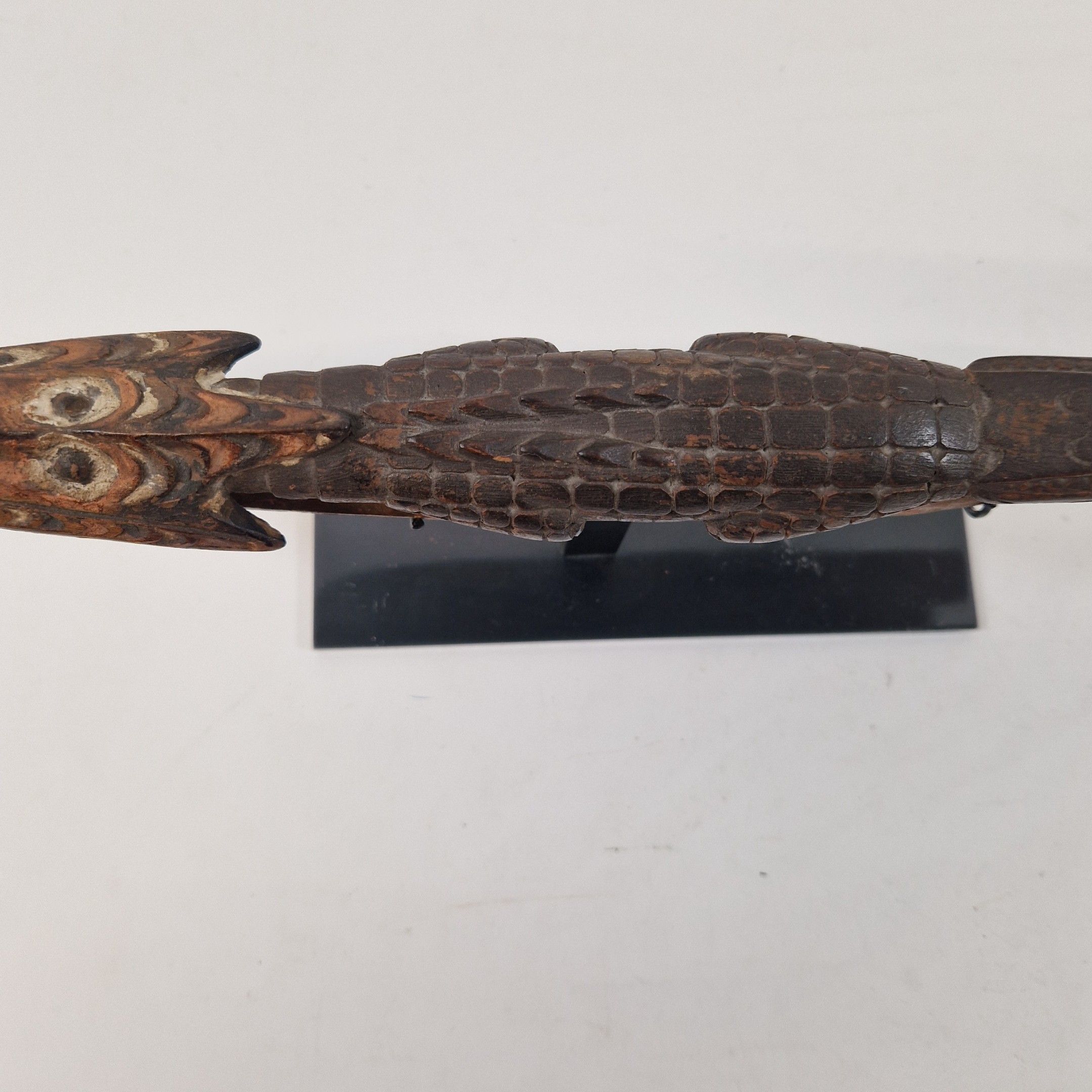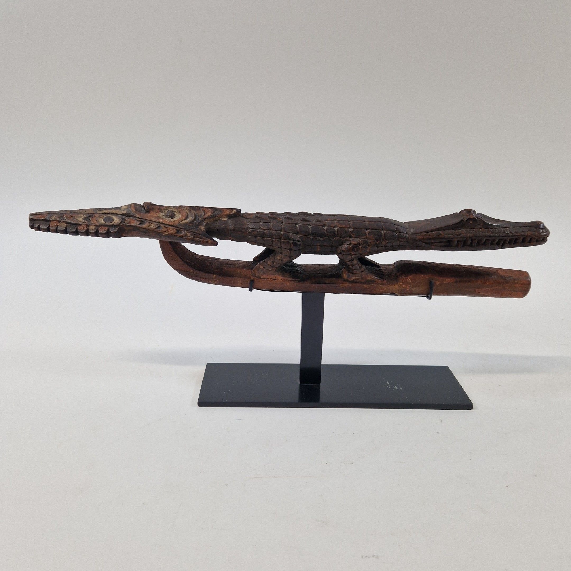 Bouchon de flûte sacrée en bois, originaire du Moyen Sépik, décoré d'un crocodile au traitement réaliste, avec de nombreux détails : écailles, dents, pupilles, etc. Rehaussée d’une polychromie ocre, la queue de l’animal se prolonge par une autre tête de crocodile, traitée ici de manière stylisée, elle-même surmontée d’un visage humain.