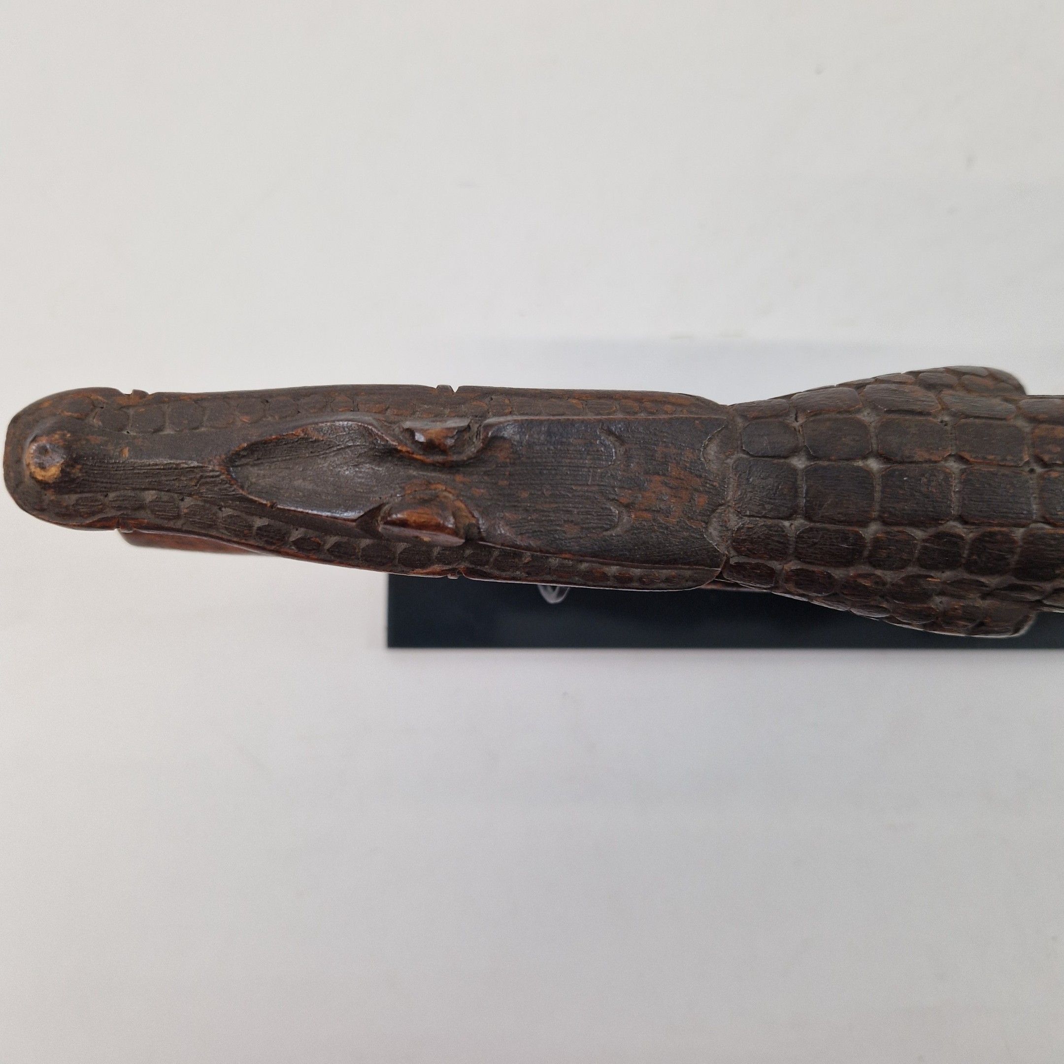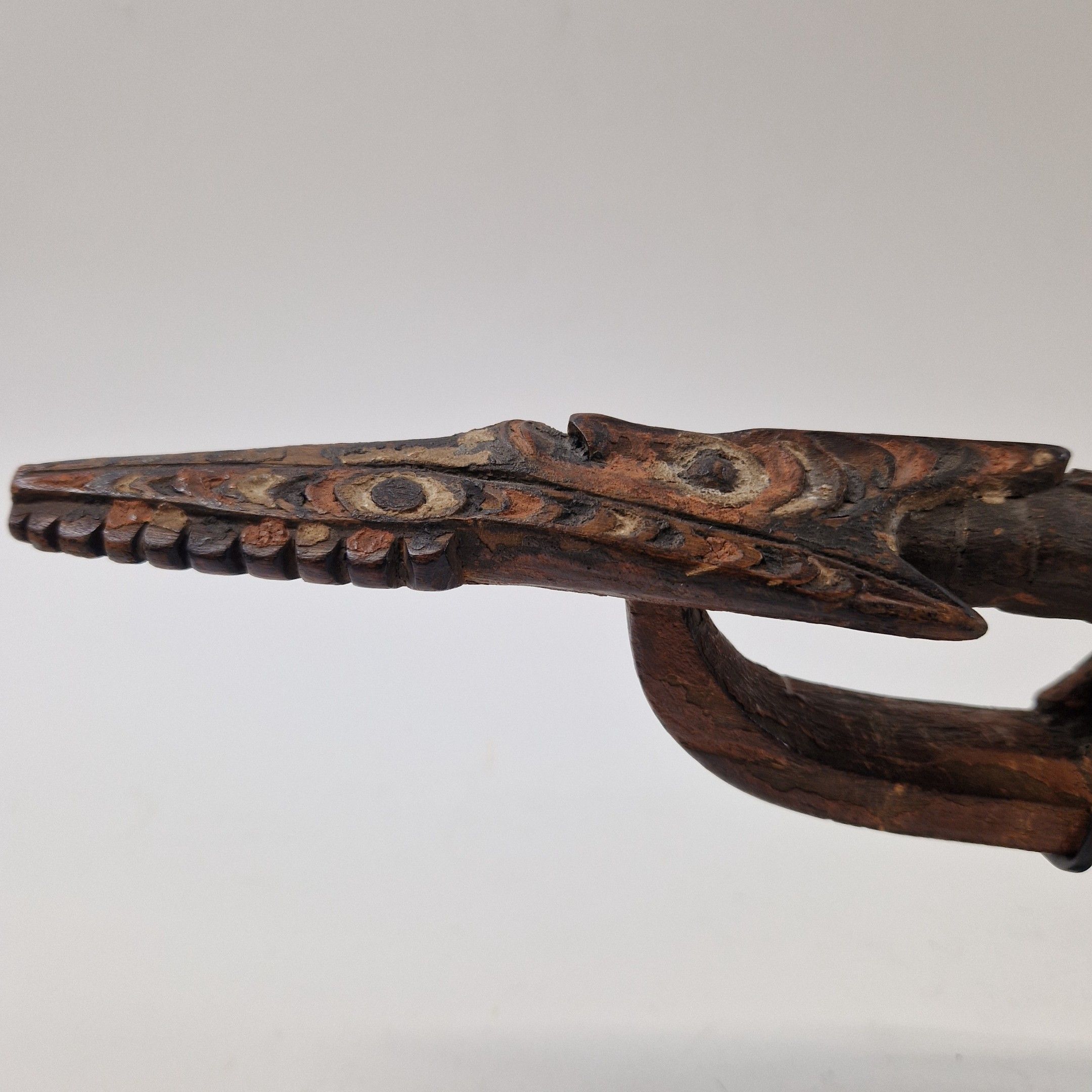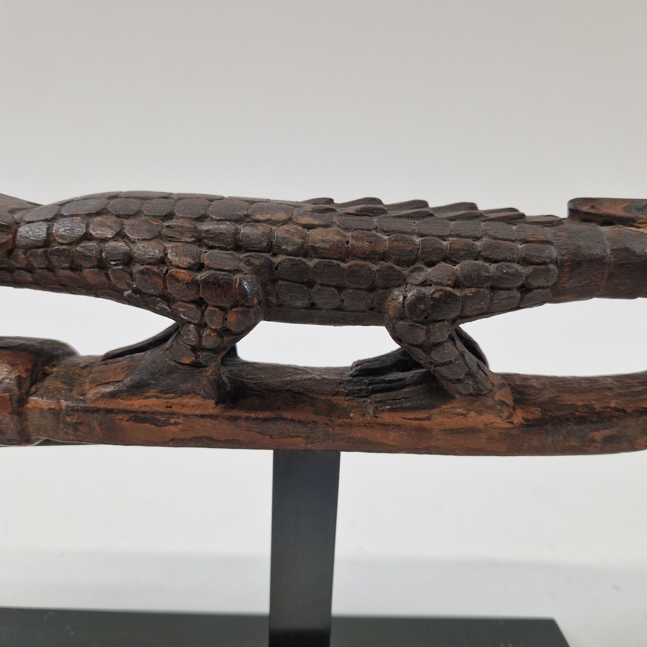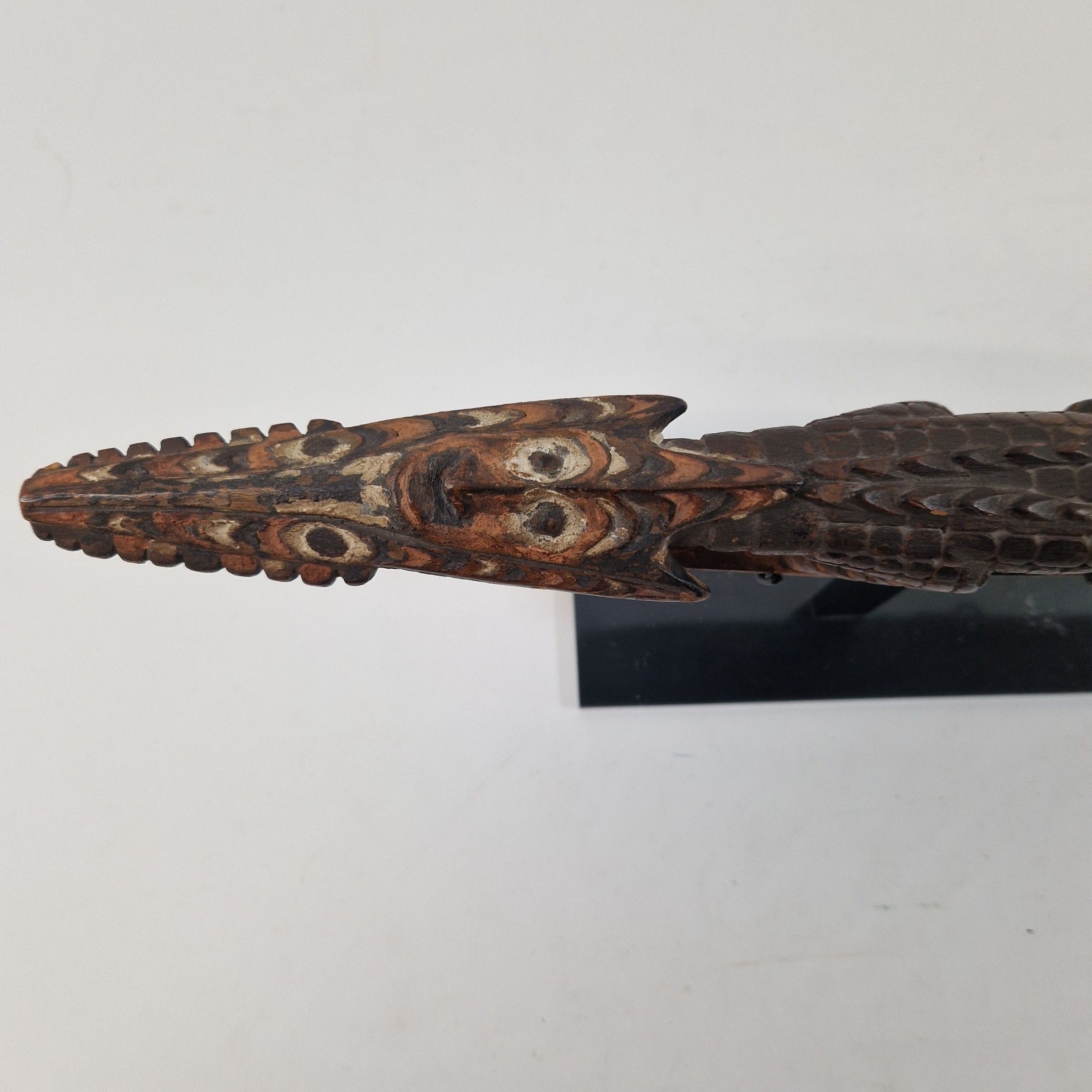 Bouchon de flûte sacrée en bois, originaire du Moyen Sépik, décoré d'un crocodile au traitement réaliste, avec de nombreux détails : écailles, dents, pupilles, etc. Rehaussée d’une polychromie ocre, la queue de l’animal se prolonge par une autre tête de crocodile, traitée ici de manière stylisée, elle-même surmontée d’un visage humain.