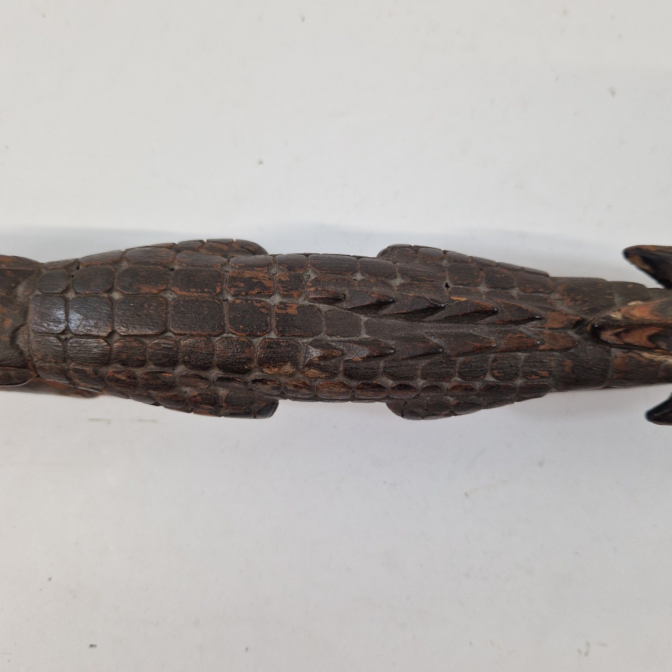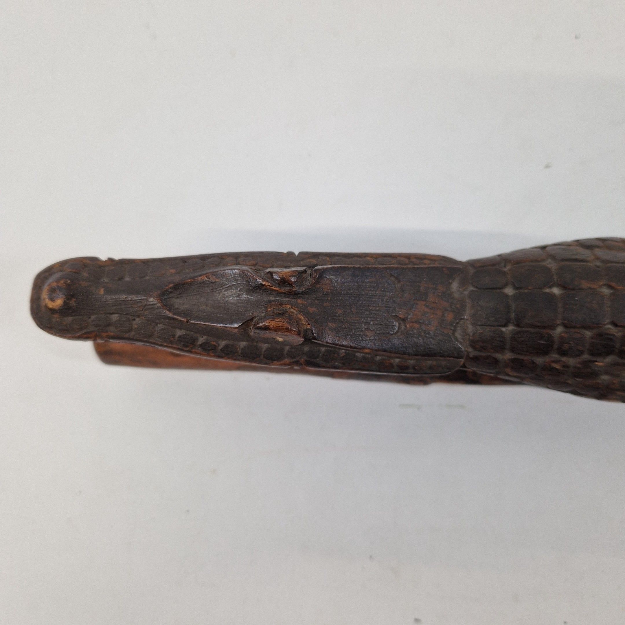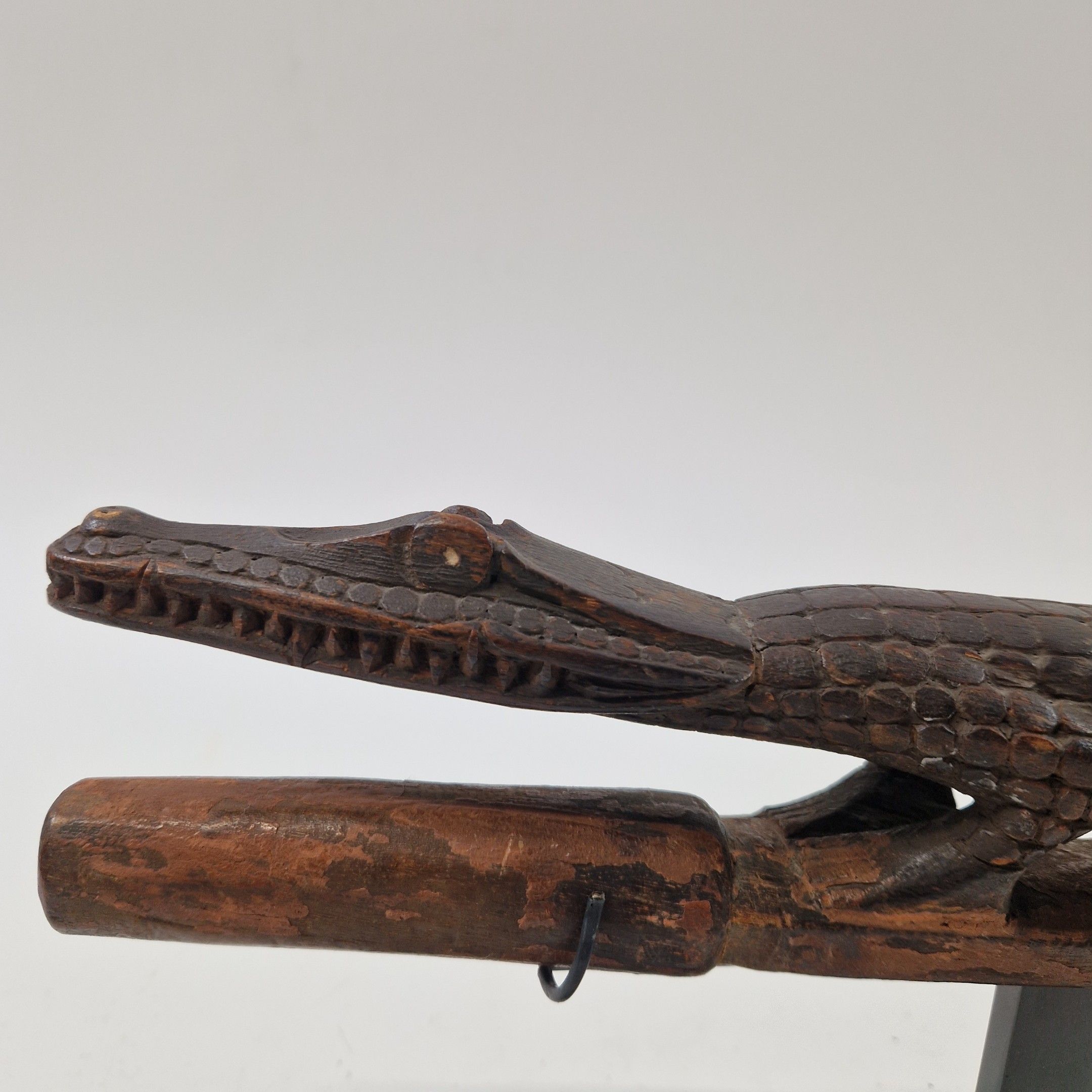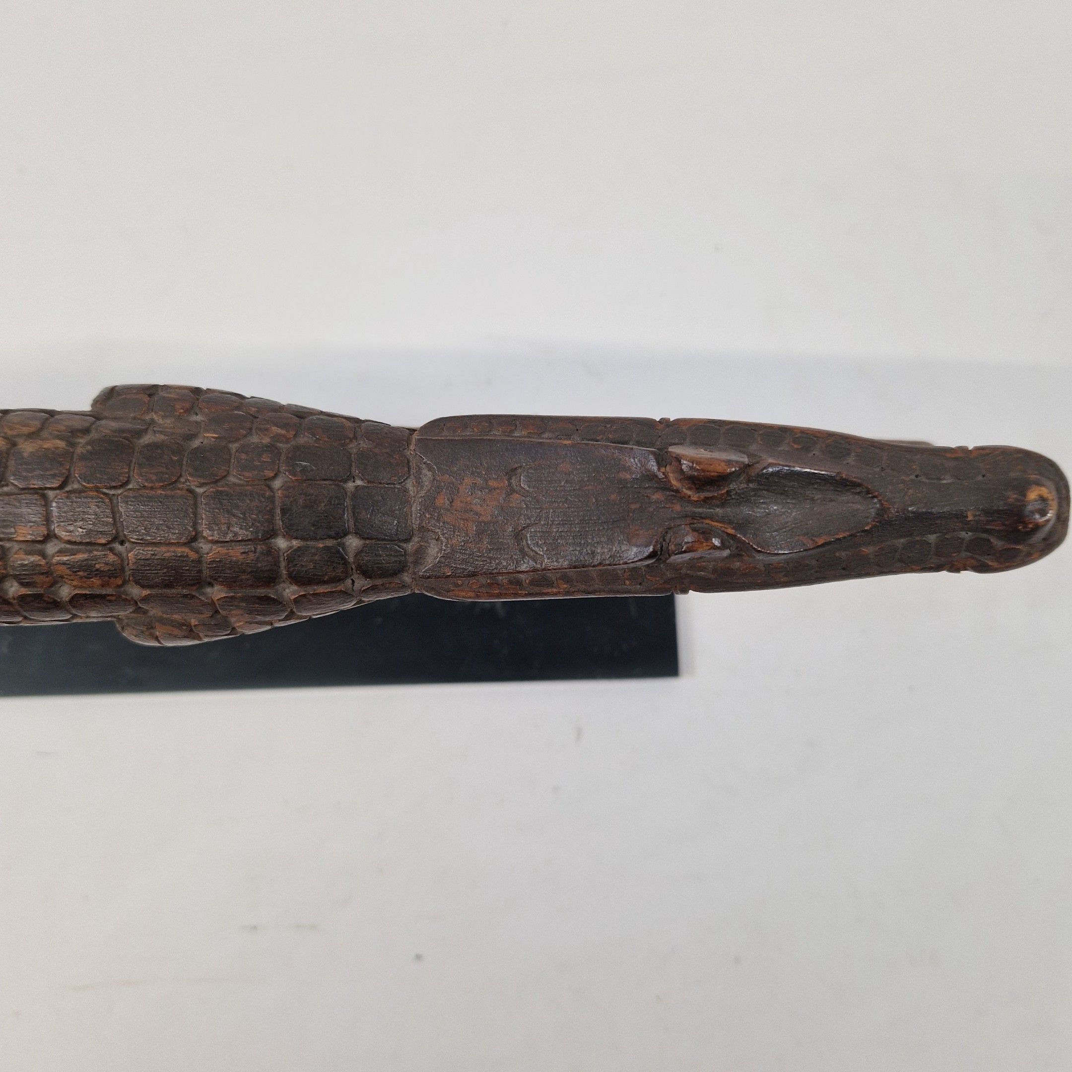 Bouchon de flûte sacrée en bois, originaire du Moyen Sépik, décoré d'un crocodile au traitement réaliste, avec de nombreux détails : écailles, dents, pupilles, etc. Rehaussée d’une polychromie ocre, la queue de l’animal se prolonge par une autre tête de crocodile, traitée ici de manière stylisée, elle-même surmontée d’un visage humain.