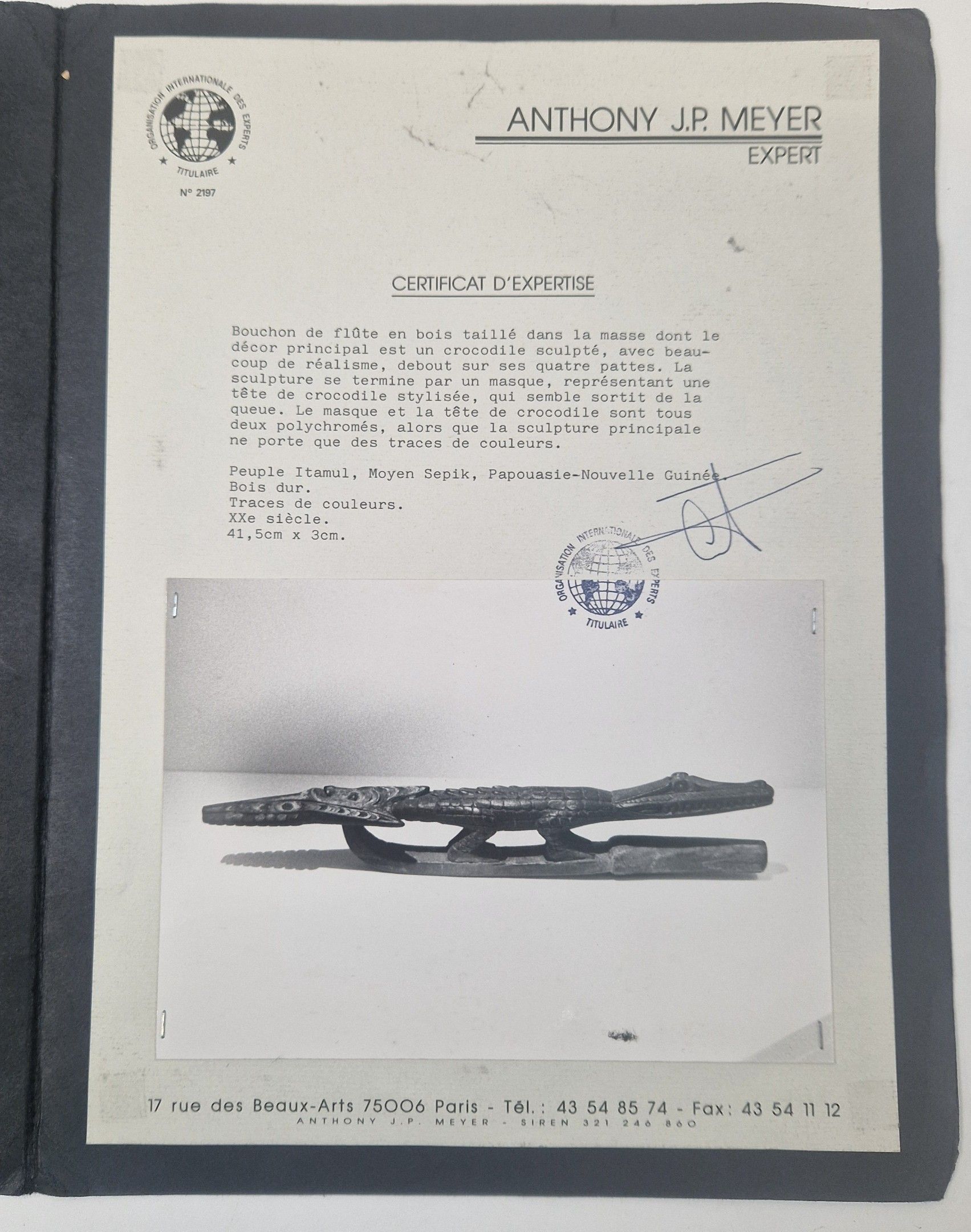 Un certificat de la Galerie Meyer, signé par Anthony J.P. Meyer et datant des années 1990, sera remis à l’acquéreur