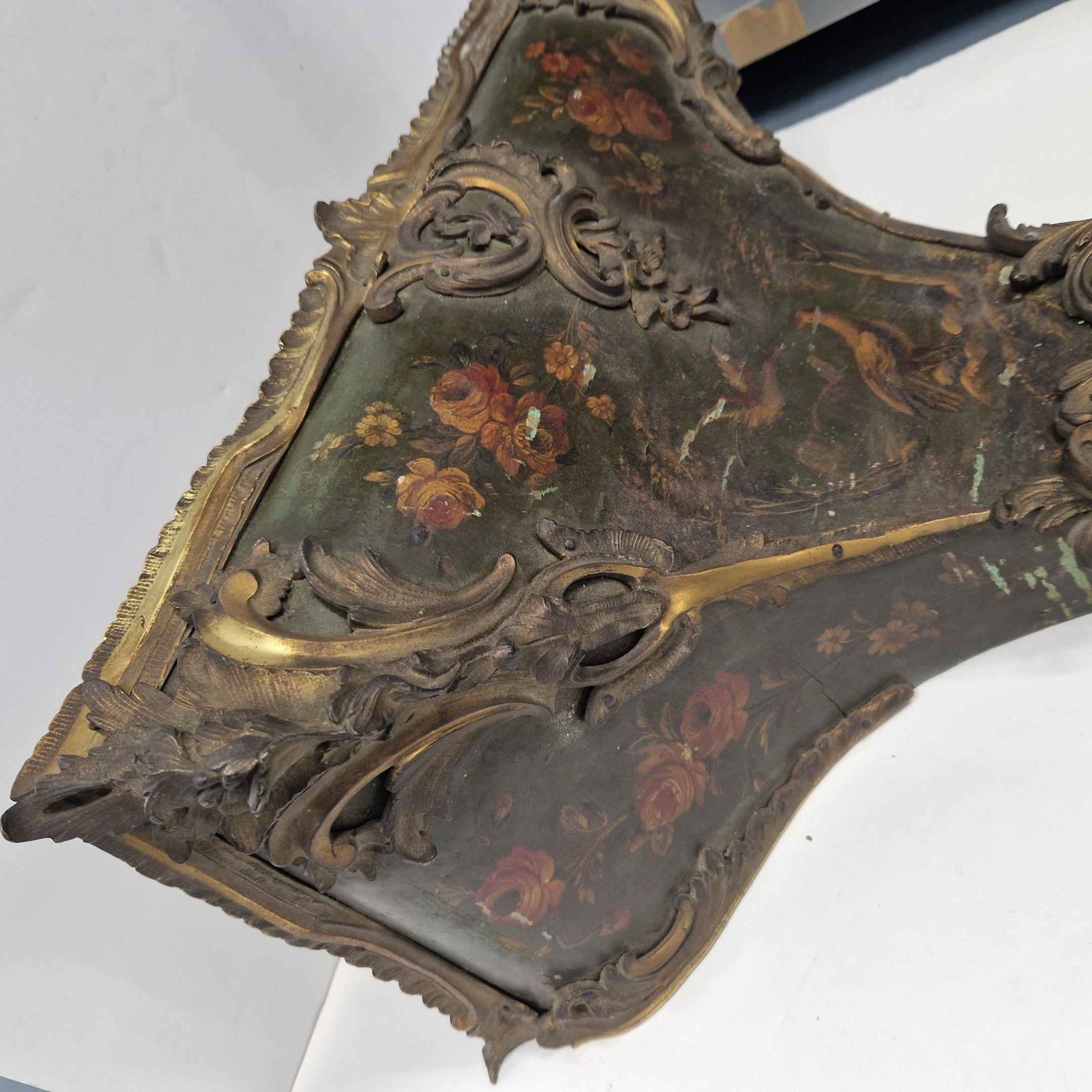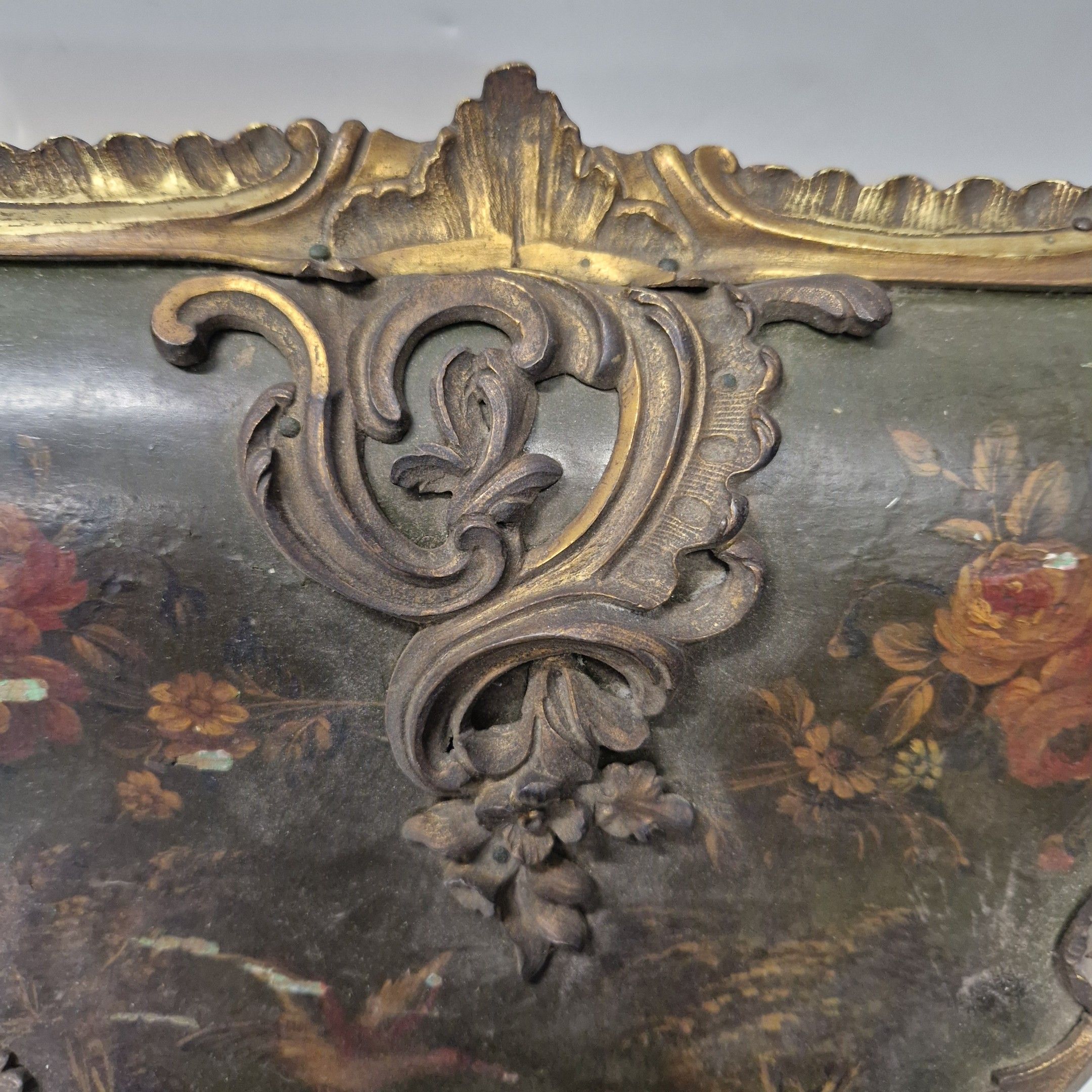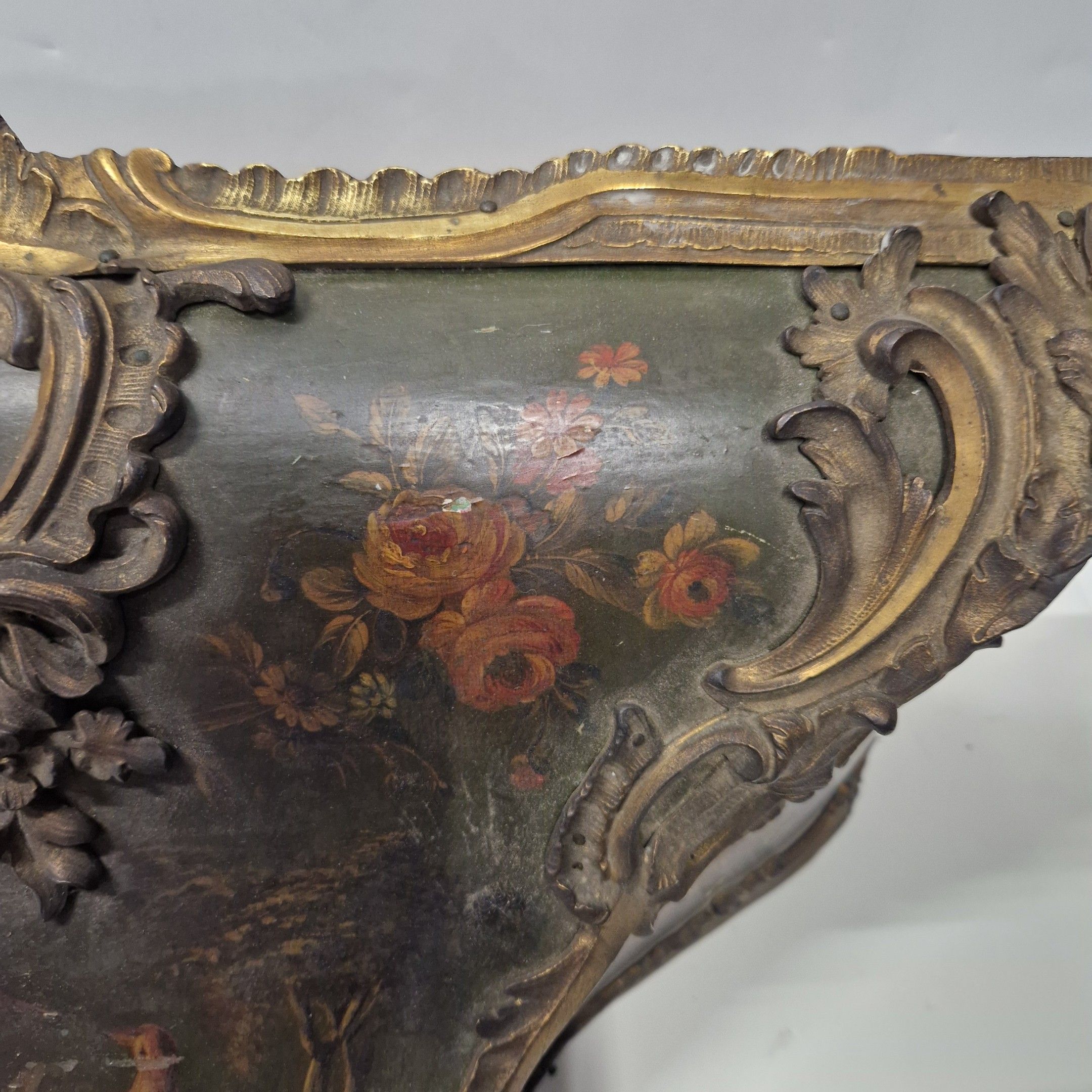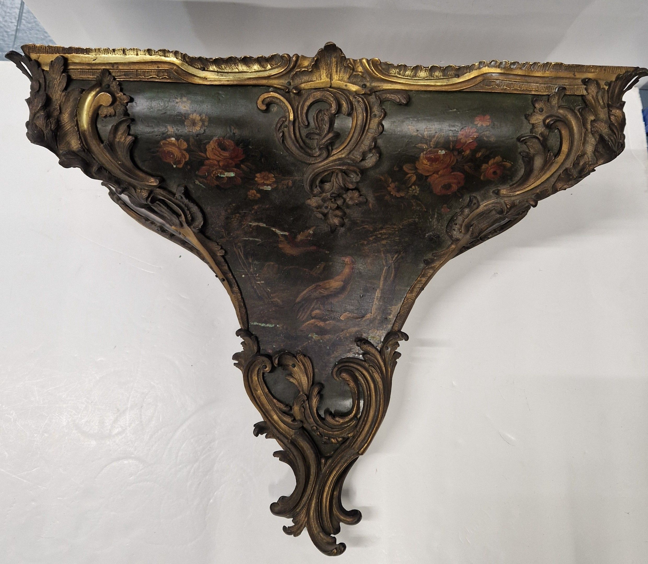 de forme violoné en vernis Martin à décor floral polychrome sur fond vert. Riche ornementation de bronze ciselé et doré de rinceaux feuillagés. La console à décor de volatiles dans un paysage arboré.
