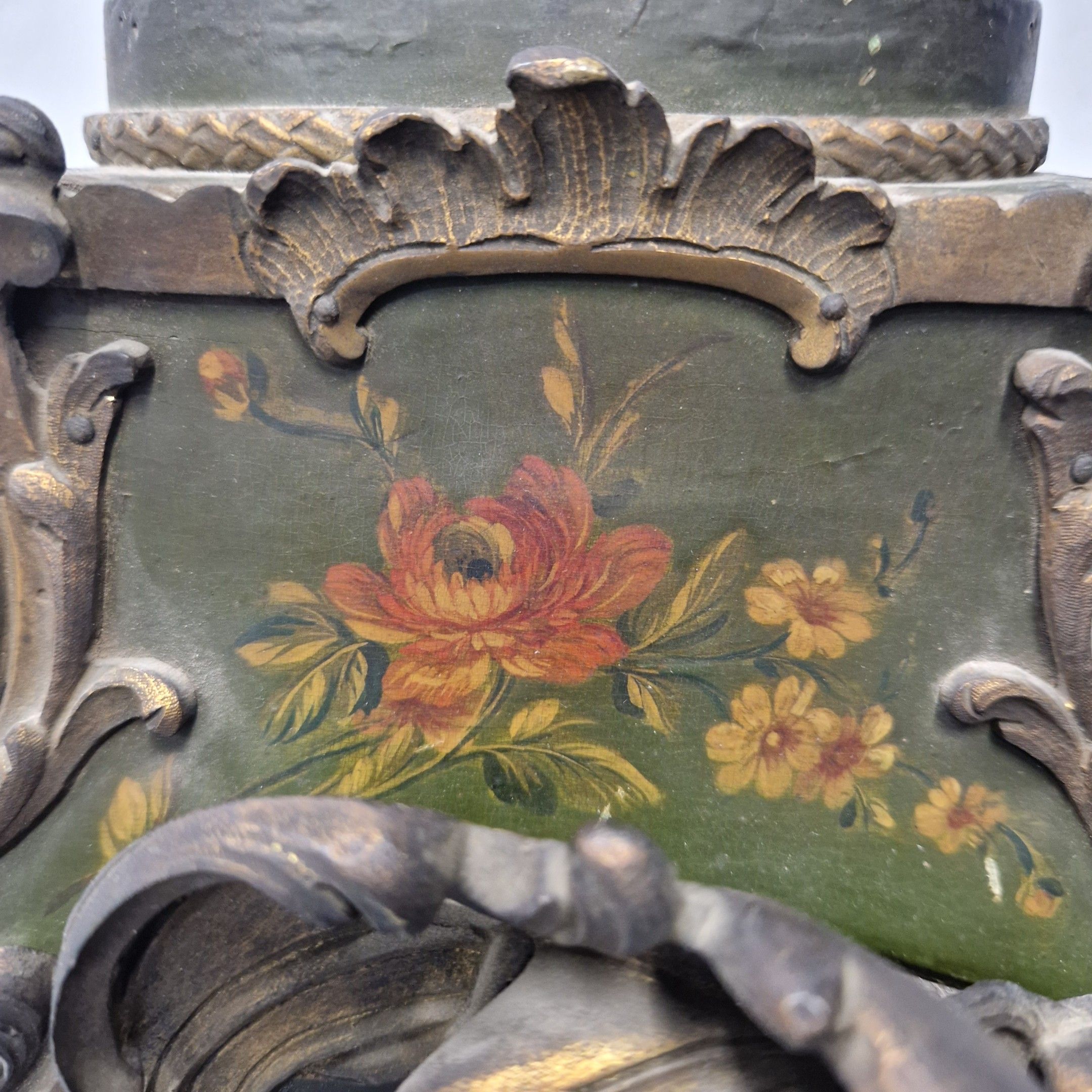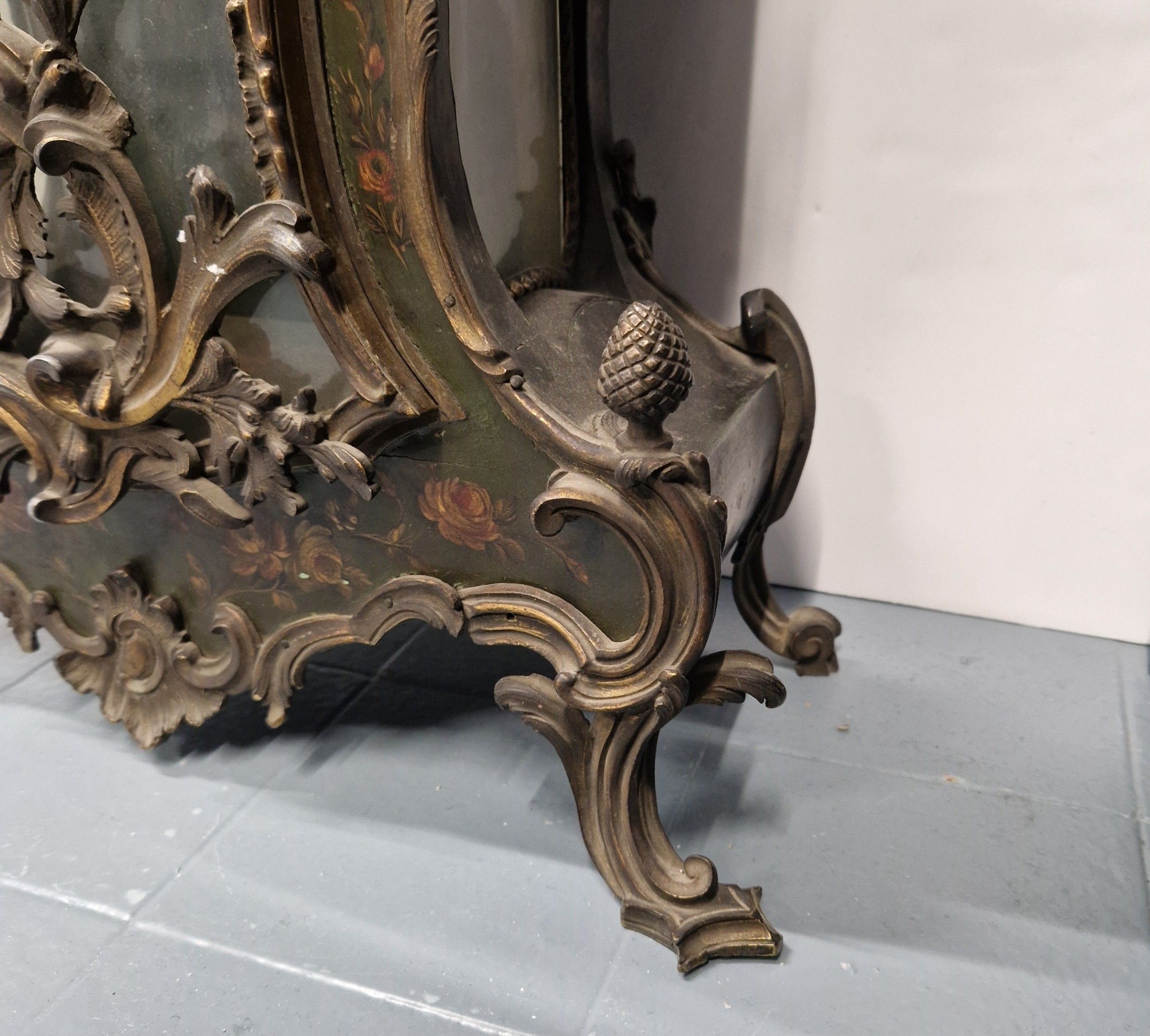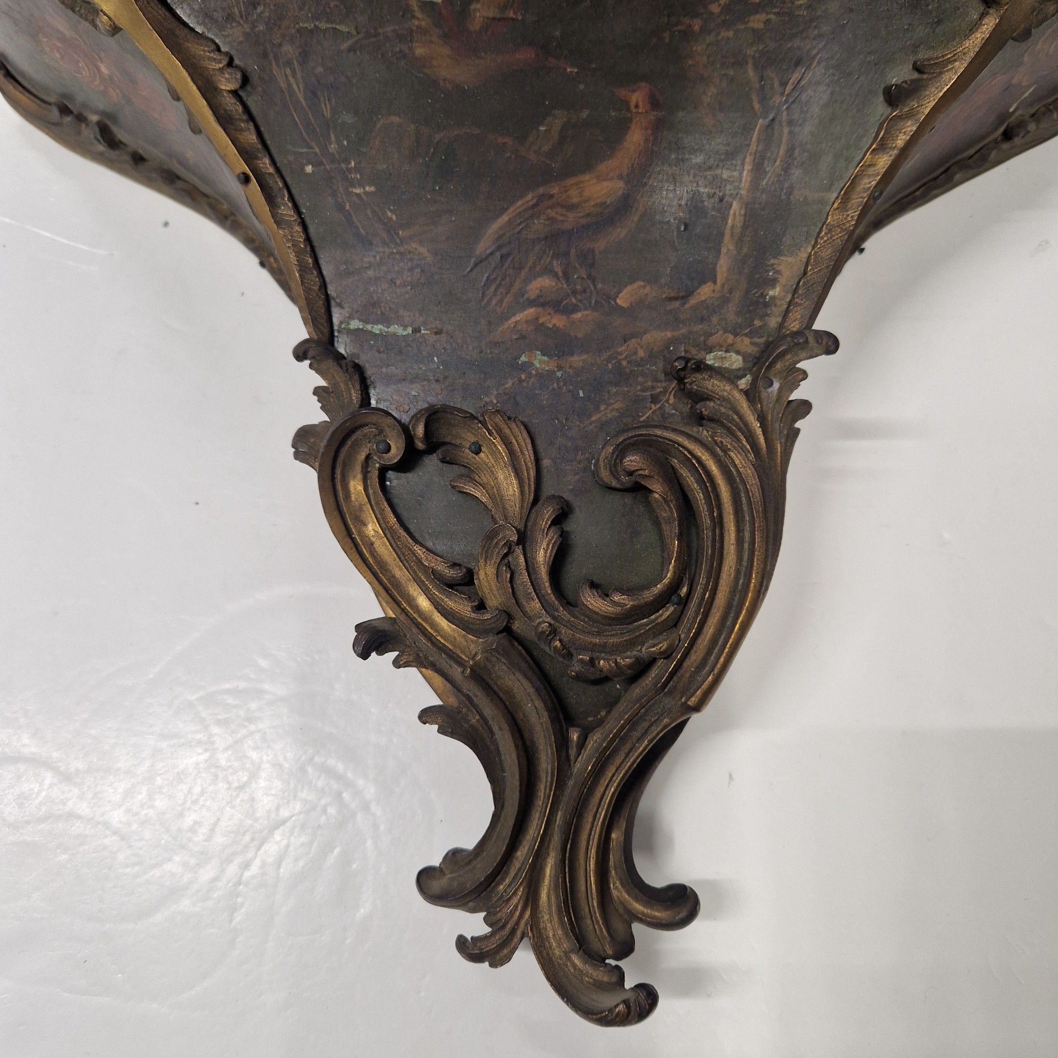 de forme violoné en vernis Martin à décor floral polychrome sur fond vert. Riche ornementation de bronze ciselé et doré de rinceaux feuillagés. La console à décor de volatiles dans un paysage arboré.