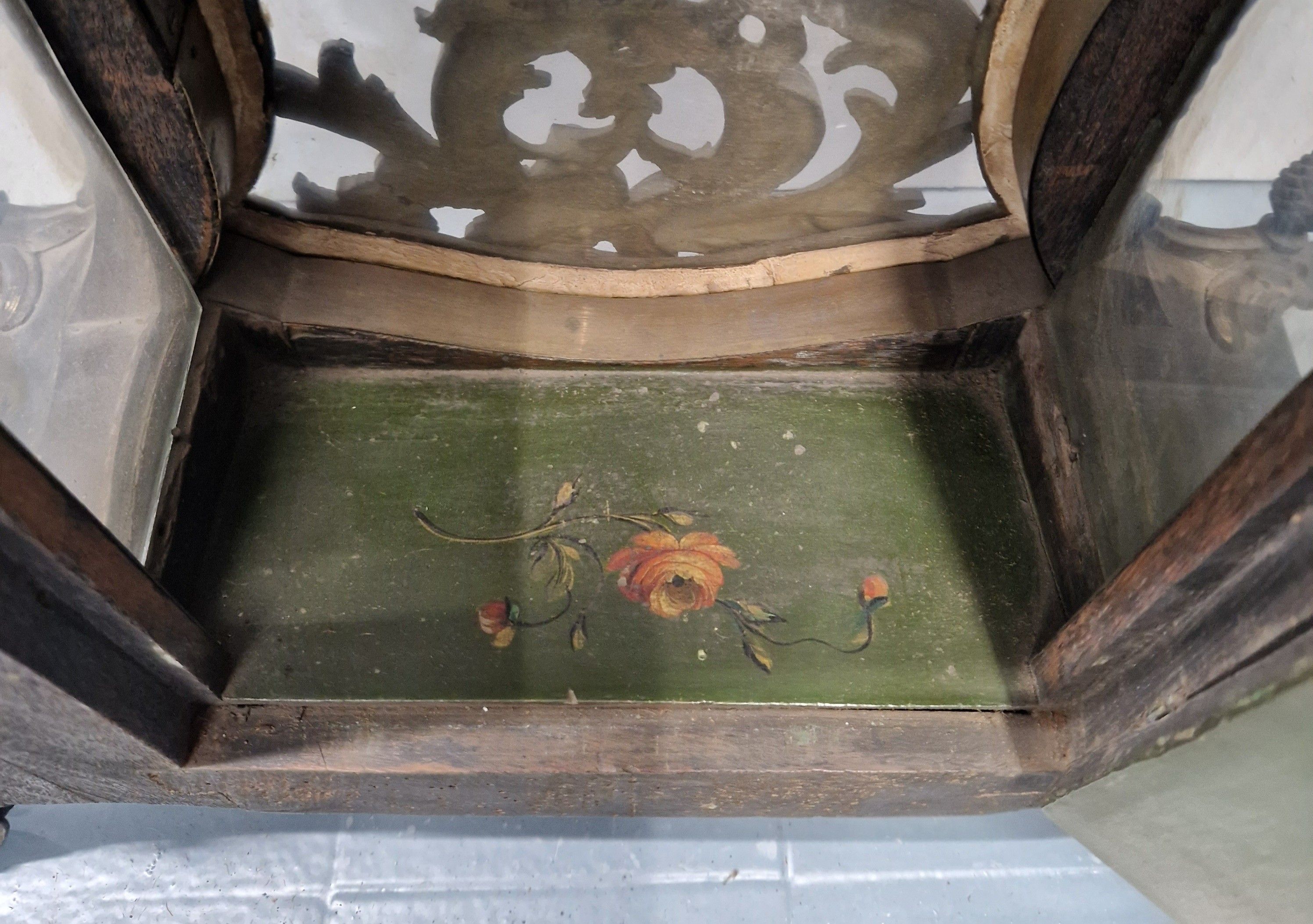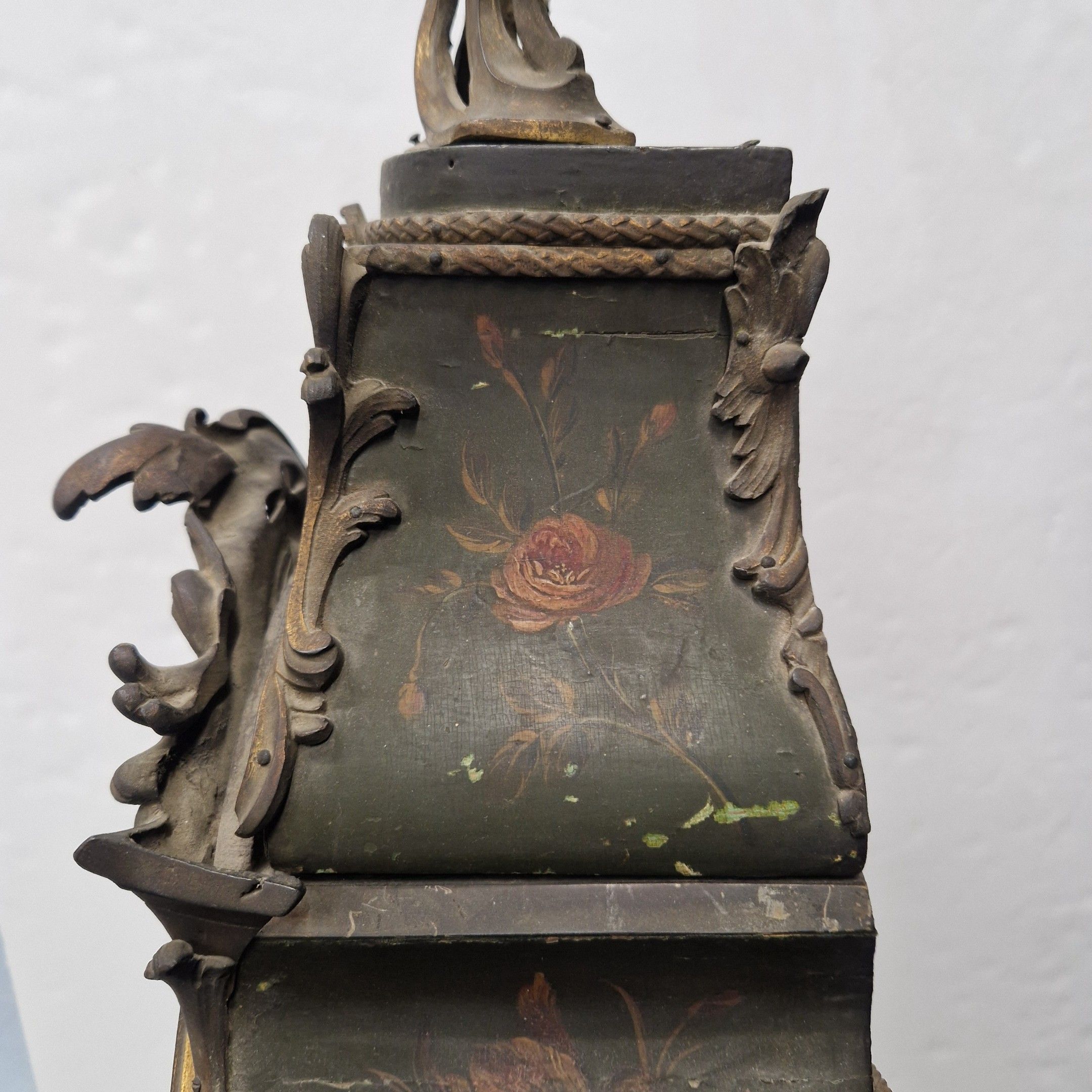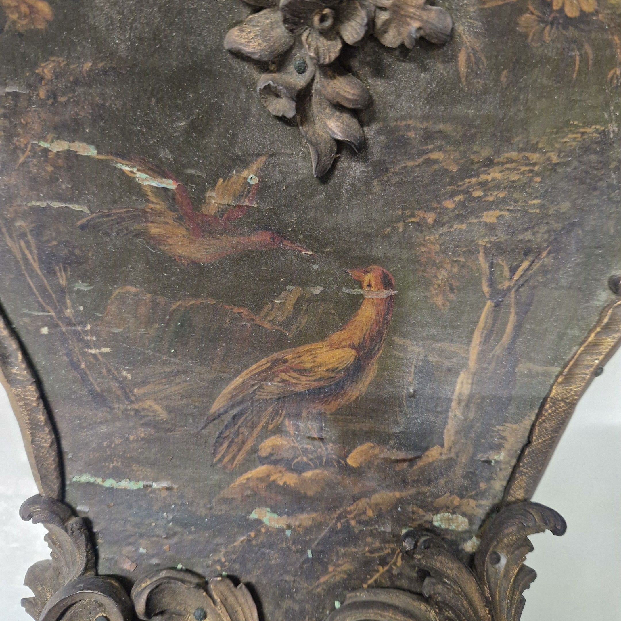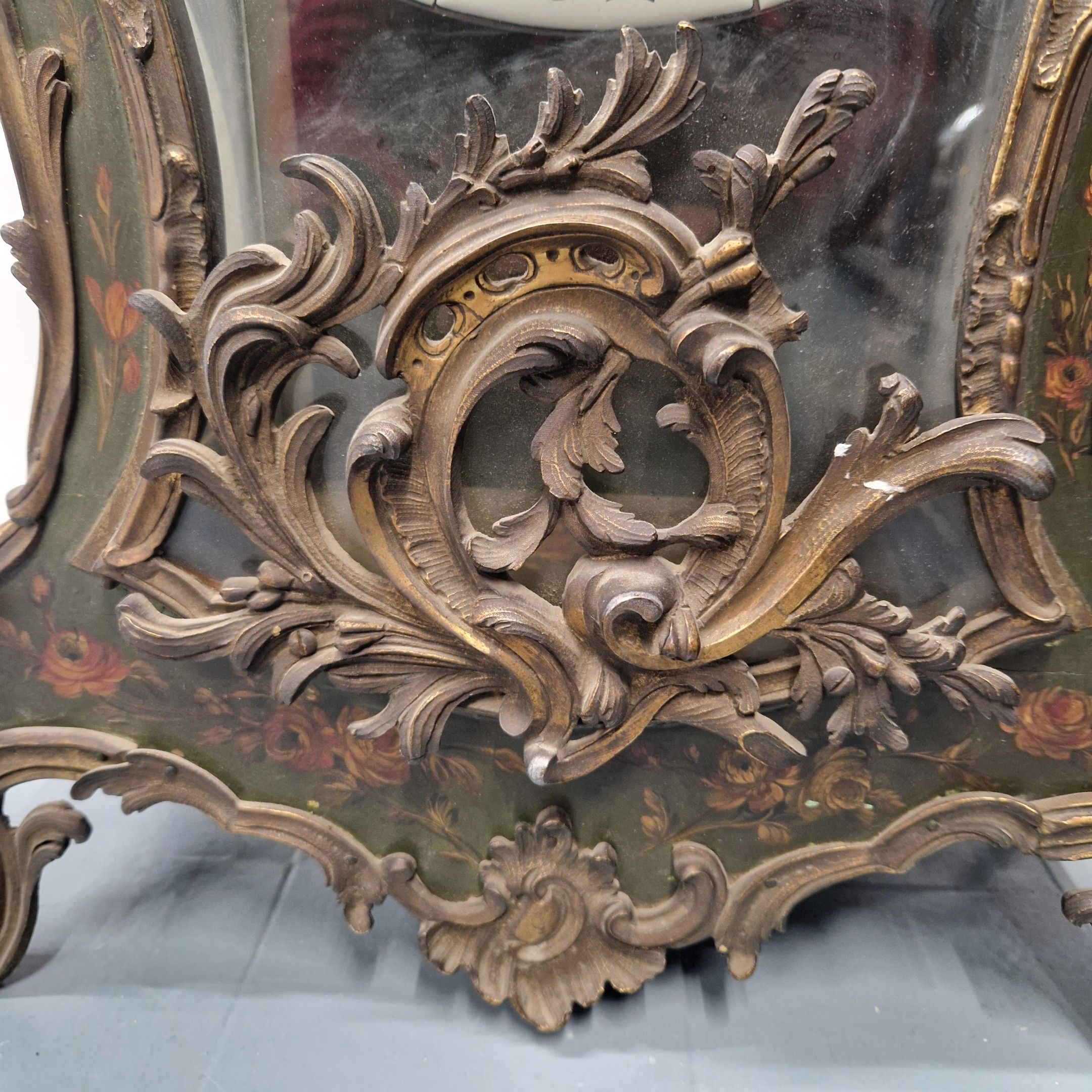 de forme violoné en vernis Martin à décor floral polychrome sur fond vert. Riche ornementation de bronze ciselé et doré de rinceaux feuillagés. La console à décor de volatiles dans un paysage arboré.