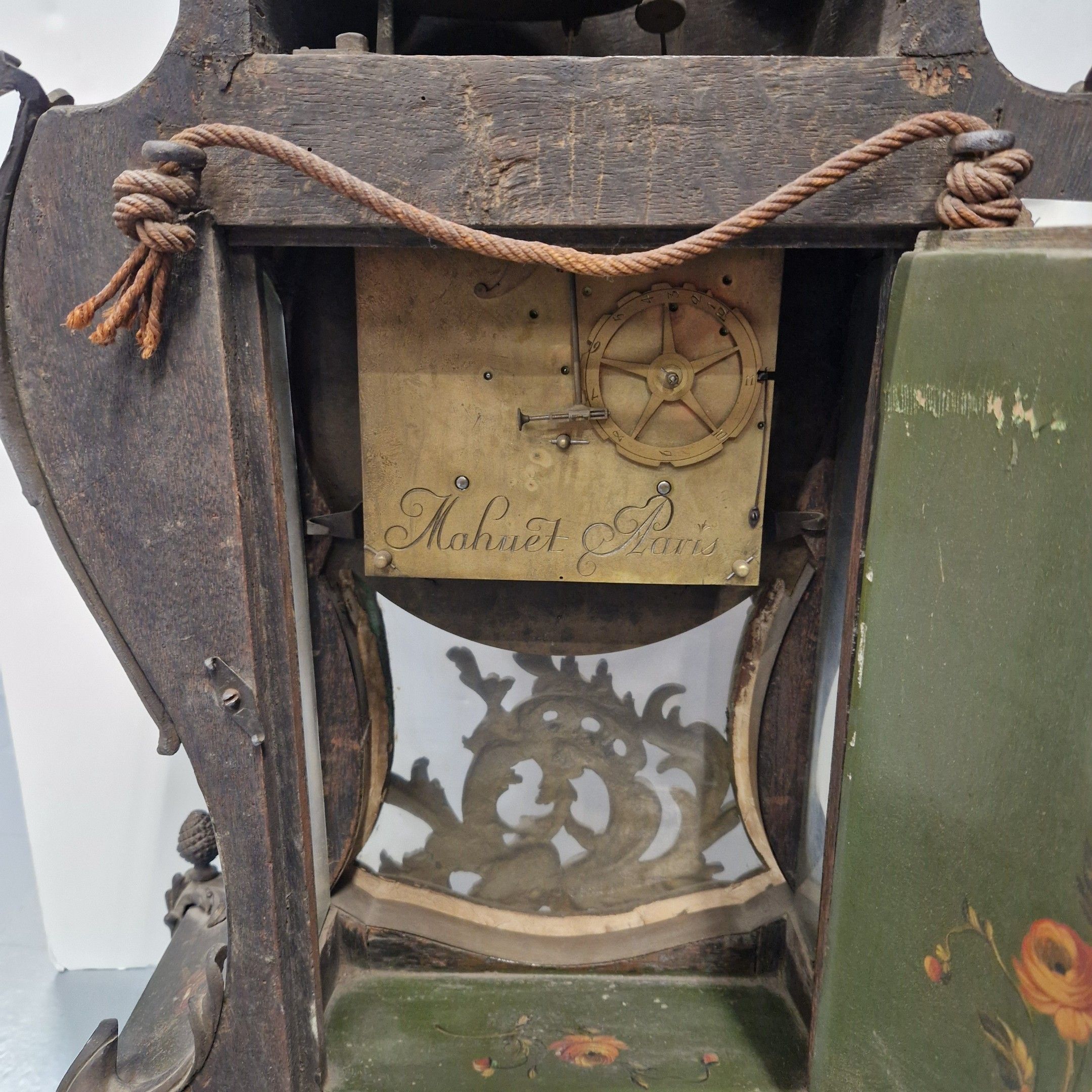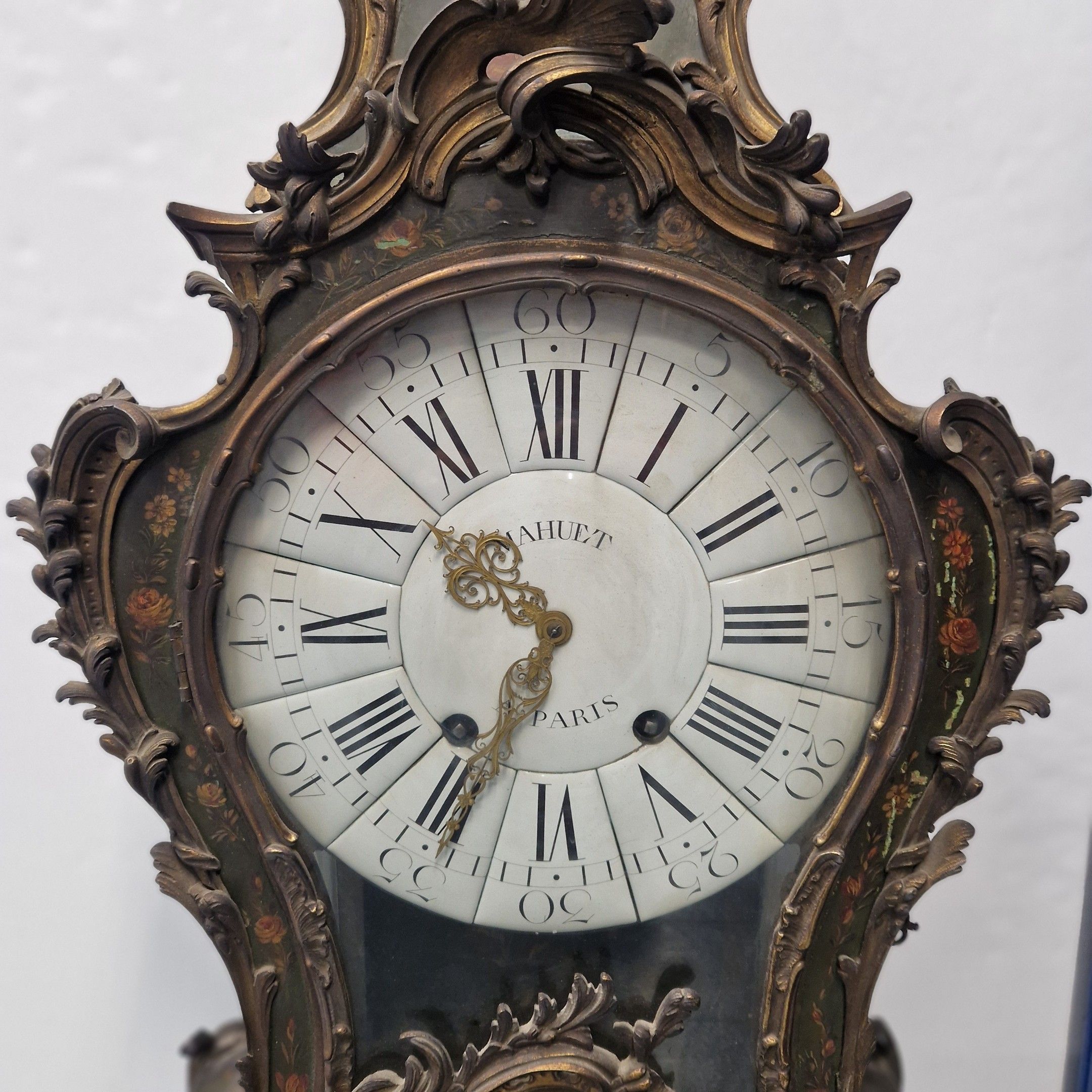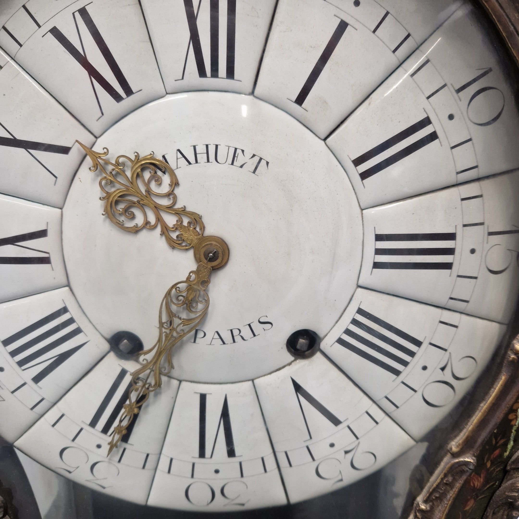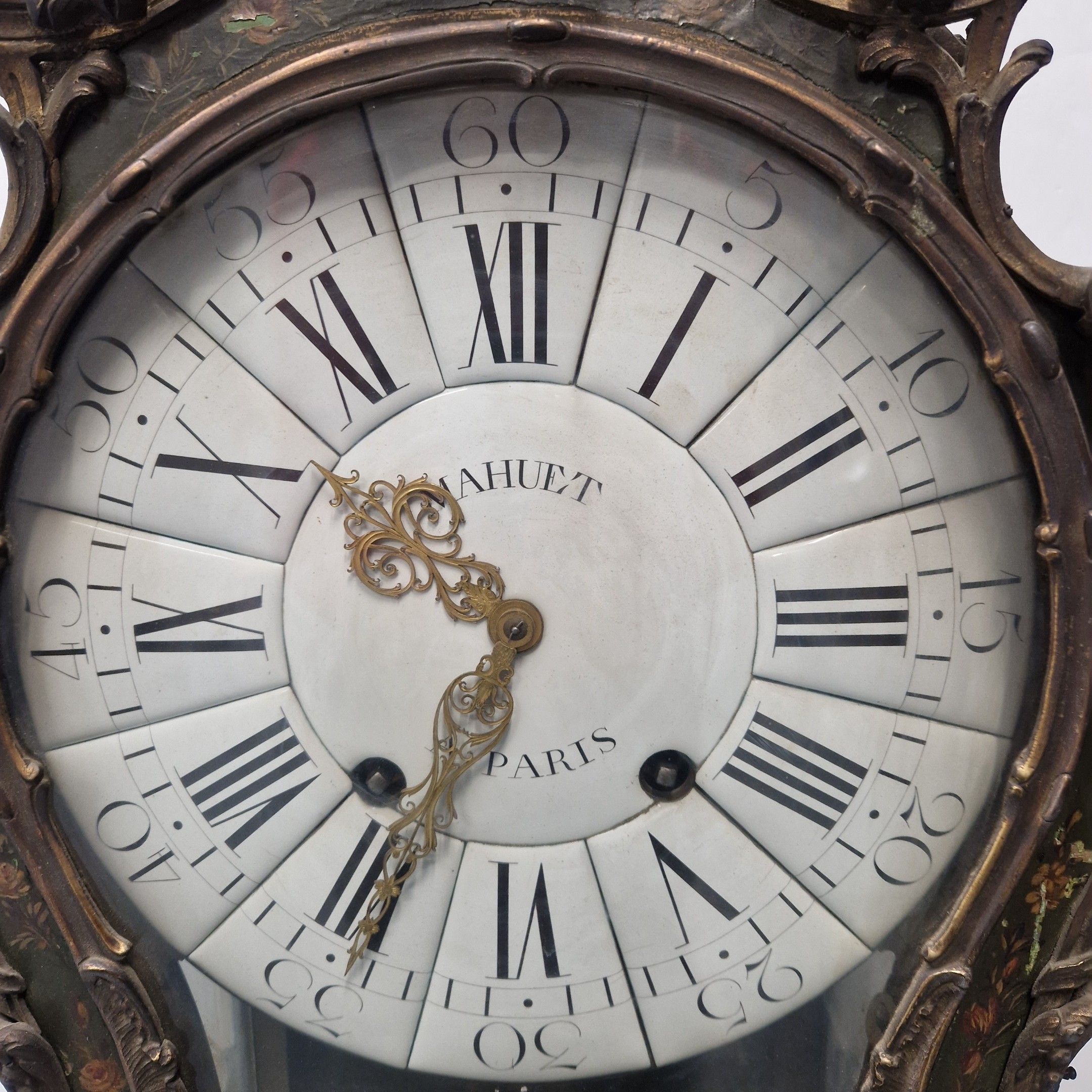 Le cadran à cartouches émaillés blancs indique les heures en chiffres romains et arabes pour les minutes. Il est signé MAHUET à Paris ainsi que le mouvement.