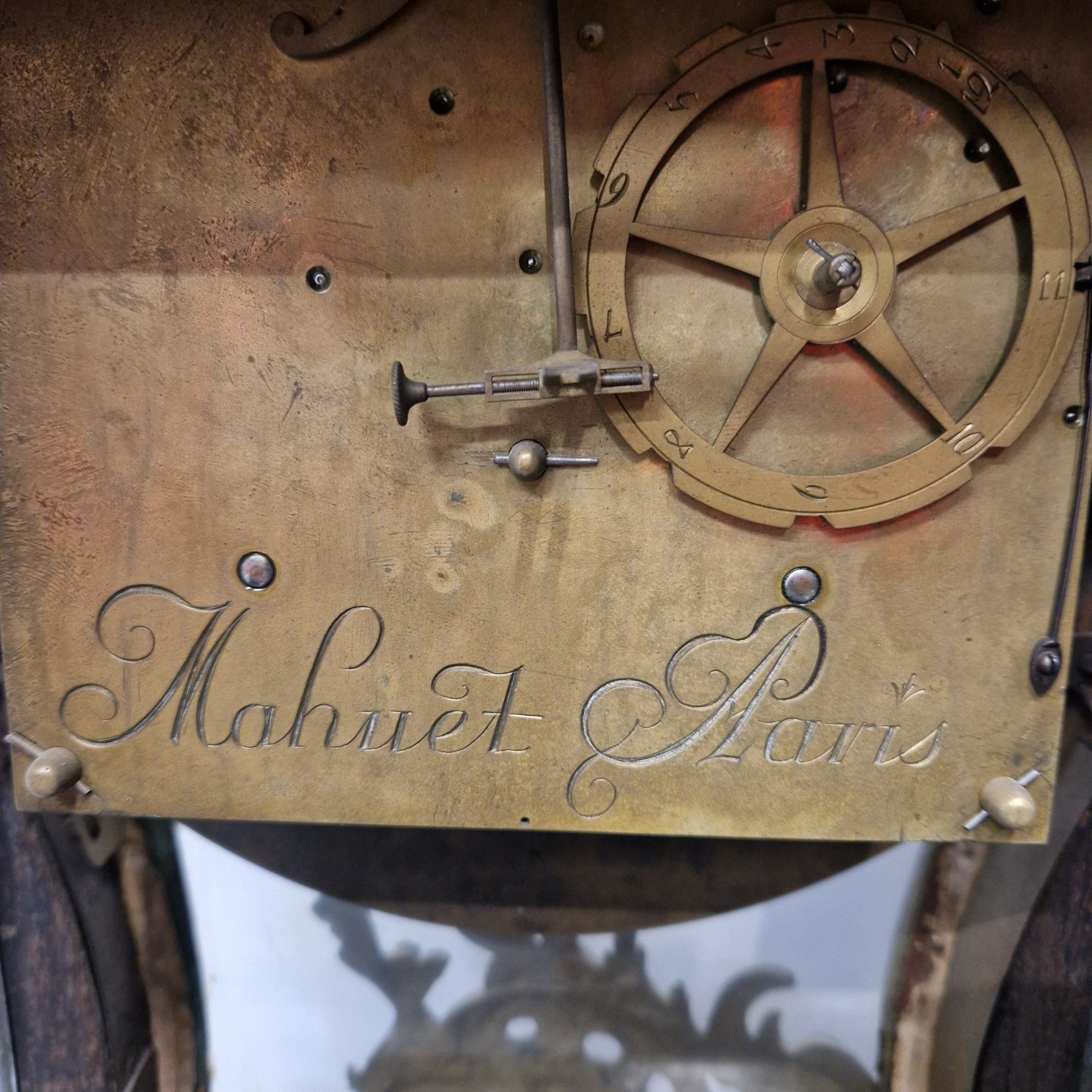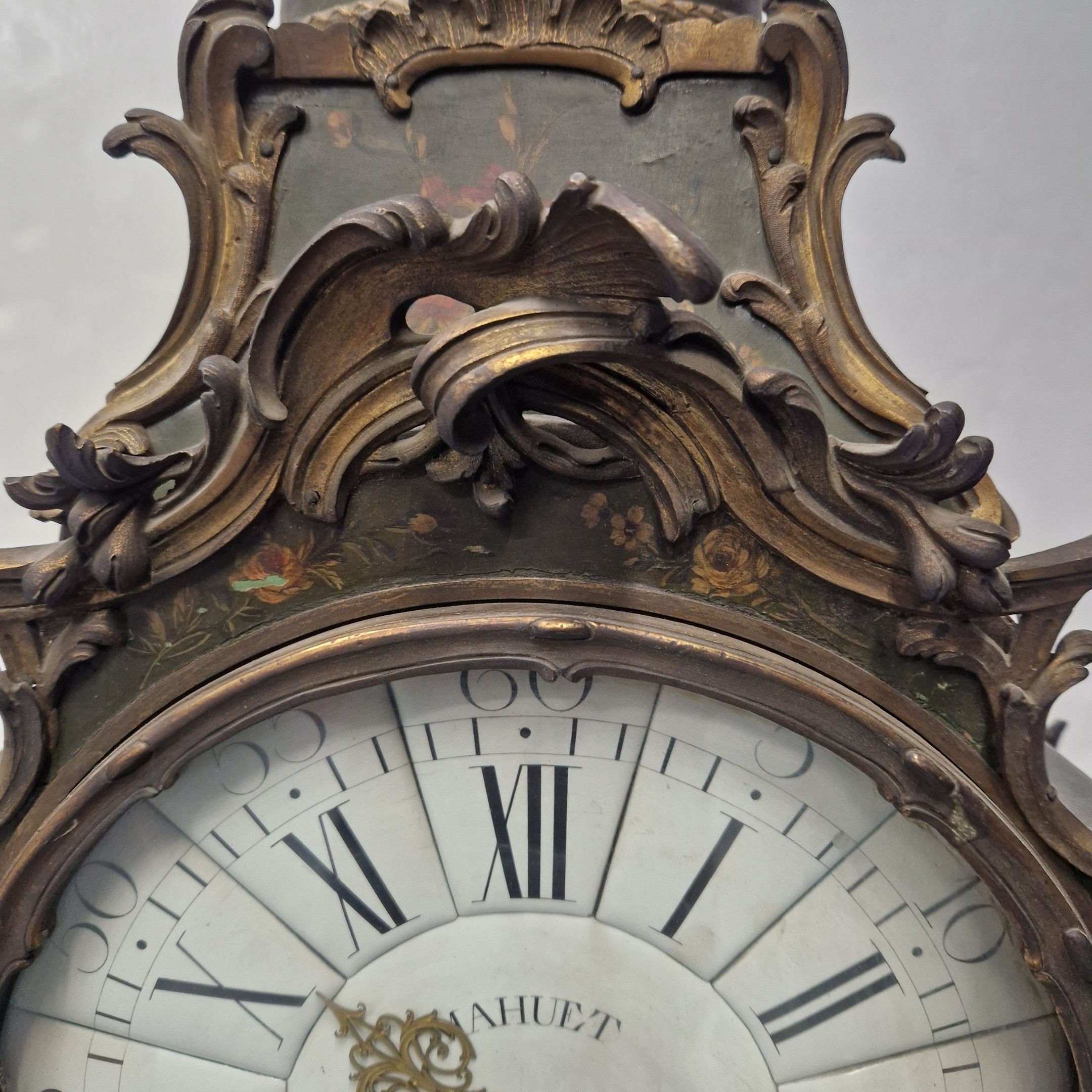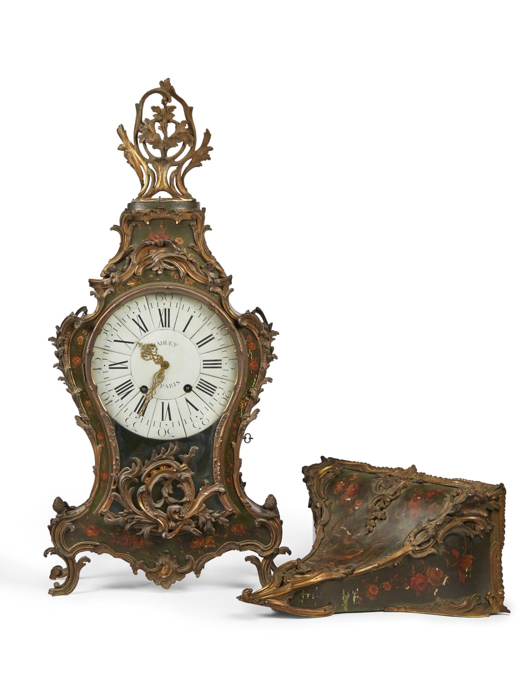 Le cadran à cartouches émaillés blancs indique les heures en chiffres romains et arabes pour les minutes. Il est signé MAHUET à Paris ainsi que le mouvement.