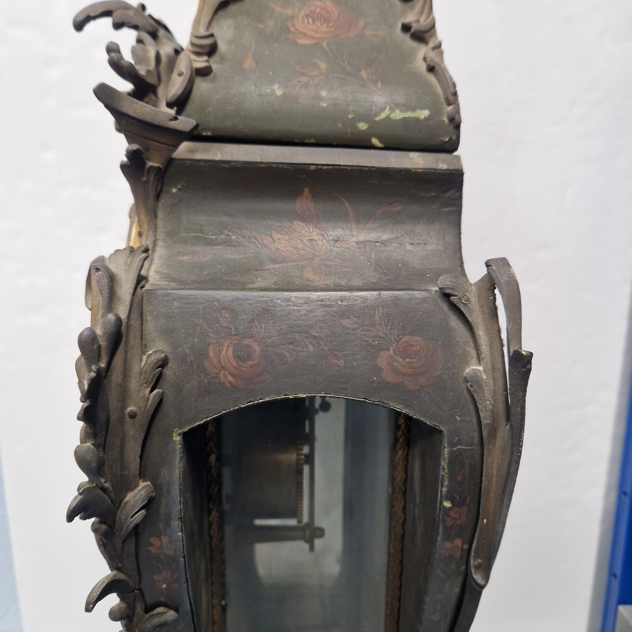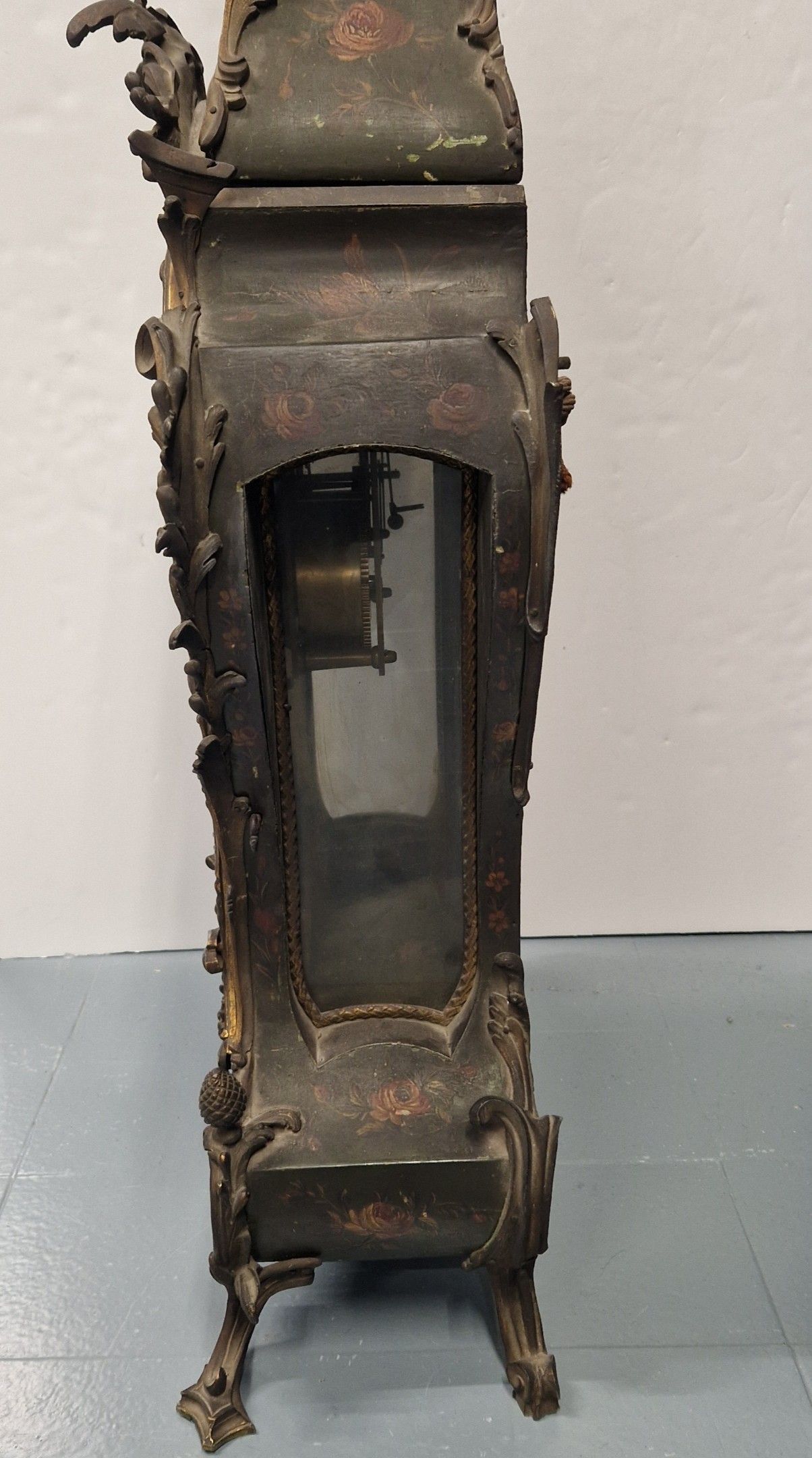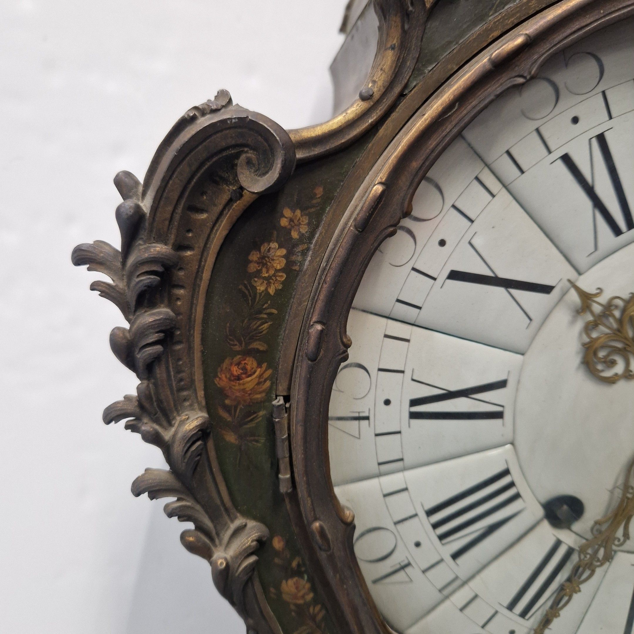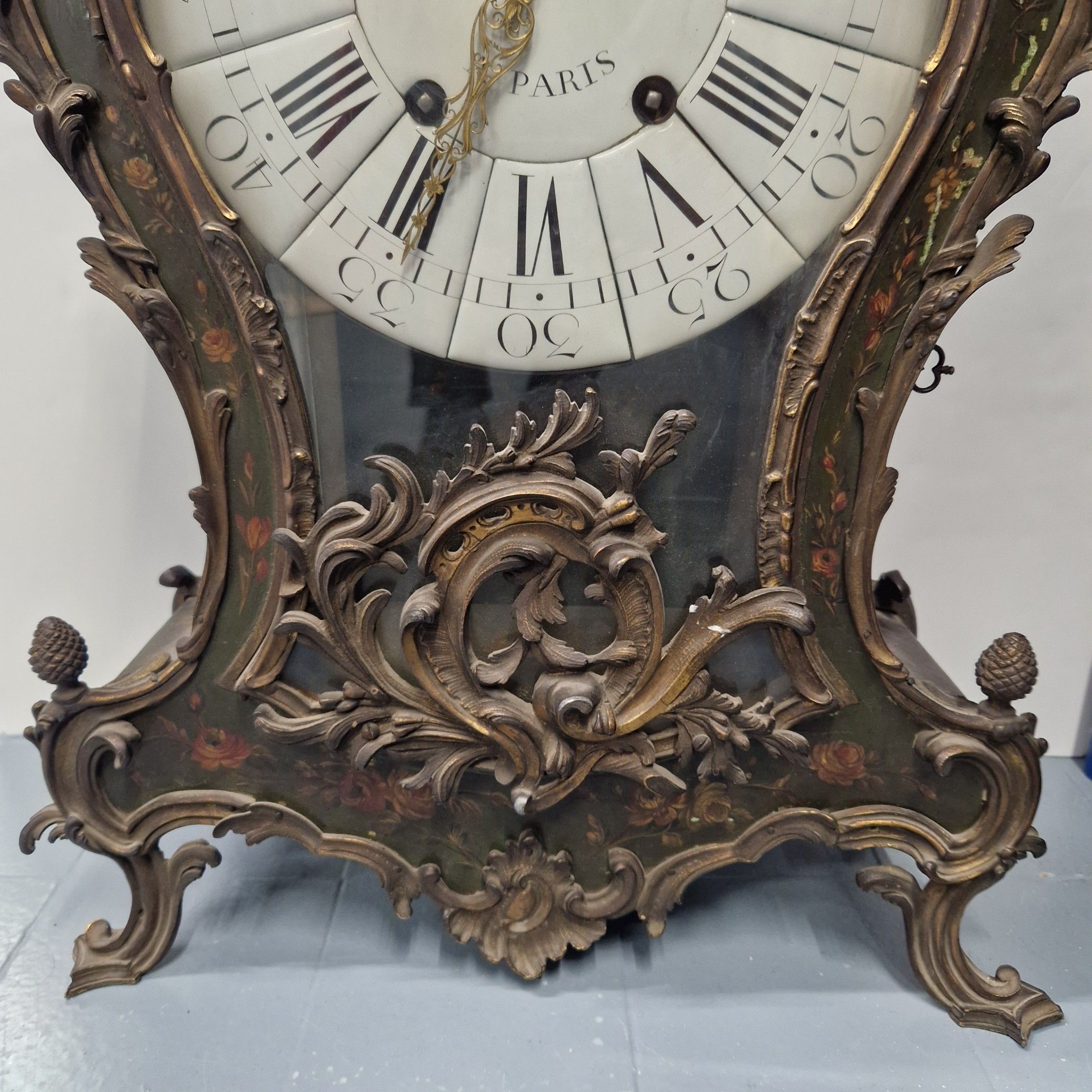 Le cadran à cartouches émaillés blancs indique les heures en chiffres romains et arabes pour les minutes. Il est signé MAHUET à Paris ainsi que le mouvement.