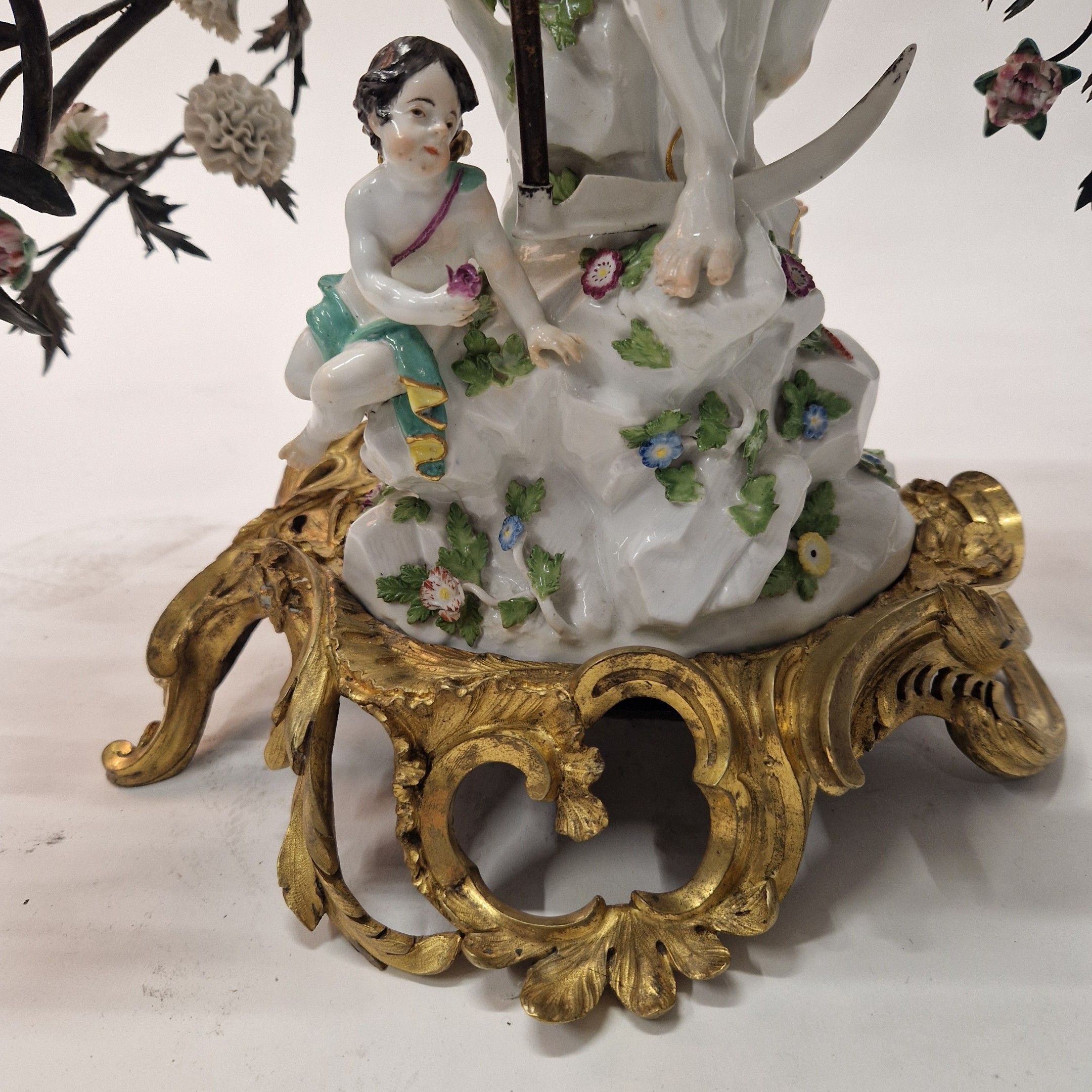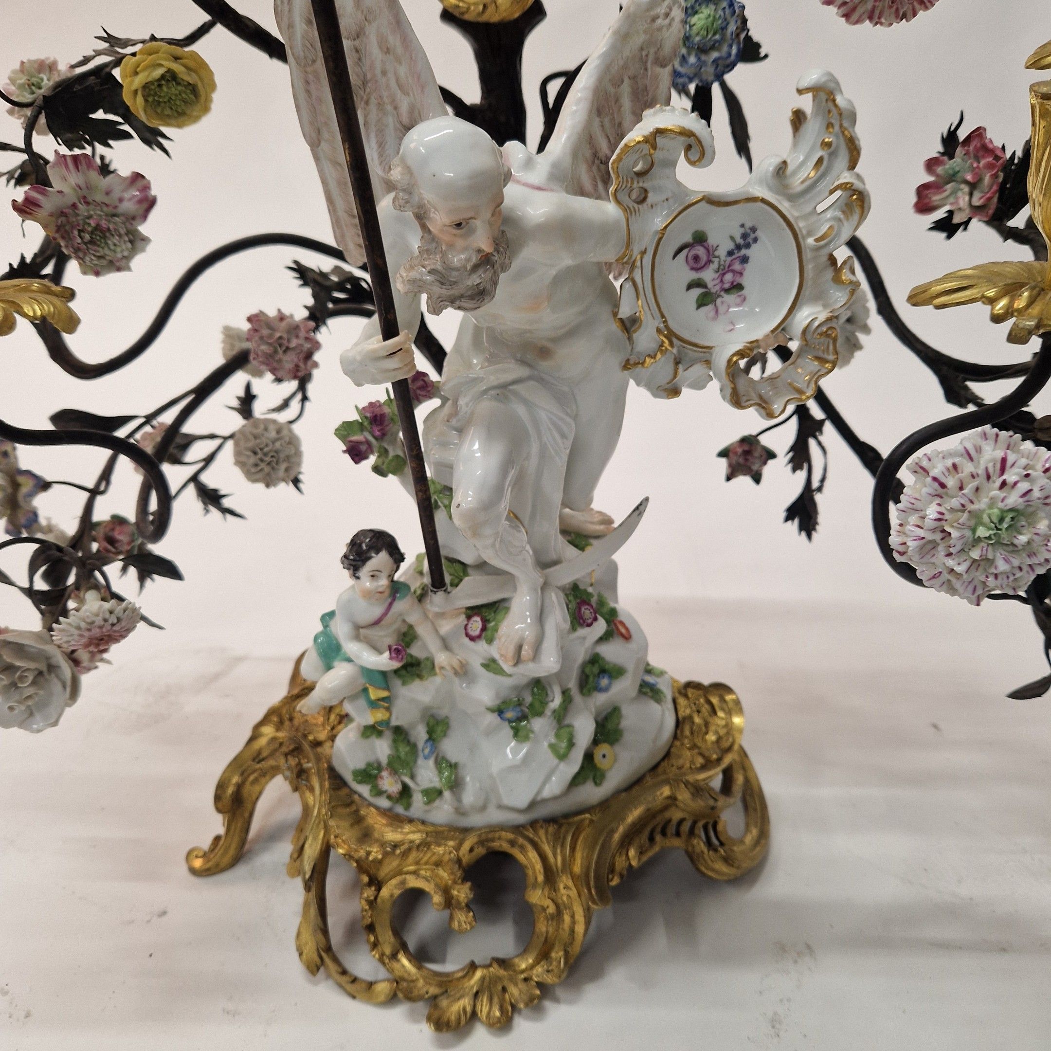 Pendule « au temps » en porcelaine et bronze doré formant candélabre à quatre bras de lumière.