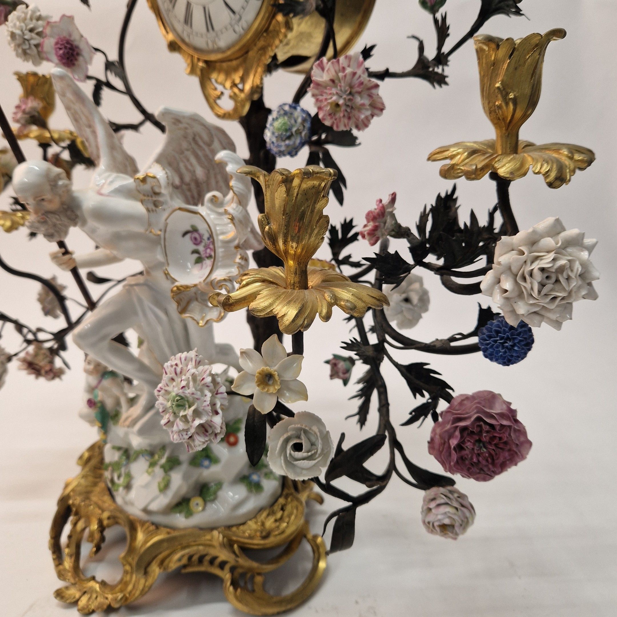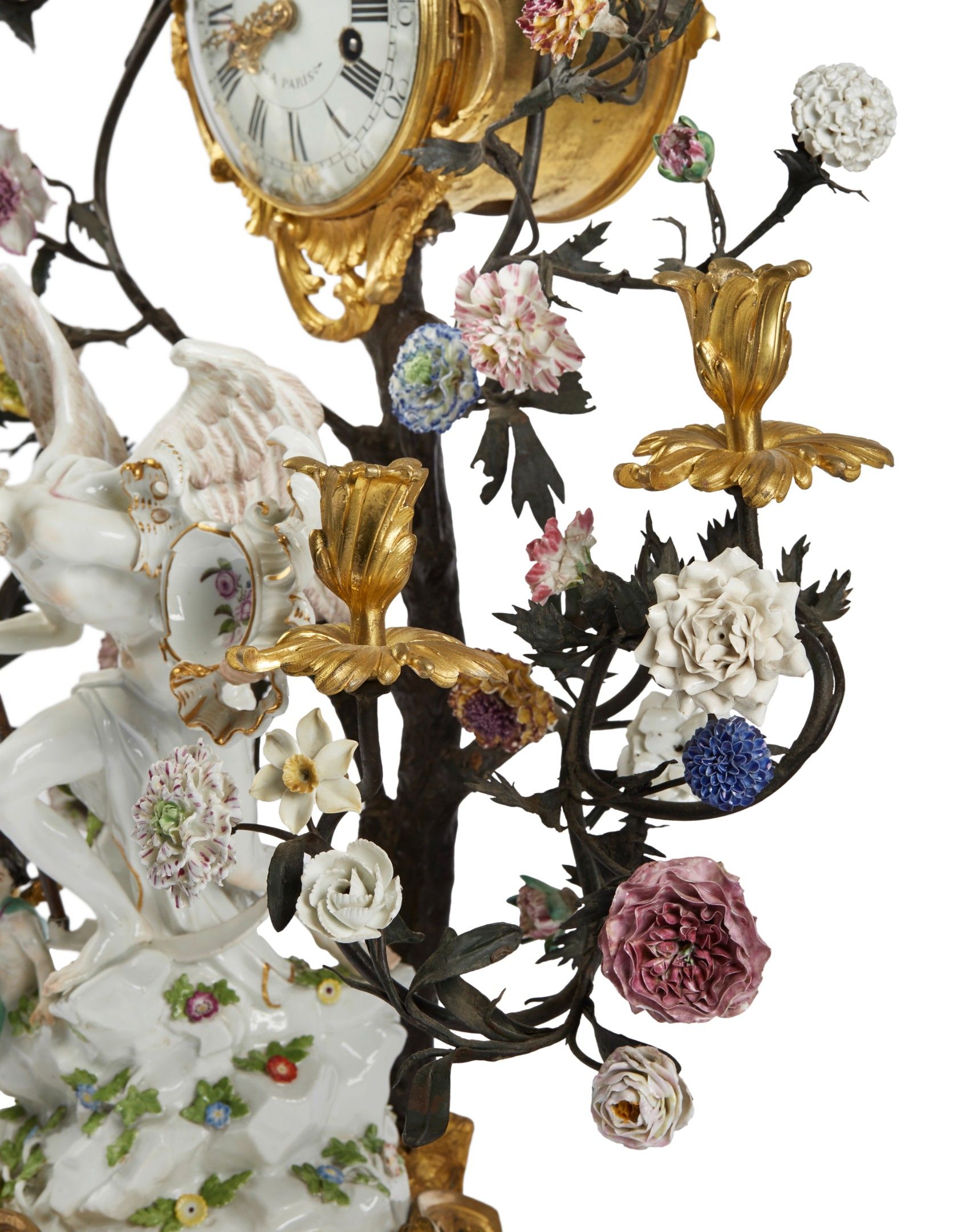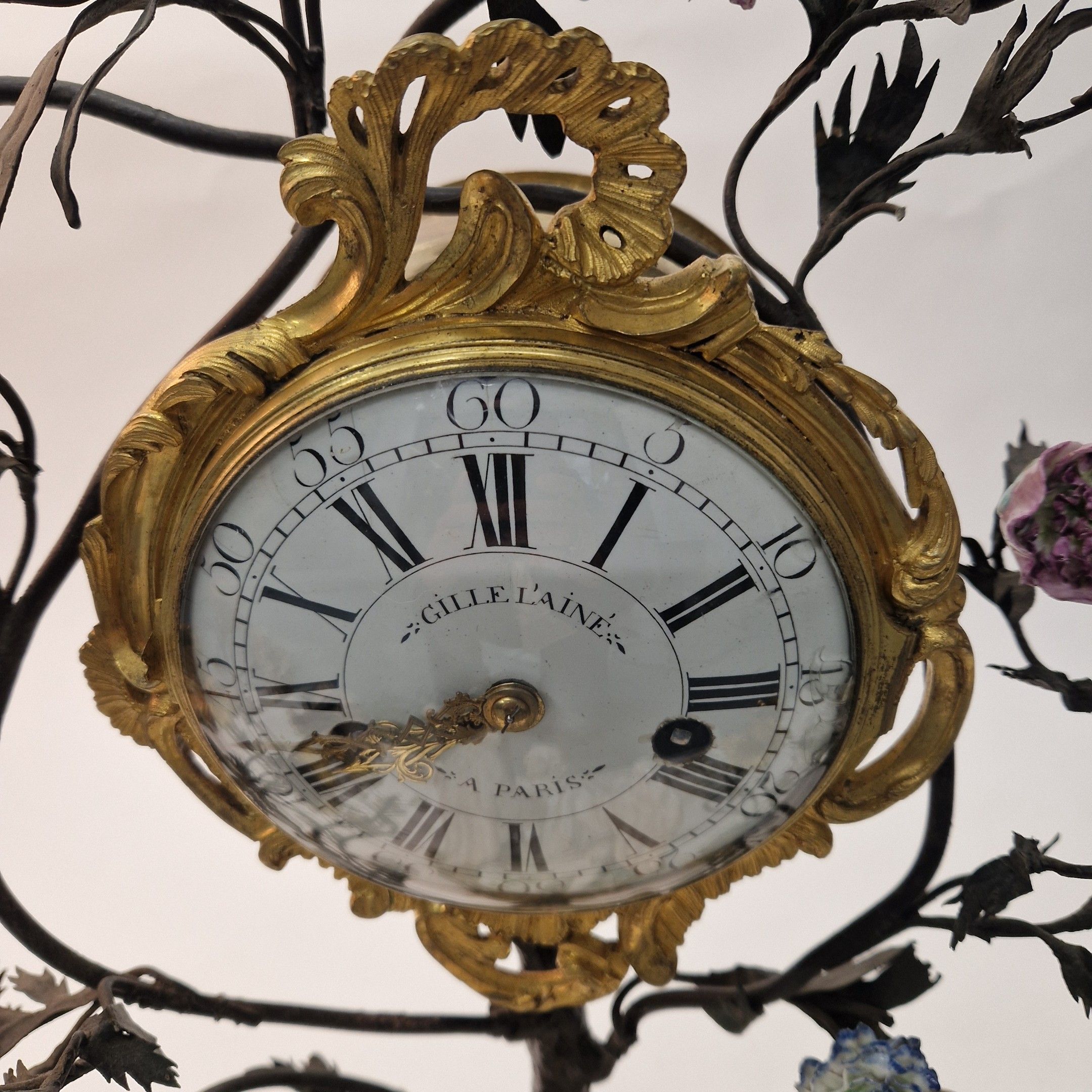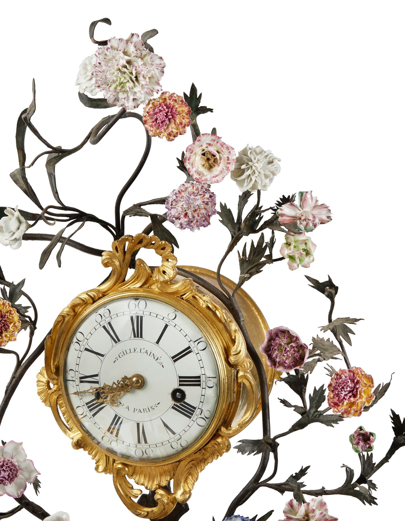 Base rocaille feuillagée en bronze ciselé et doré d’où émergent des branchages en tôle patiné et des fleurs en porcelaine polychrome. Le cadran émaillé blanc signé « GILLES L’AINE A PARIS » dans une lunette en bronze doré et ciselé de rinceaux d’acanthes et coquilles.