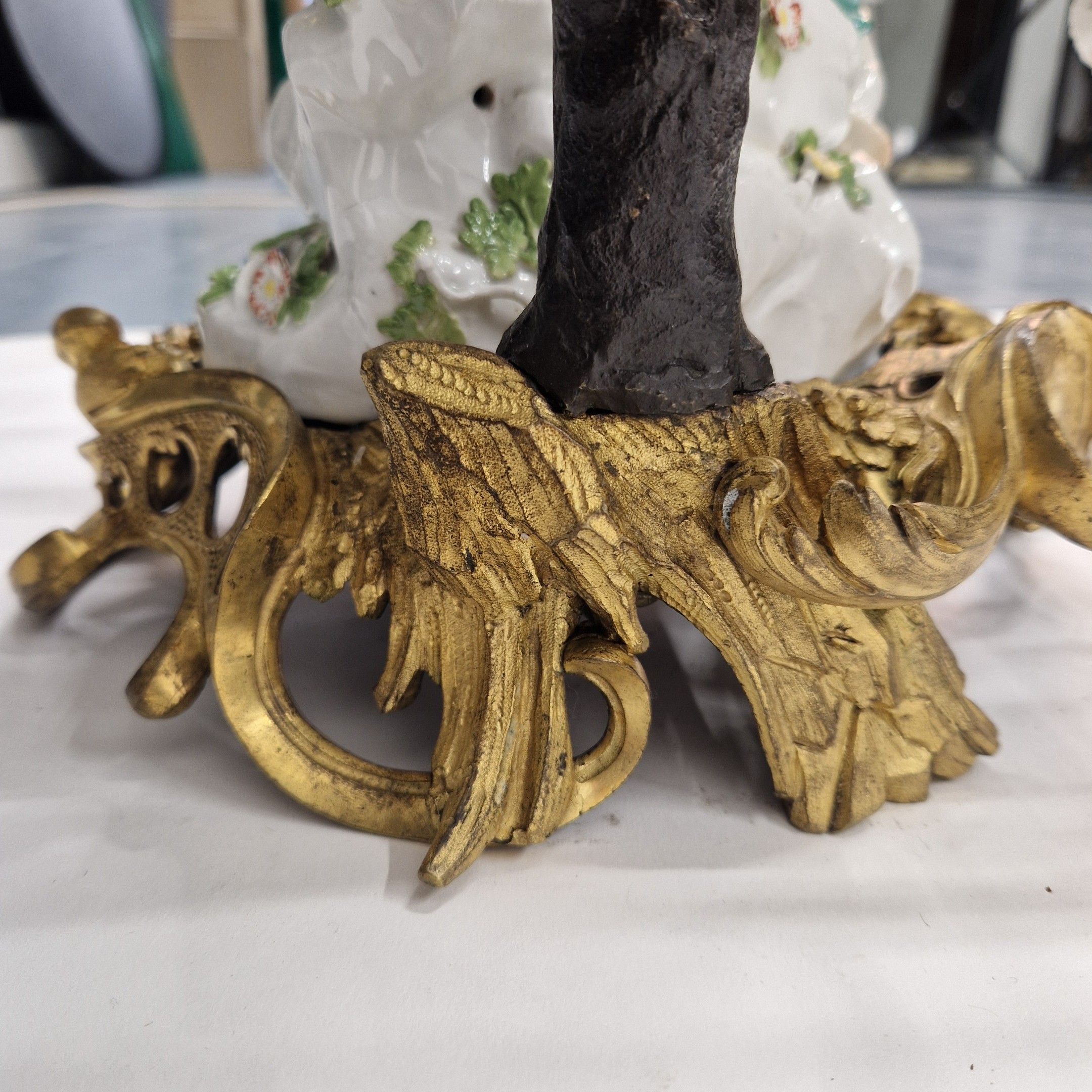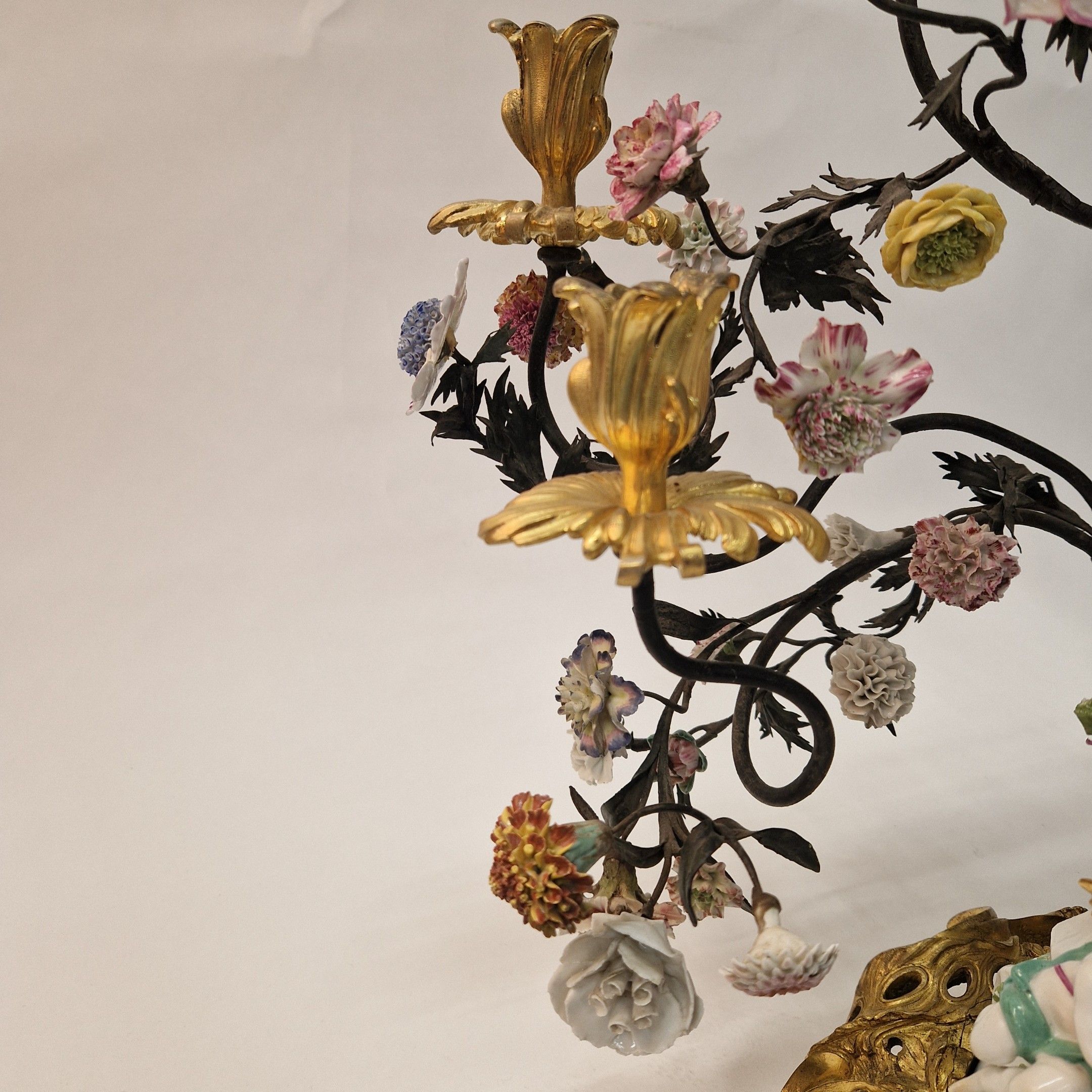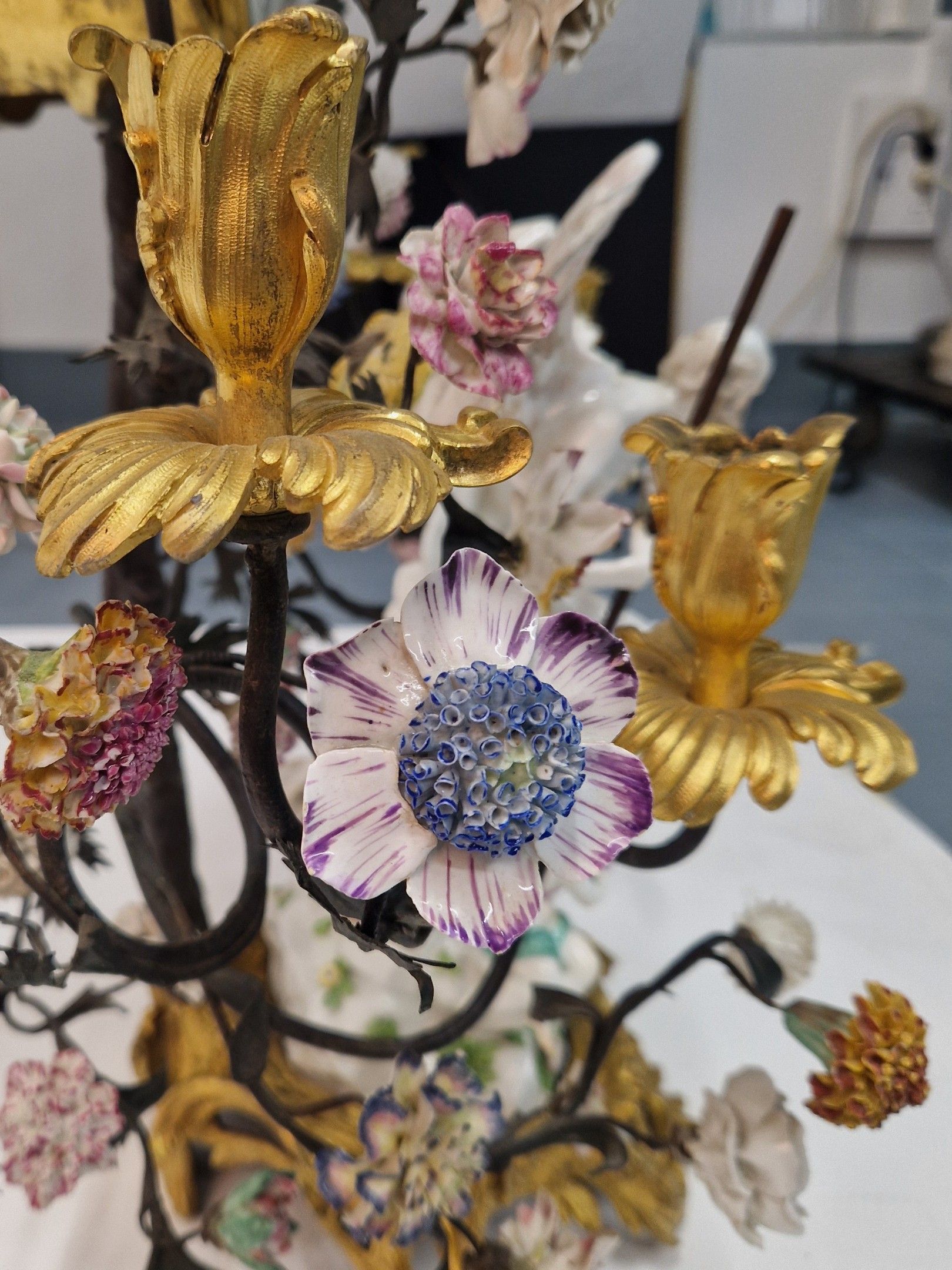 Base rocaille feuillagée en bronze ciselé et doré d’où émergent des branchages en tôle patiné et des fleurs en porcelaine polychrome. Le cadran émaillé blanc signé « GILLES L’AINE A PARIS » dans une lunette en bronze doré et ciselé de rinceaux d’acanthes et coquilles.
