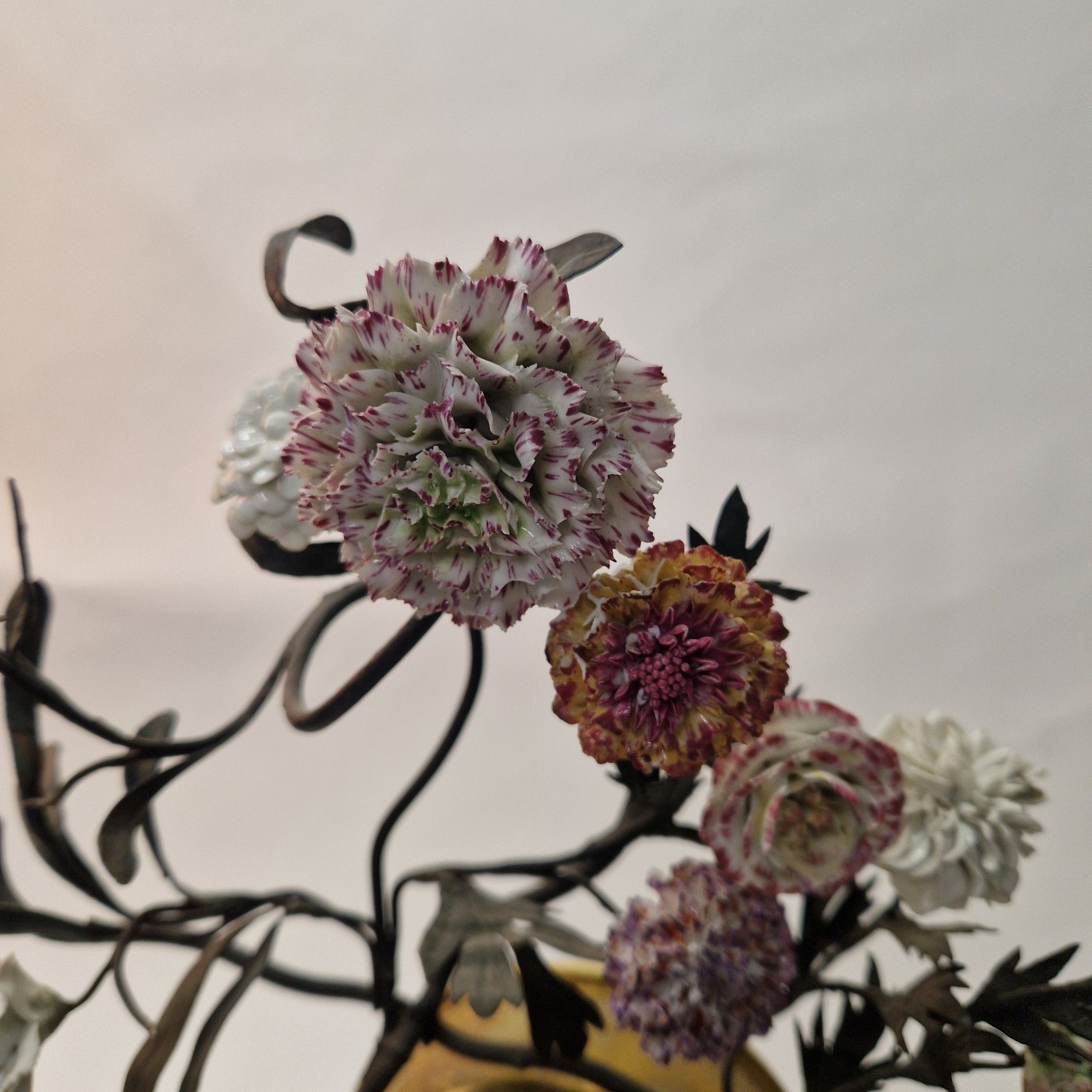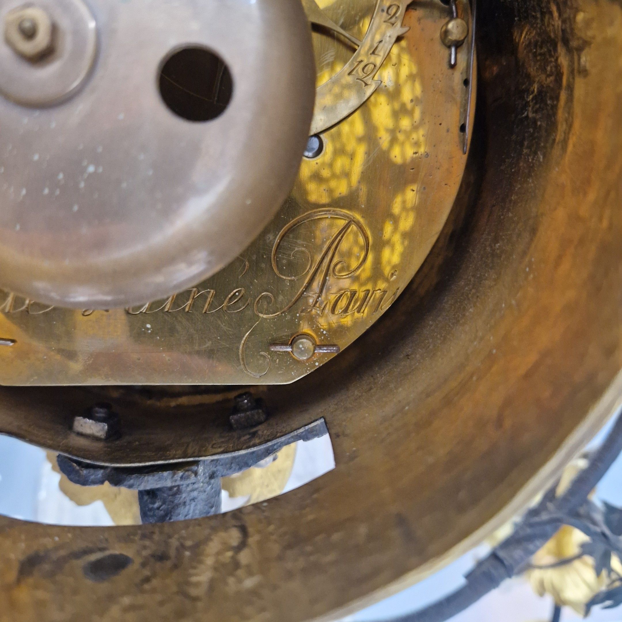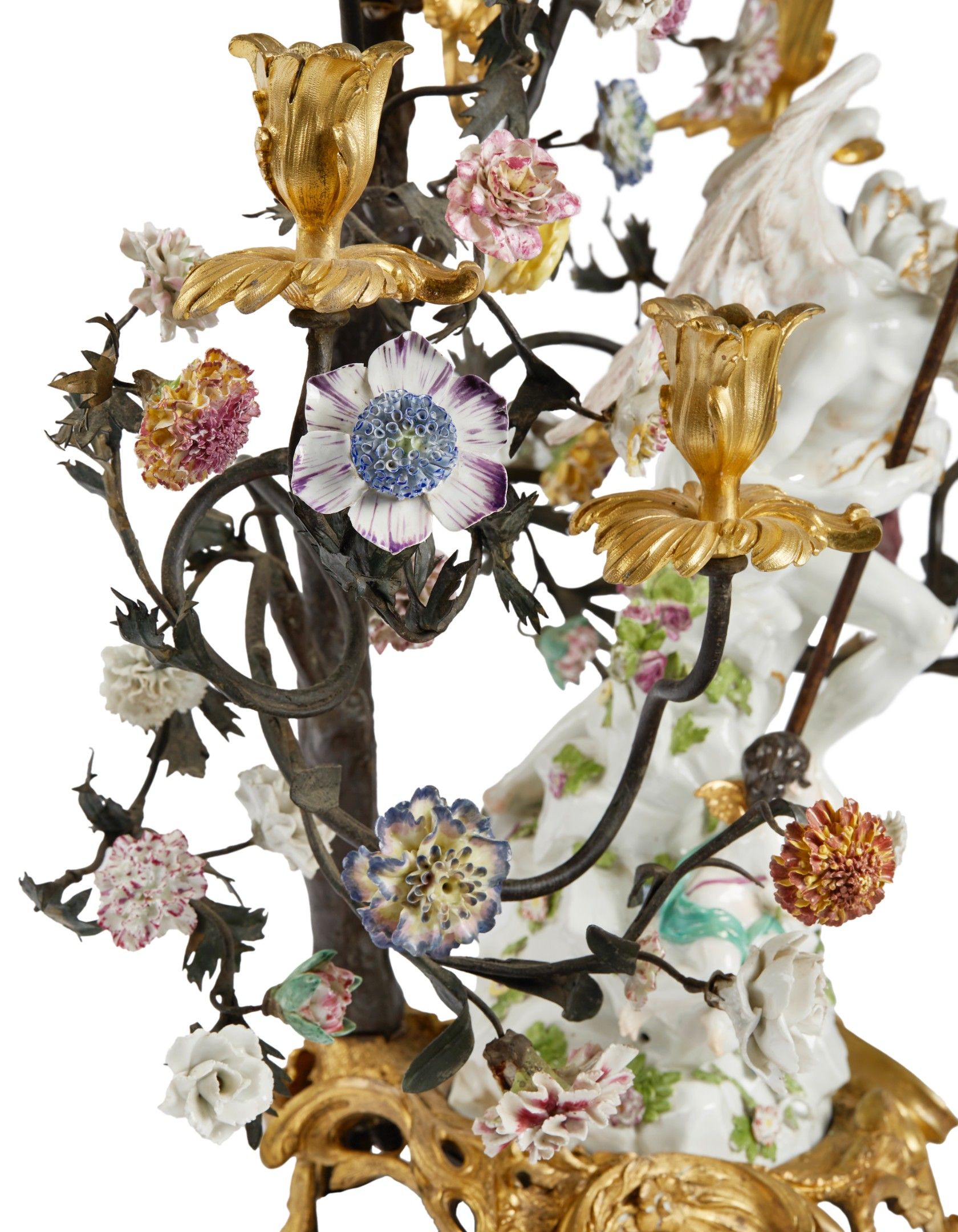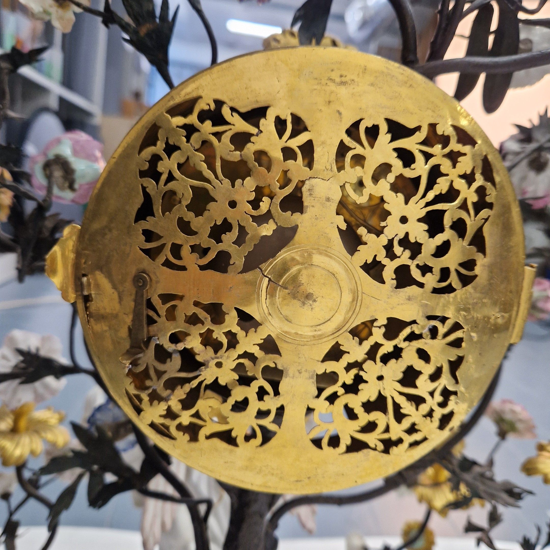 Base rocaille feuillagée en bronze ciselé et doré d’où émergent des branchages en tôle patiné et des fleurs en porcelaine polychrome. Le cadran émaillé blanc signé « GILLES L’AINE A PARIS » dans une lunette en bronze doré et ciselé de rinceaux d’acanthes et coquilles.