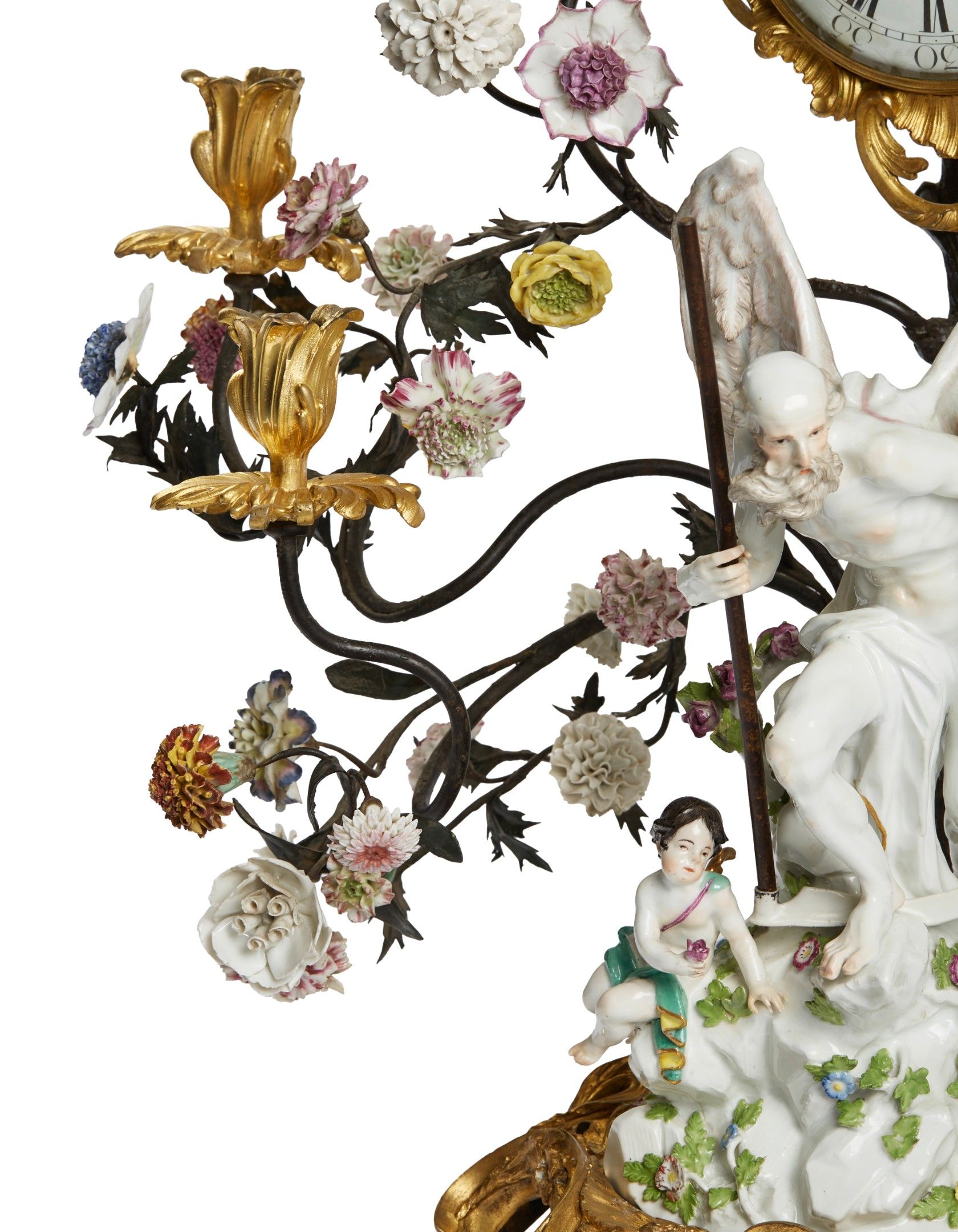 Groupe en porcelaine, notamment de Meissen, d’après un modèle créé par Johann Joachim KANDLER représentant Chronos sur un rocher, un putto à ses pieds, tenant une faux dans sa main droite et un médaillon dans sa main gauche.