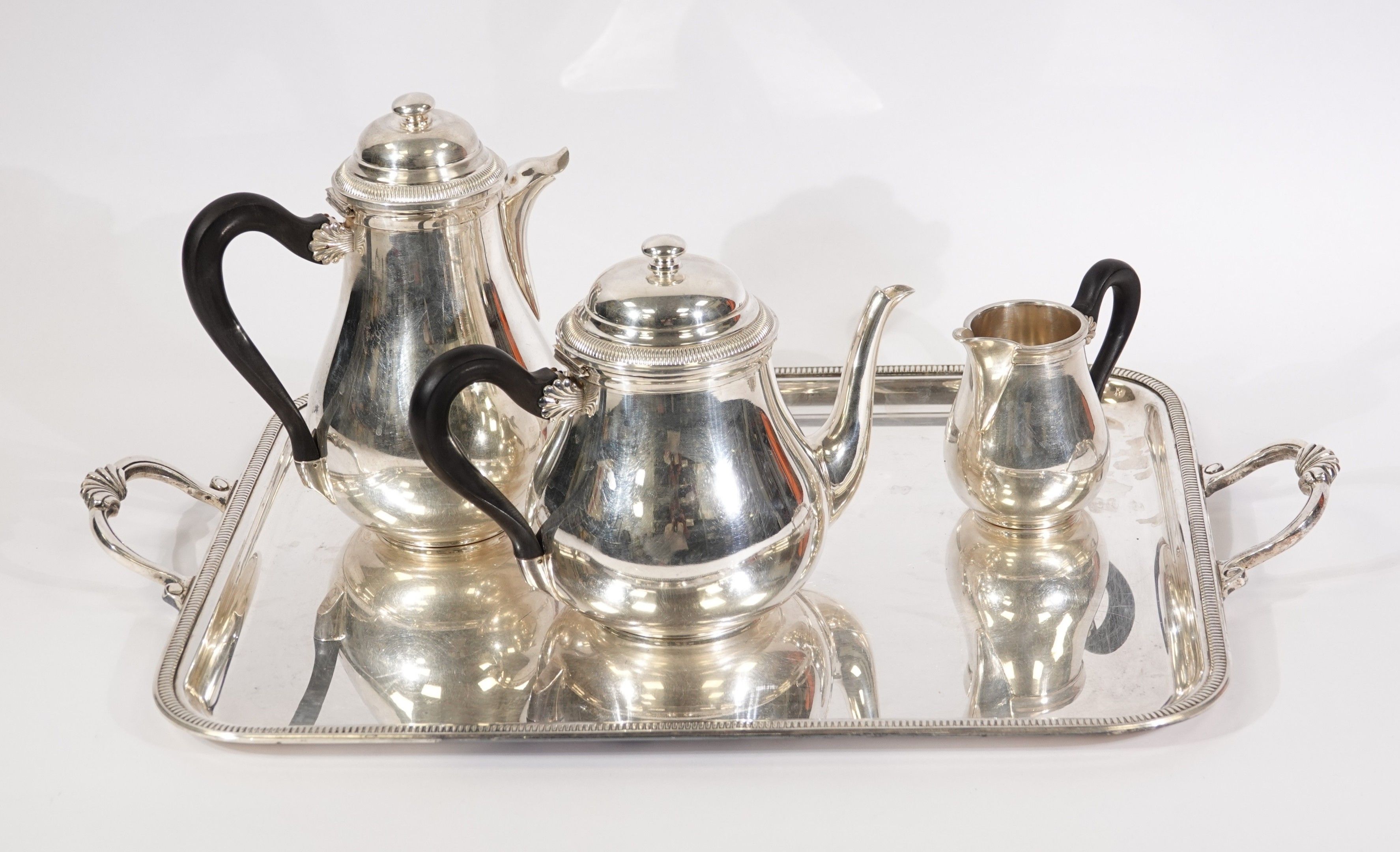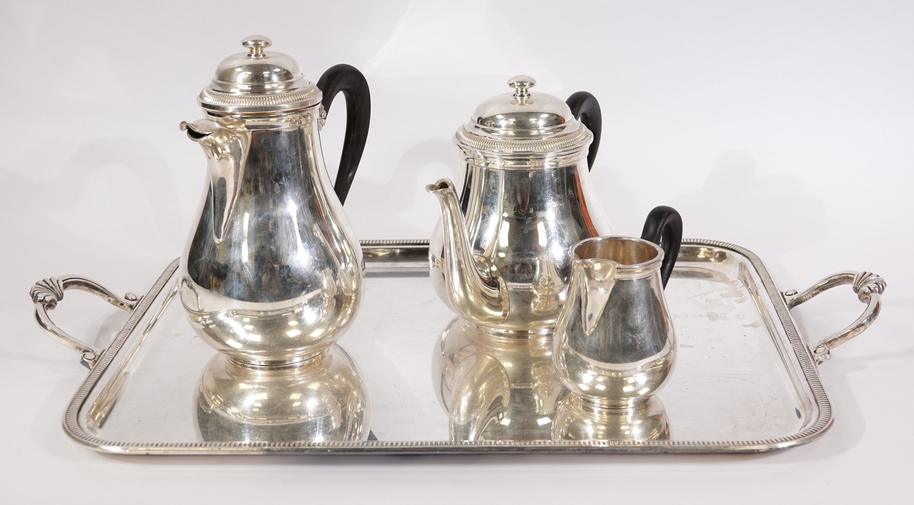 Partie de service à thé et café en métal argenté comprenant un théière, une cafetière, un pot à lait, et un plateau à anses à décor de godrons.