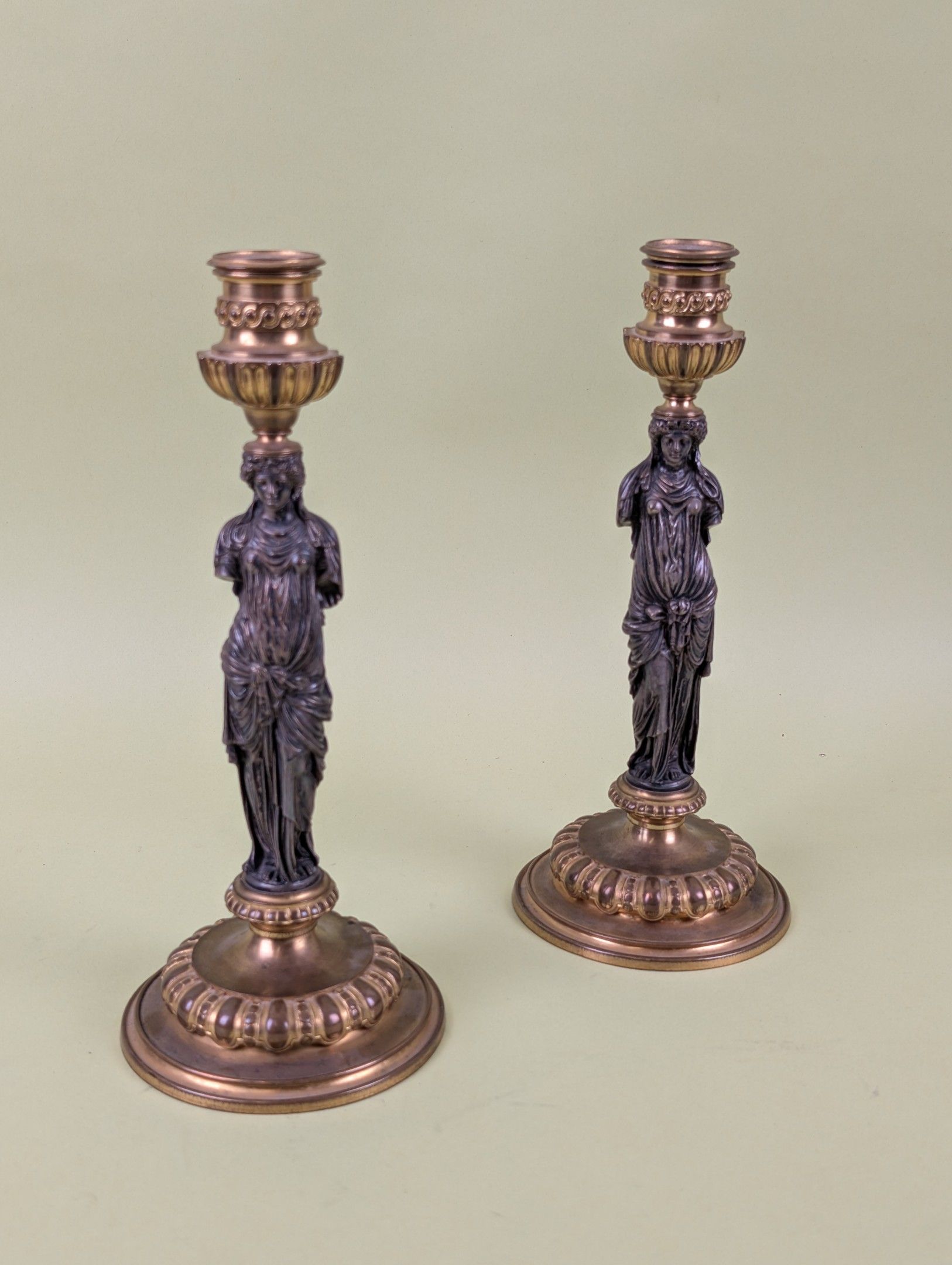 Paire de bougeoirs en bronze doré et argenté, figurant des femmes drapées à l'antique, reposant sur des bases circulaires finement ciselées, ornées d'une frise de godrons.