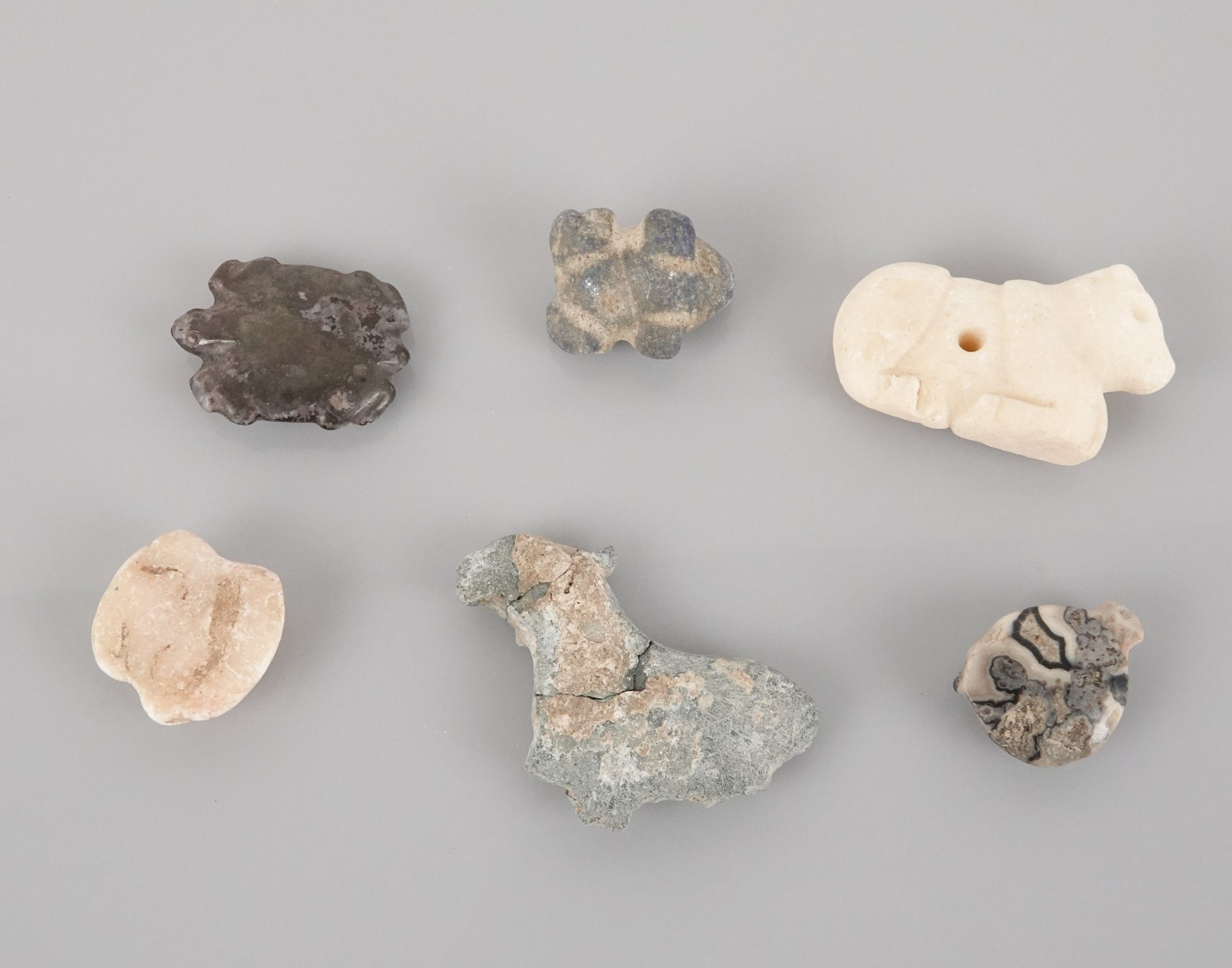 Ensemble de six amulettes de forme animale ou géométrique, tortue, bovidé, grenouille