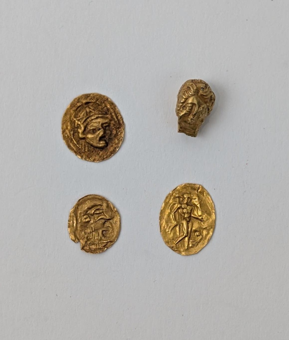 Ensemble de trois pastilles ornées de visage ou personnage en pied, probables éléments de bijoux. On y joint une tête en ronde bosse, fragment de boucles d’oreilles