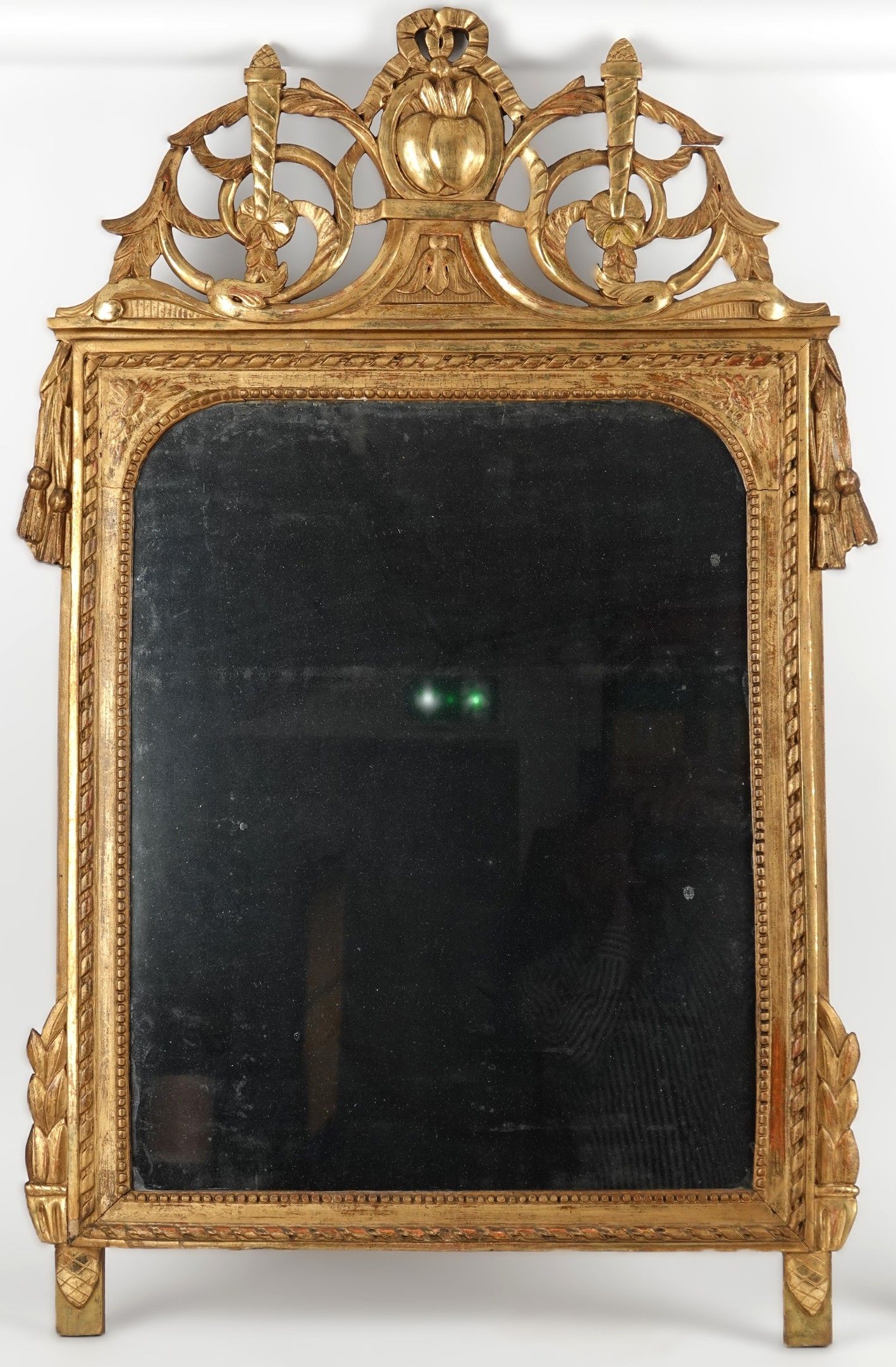 Miroir rectangulaire en bois et stuc doré, le fronton ajouré à entrelacs et volutes.