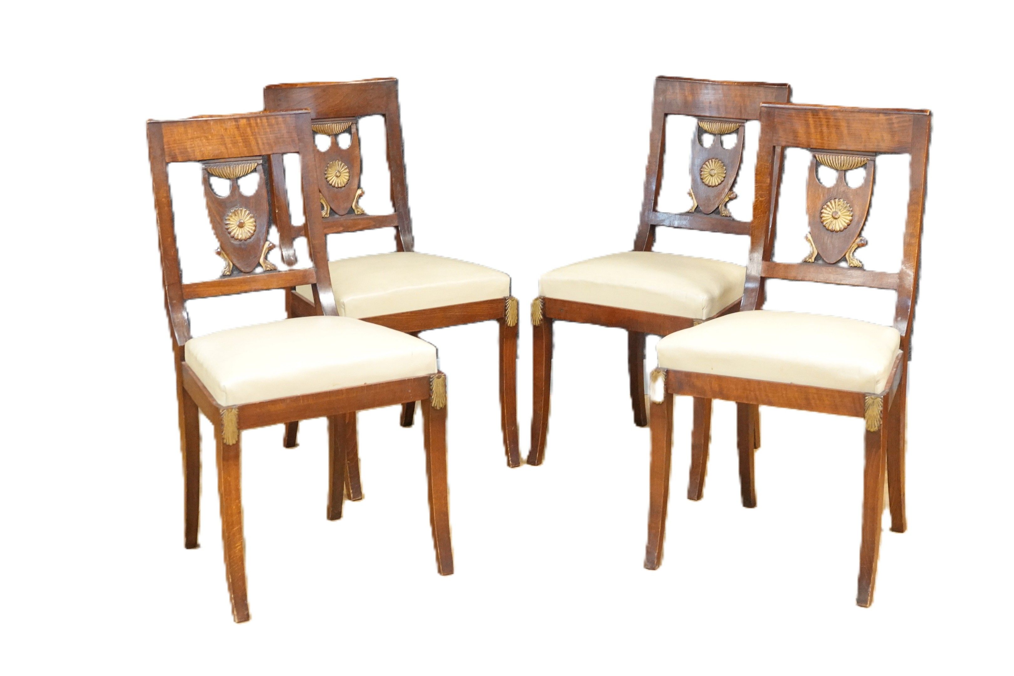 Ensemble de quatre chaises en bois naturel mouluré et sculpté, le dossier ajouré à décor d'un écusson, les quatre pieds en sabre.