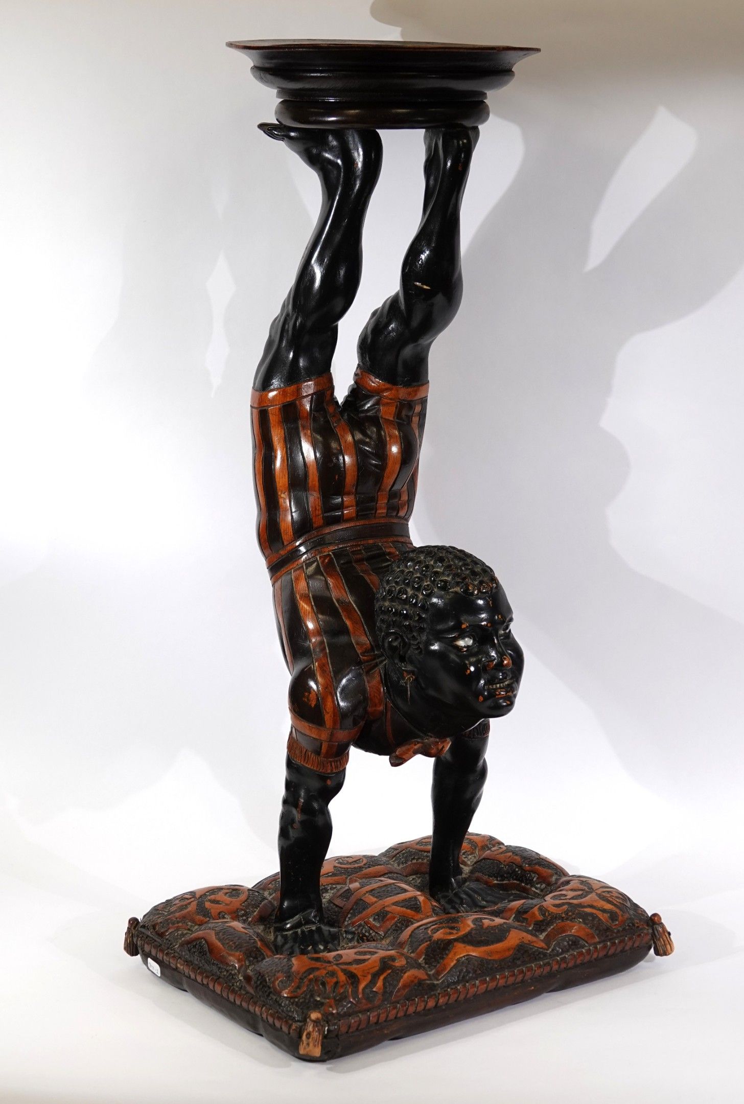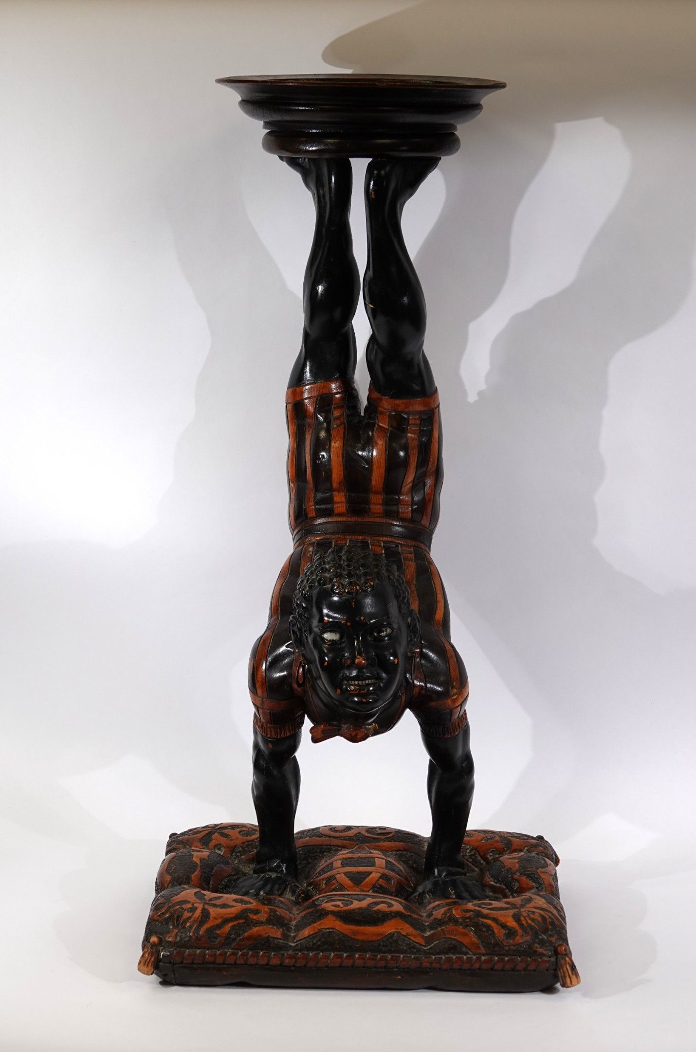 Selette circulaire en bois sculpté, le piètement en forme de nubien acrobate.