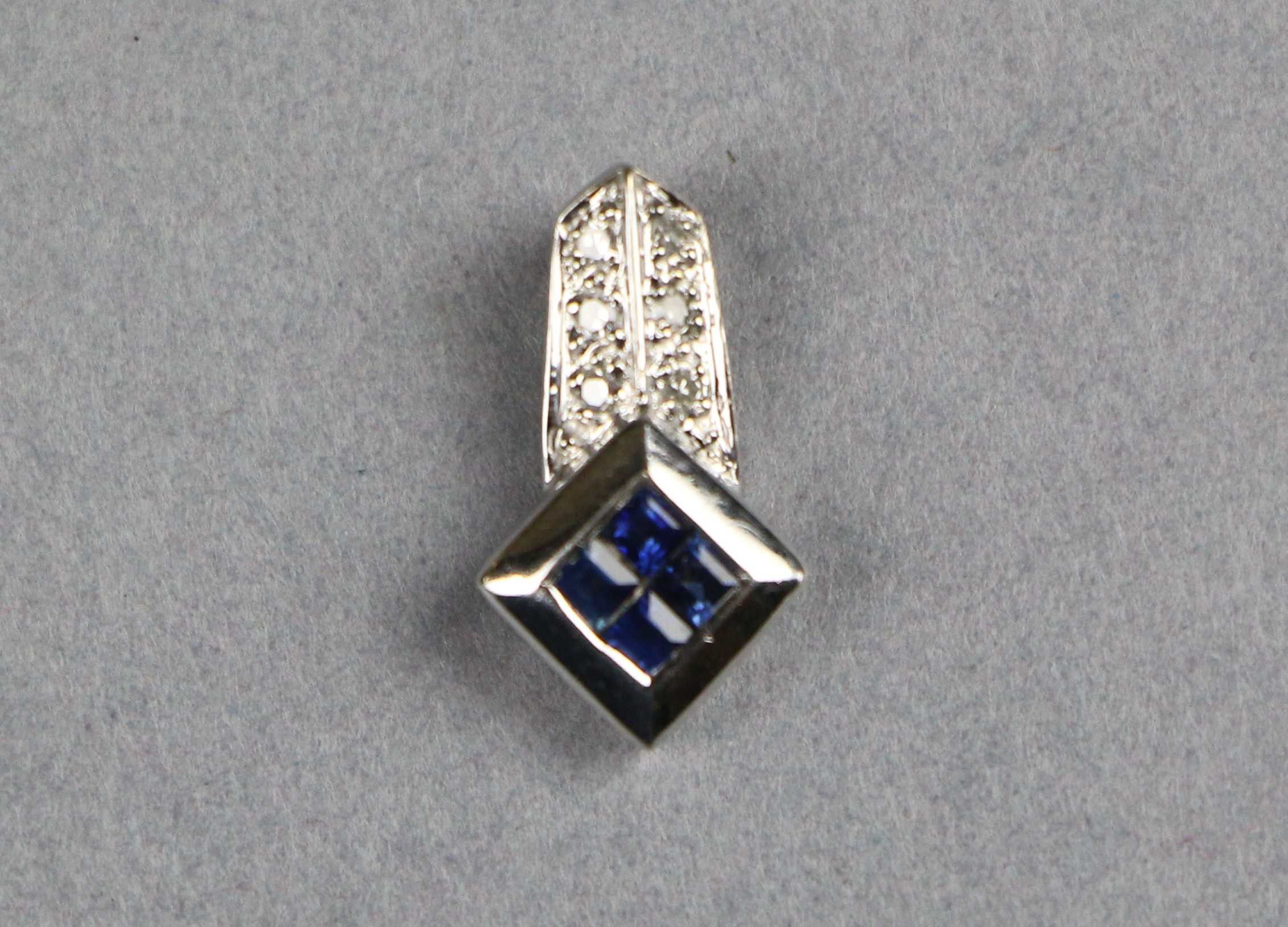 PENDENTIF en or gris 750 millièmes orné de quatre saphirs et petits brillants. Dispensé. Poids brut : 1,44 g