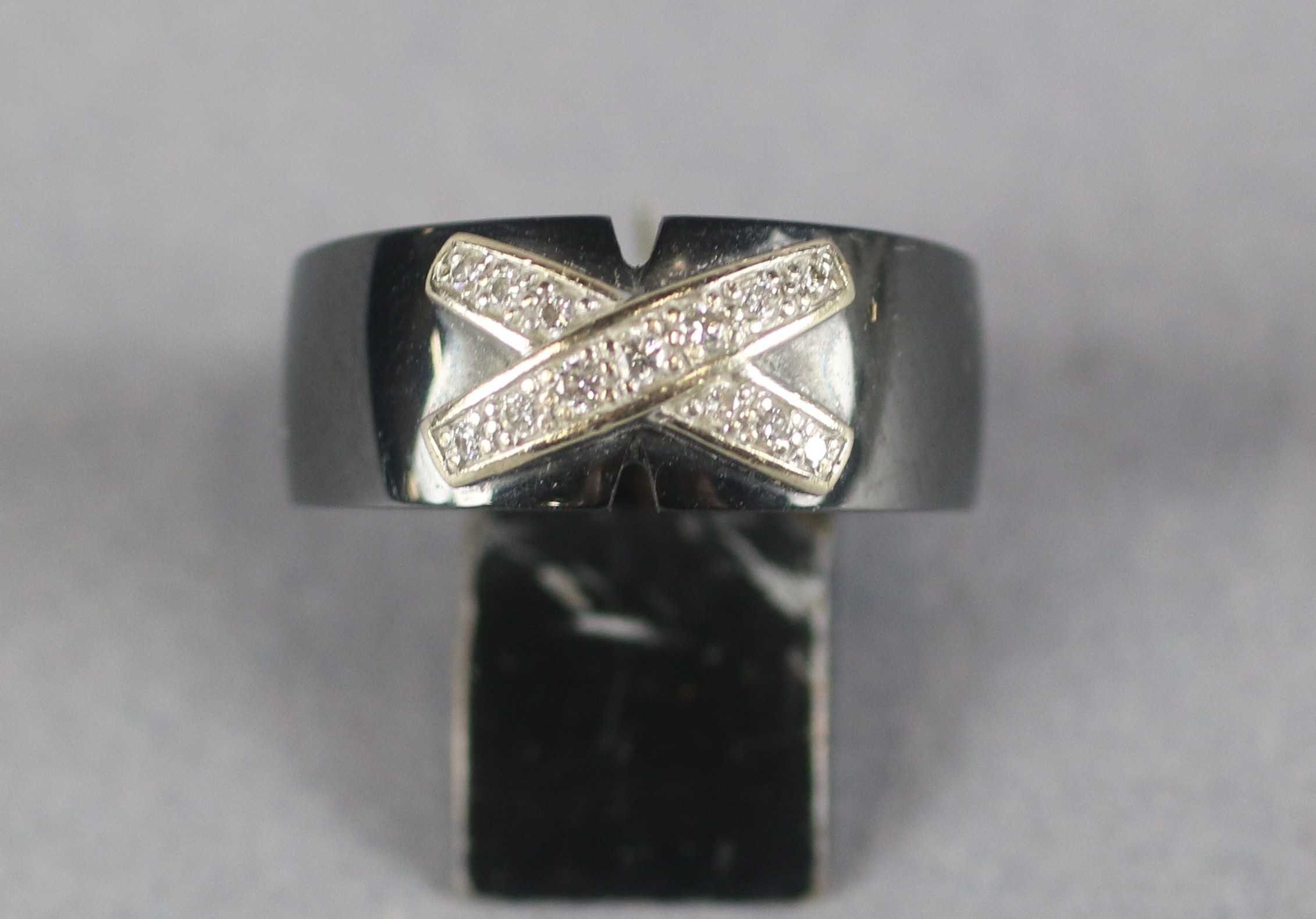 BAGUE en céramique à décor d'une croix sertie de petits diamants en or gris 750 millièmes dans le style du modèle Liens croisés de Chaumet.