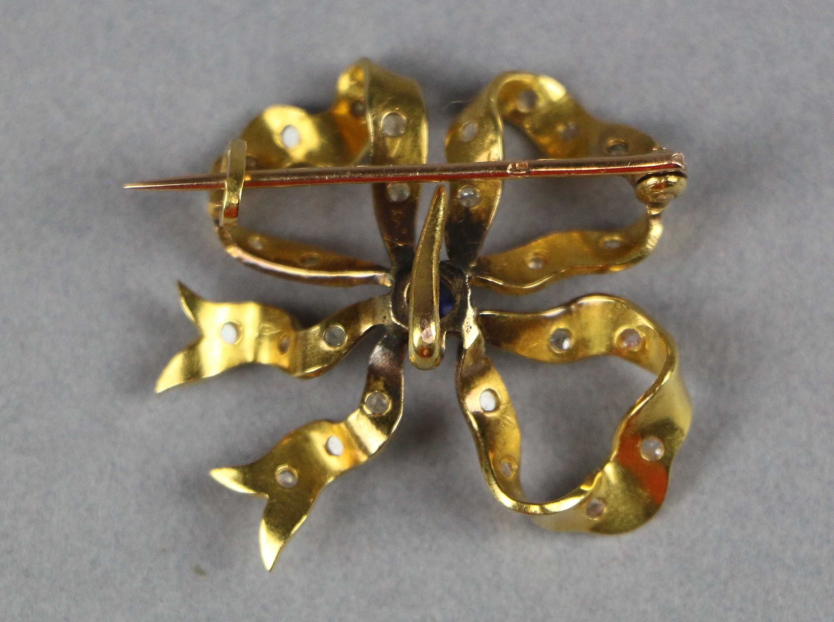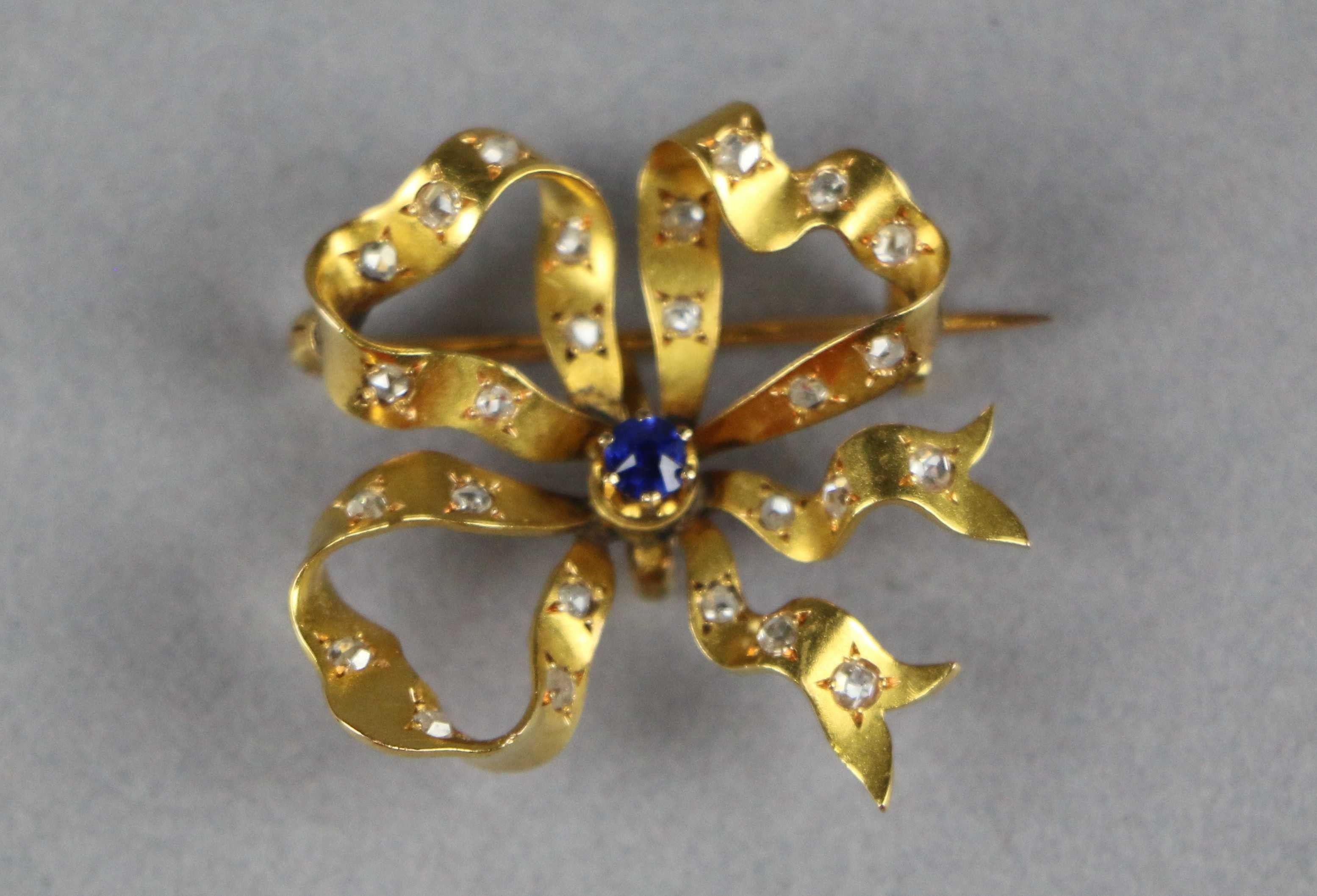 BROCHE en or jaune 750 millièmes en forme de noeud de ruban sertie en son centre d'une pierre bleue et de petits diamants en rose. Poinçon tête de cheval.