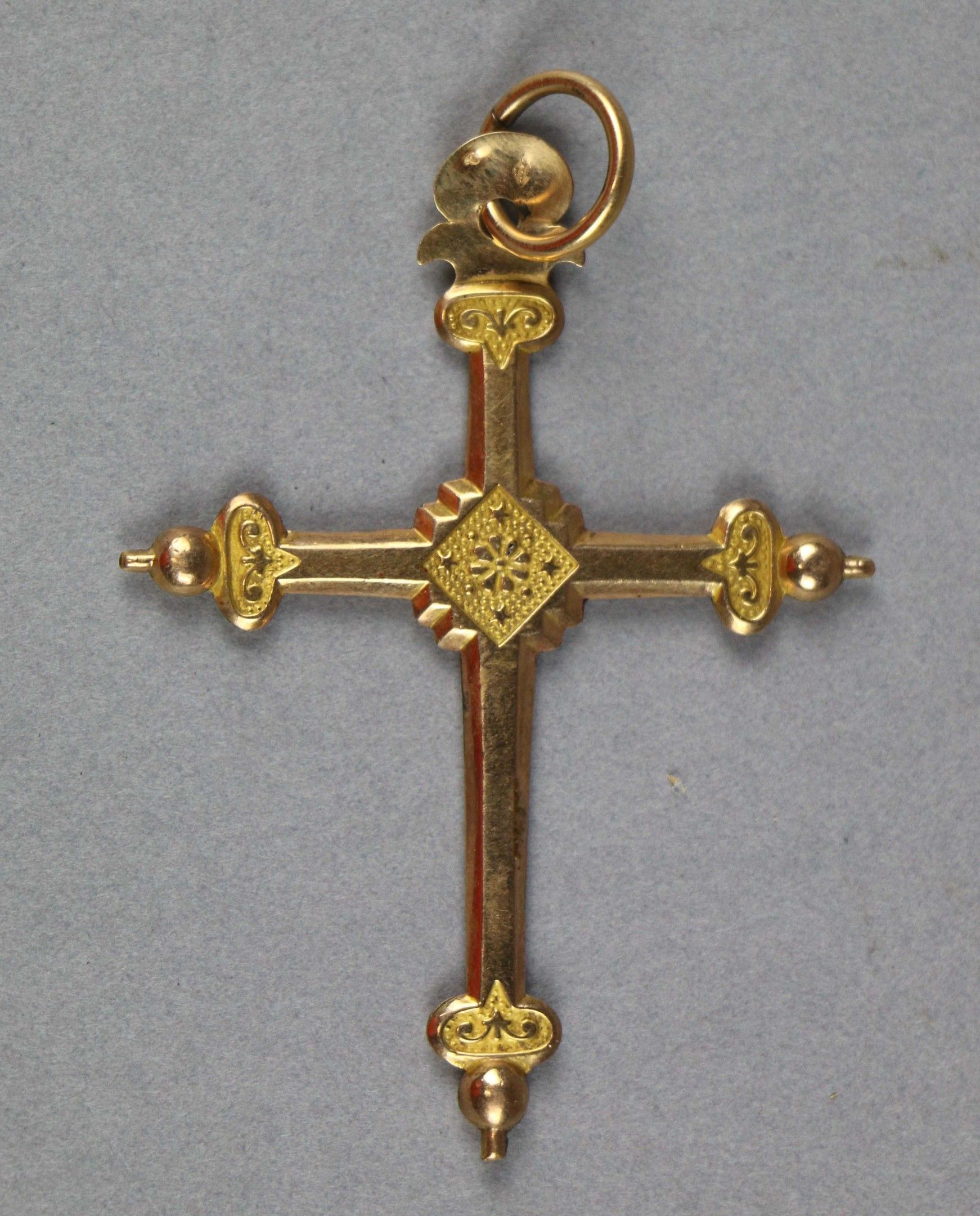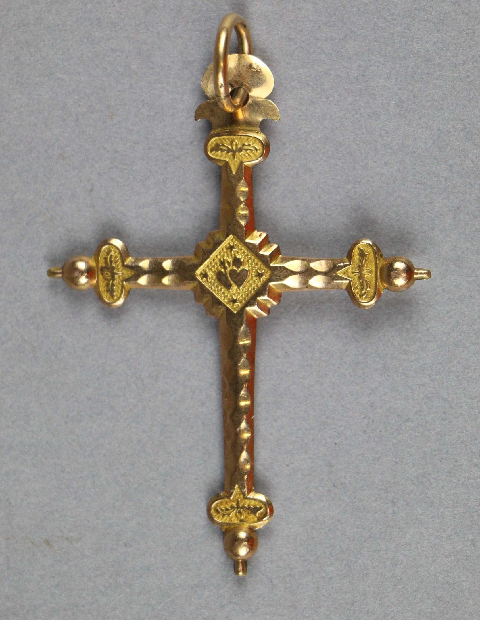 CROIX régionale en or jaune 750 millièmes à décor de coeurs et motifs végétaux stylisés. Poinçon de petite garantie, Paris, 1819-1838.