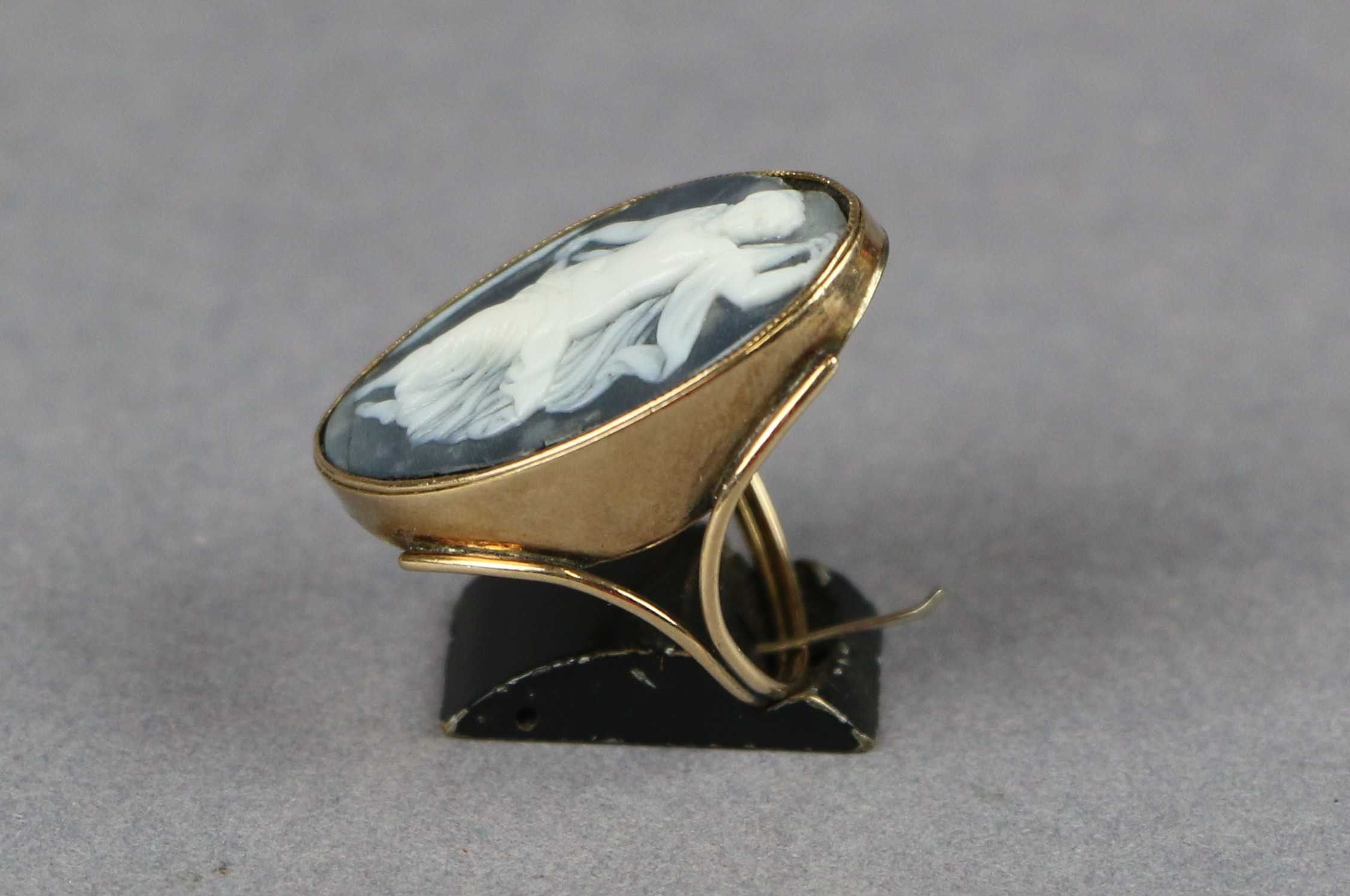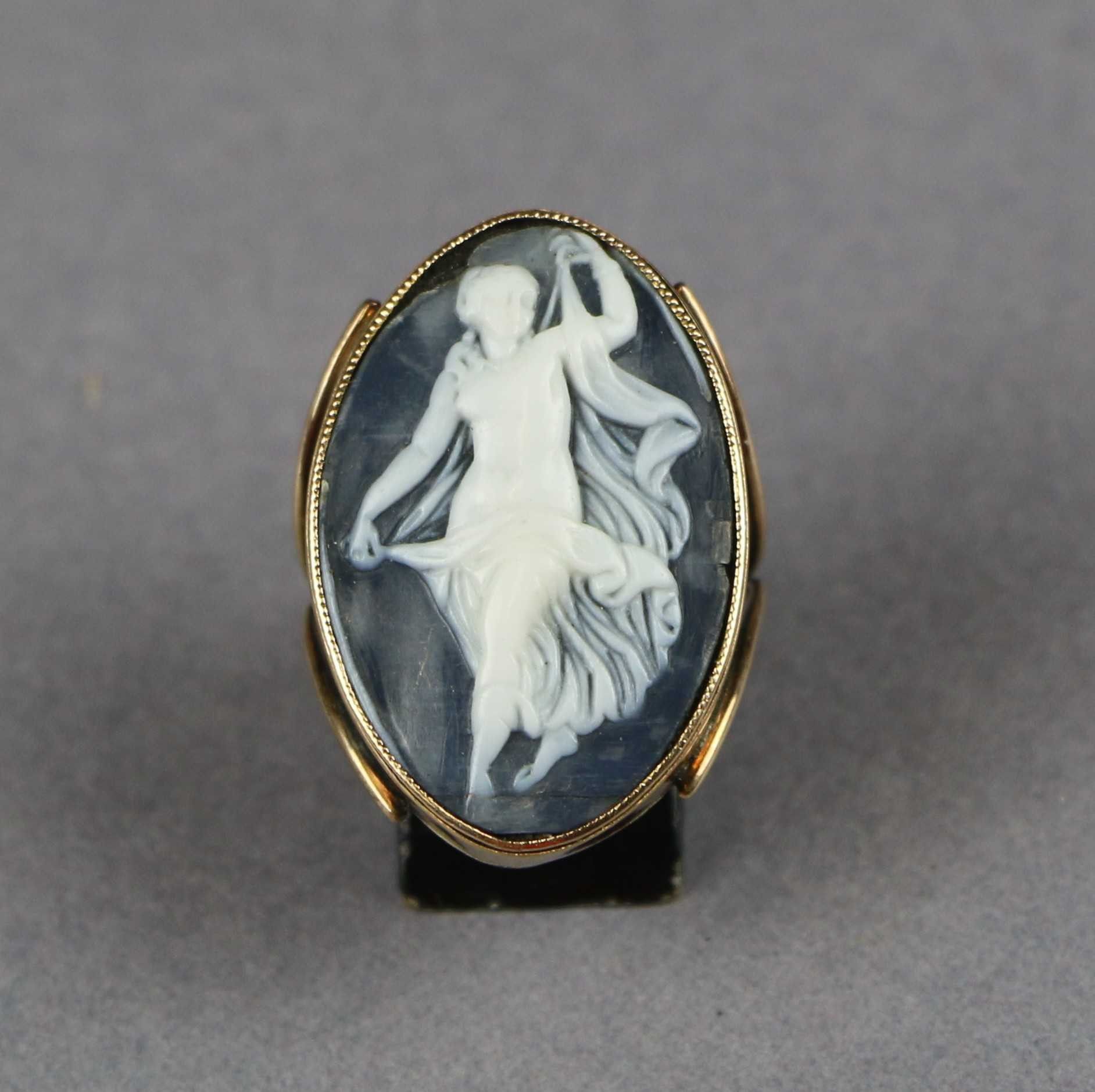BAGUE en or jaune 750 millièmes ornée d'un camée à décor d'une jeune femme dansant à la toge. Dispensée.
