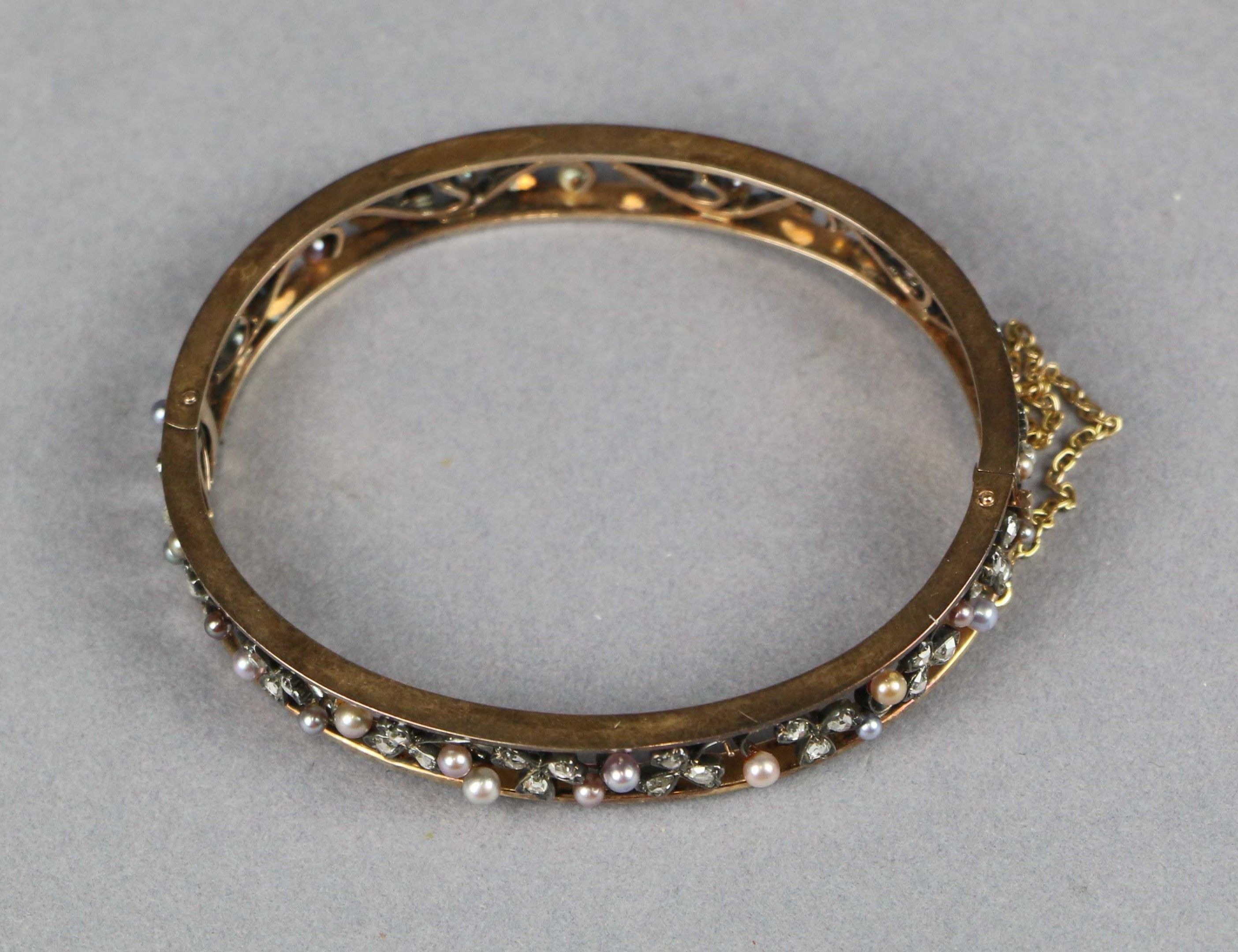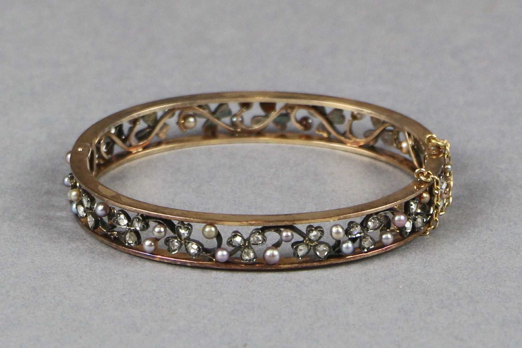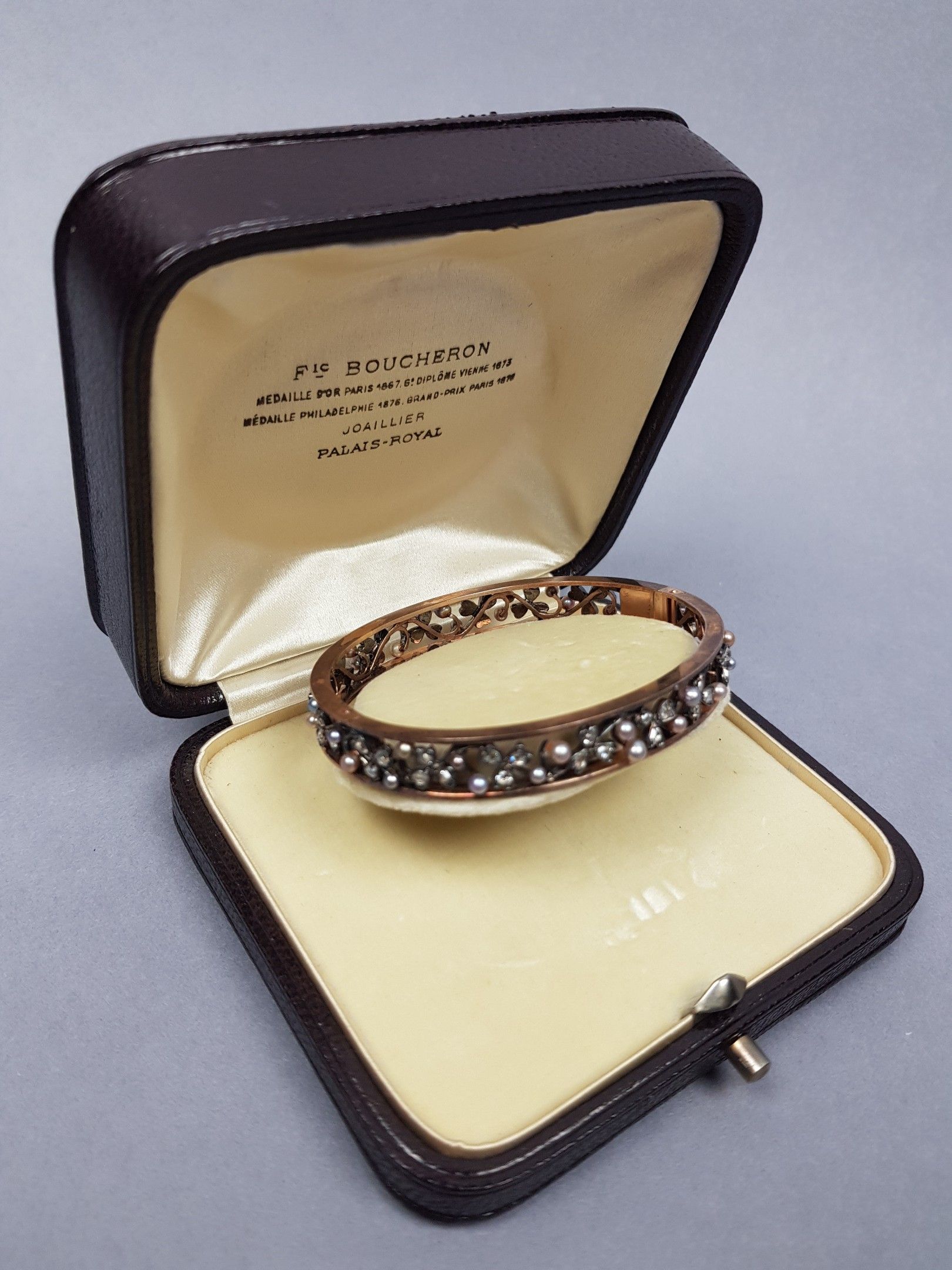 BRACELET semi-rigide en or jaune 750 millièmes à décor de tige fleurie ornée de perles et petits diamants. Poinçon tête d'aigle. Pois brut : 24,34 g Dans un écrin de la maison Boucheron, joailler au Palais Royal.