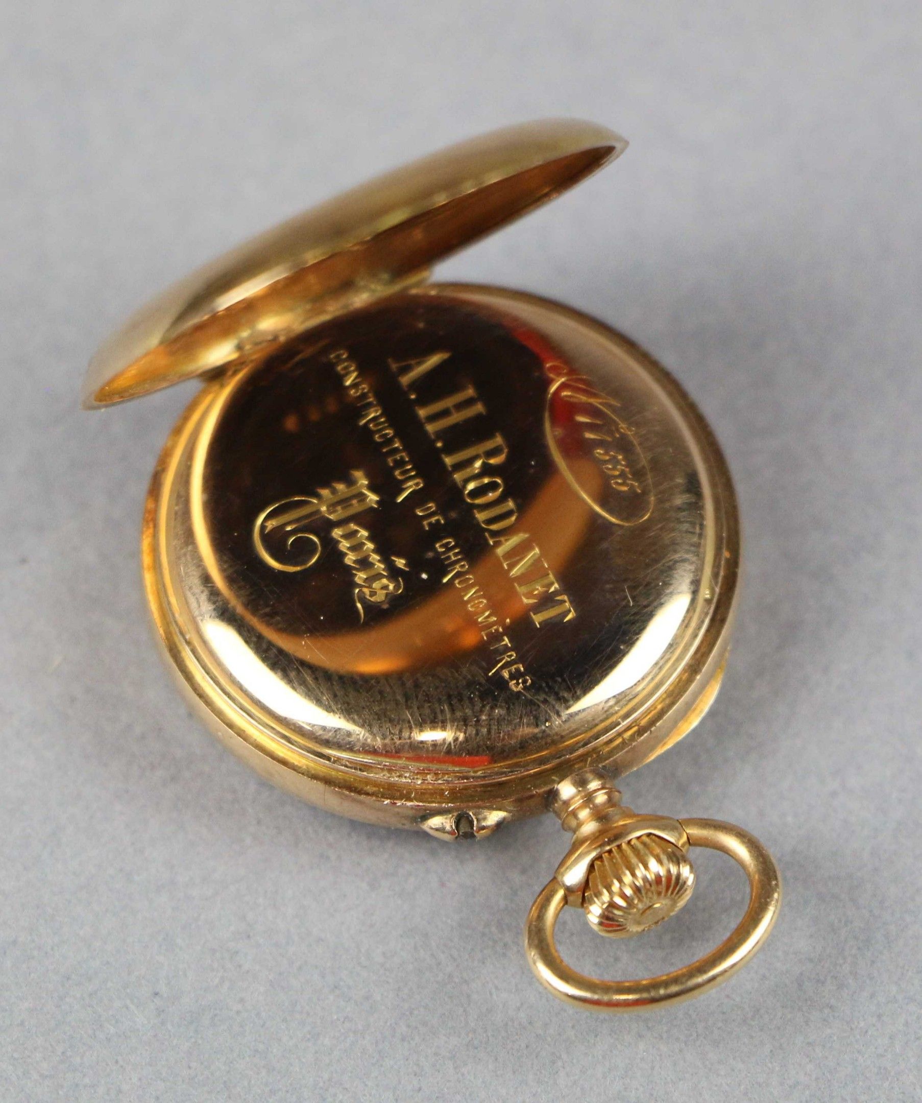 MONTRE de col à boîtier et contre-cuvette en or jaune 750 millièmes à dos gravé d'un monogramme feuillagé et cadran émaillé blanc à indication des heures en chiffres romains marqué de la maison A.H. Rodanet. Poinçon tête de cheval. Poids brut : 25,5 g Dans son écrin de la maison.