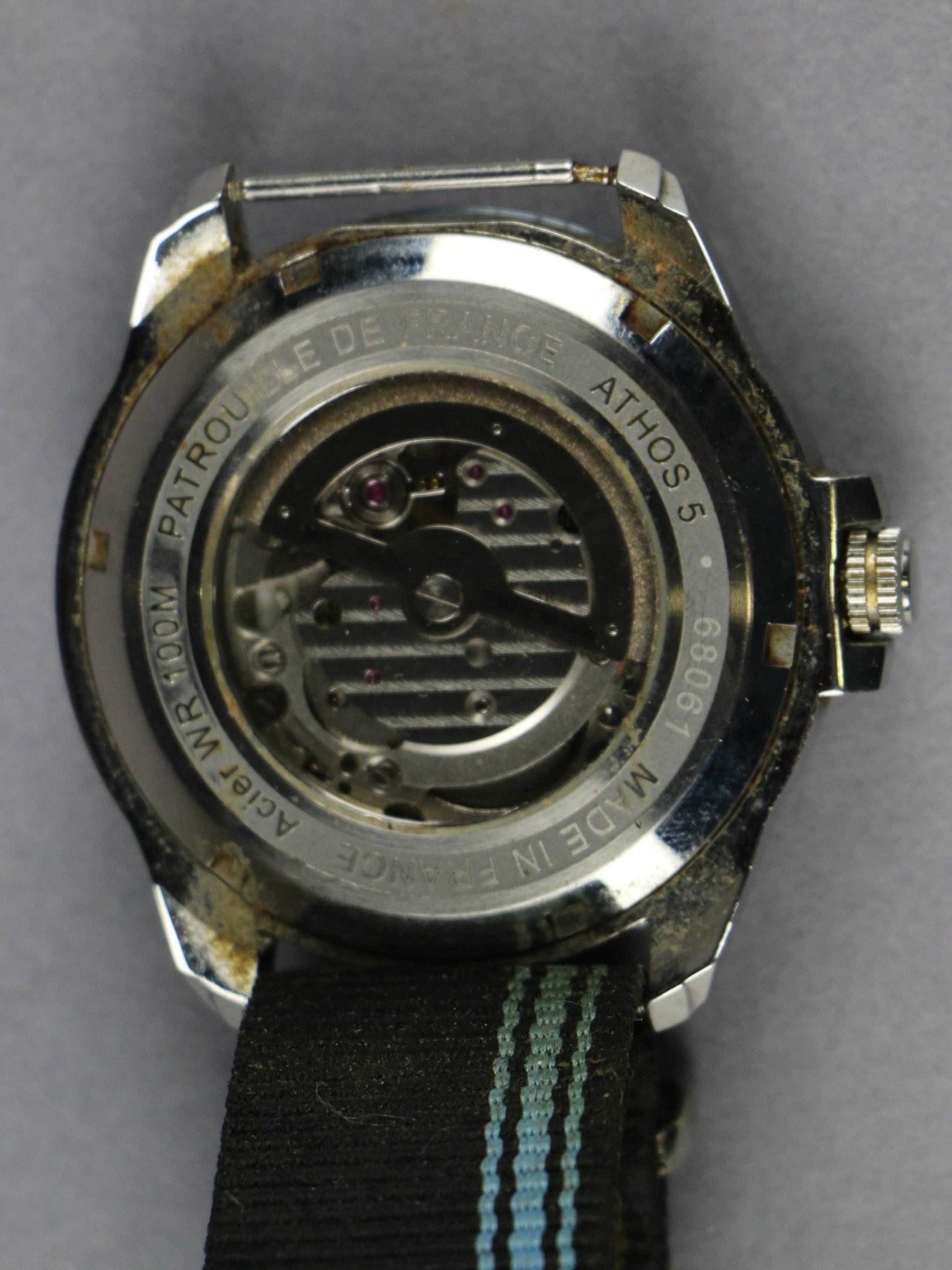 PATROUILLE de FRANCE : MONTRE d'homme modèle Athos 5 100m water resistant à boîtier acier. Mouvement automatique avec fond transparent apparemment fonctionnel. Boîtier de 43 mm. Bracelet tissu rapporté.