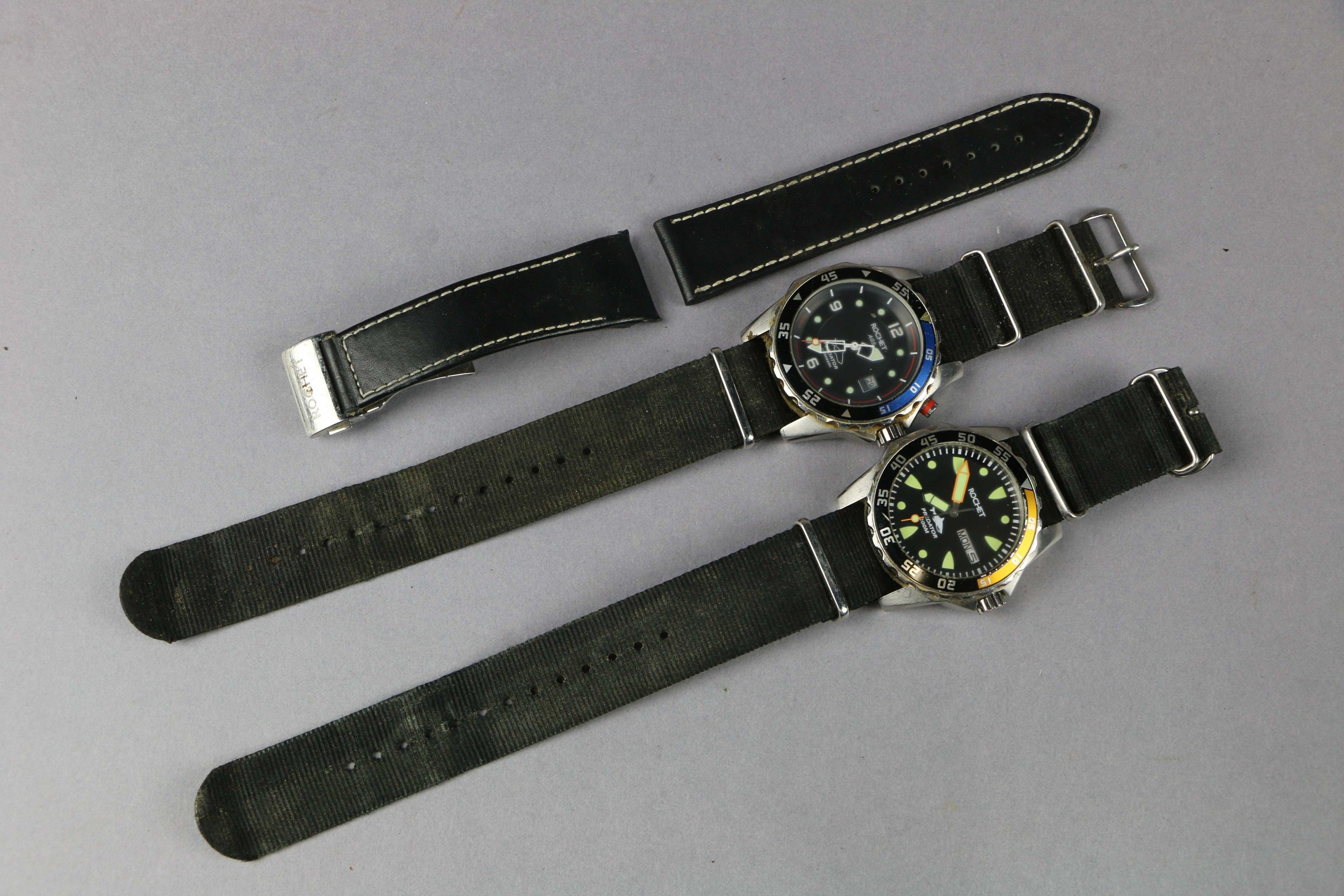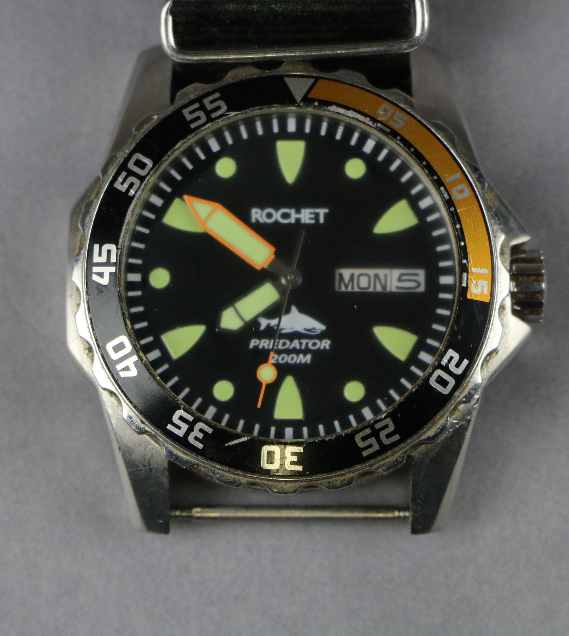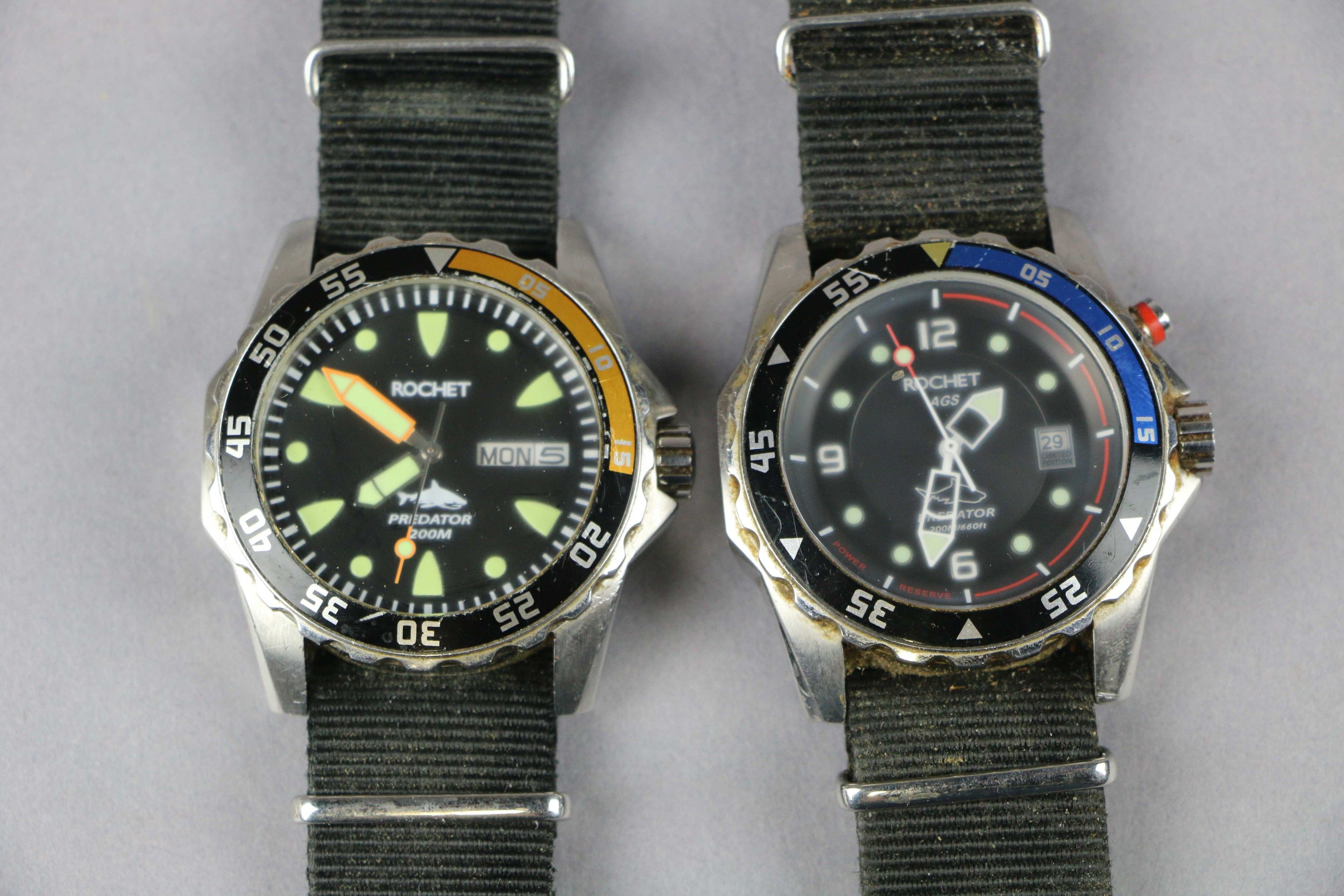ROCHET : deux MONTRES de plongée modèle Predator 200m à mouvements quartz non fonctionnel (piles à changer). Boîtiers de 43 mm. Avec bracelets tissu rapportés et bracelet cuir rapporté.